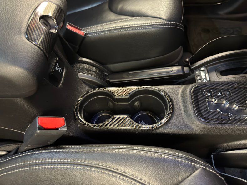 Let's start in the way back where Creative Car Tunes has custom fits speakers and subwoofers, emulating the front face of a Jeep while doing so. Up front, the door panels appear stock with the exception of some carbon fiber trim on the black plastic. The leather bucket seats are robust up front and dressed up with some white stitching and embroidered SAHARA on the seat backs, while the rear bench presents cleanly with the same stitching, allowing passengers to view the headrest screens in front of them in comfort. For the driver, the thick steering wheel frames gauges with patriotic backing in a clean and show worthy presentation that includes the Gadsden rattlesnake. A big screen in the center houses the entertainment system that includes AM/FM radio with CD, Bluetooth, Navigation, and a backup camera. Below it, meaty components include switchgear, vents, and the standard A/C panel. More carbon fiber trim adorns the shifter and cupholder in the center console and clean black carpet is protected by tire track weather mats. Lots of extra hand holds are mounted near the ceiling which is covered with clean black cloth panels.