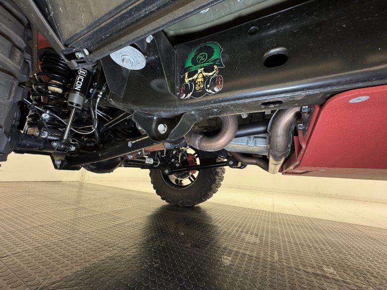 A painted Poison Spyder differential cover highlights the clean interior where even the exhaust tips are decorated with Metal Mulisha red images. Red skid plates also dress up the show worthy underside where 4 link with coil springs make up the suspension at both ends. The dual exhaust utilizes original mufflers before exiting through tips large enough to be proportional with the rest of the exterior.
