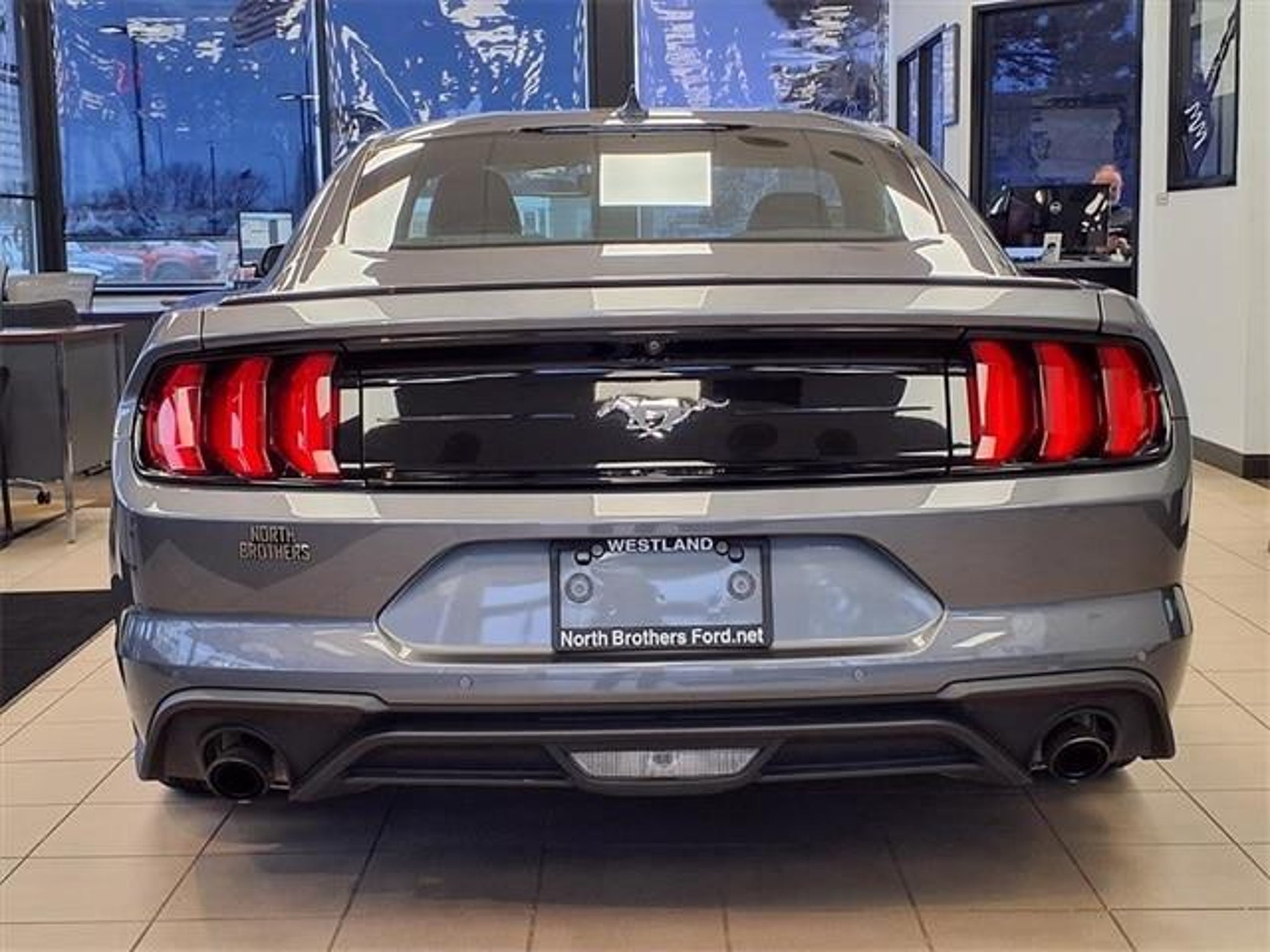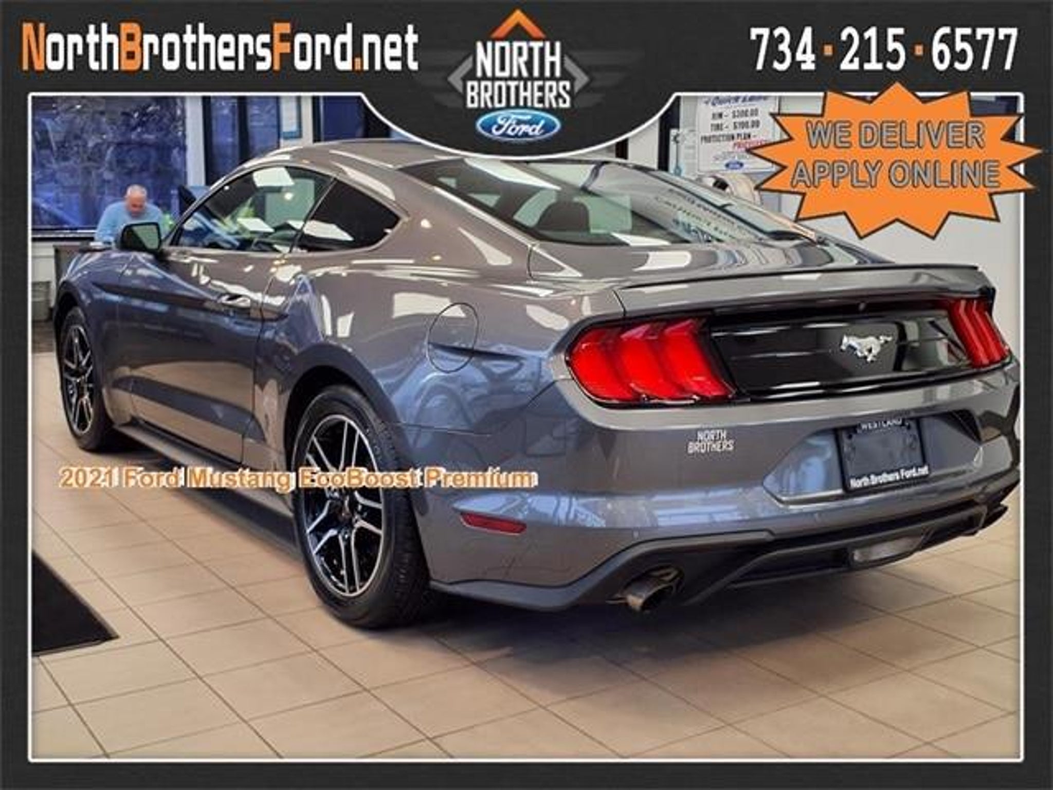 CARFAX One-Owner. Gray 2021 Ford Mustang EcoBoost Premium 2D Coupe RWD EcoBoost 2.3L I4 GTDi DOHC Turbocharged VCT 10-Speed Automatic Complimentary local home delivery available. Call our sales department now at 734-421-1300 to find out about finance options, trade-in value and touchless home delivery! 21/32 City/Highway MPG Odometer is 17468 miles below market average! North Brothers Ford has been serving the Westland community for over 78 years. Every vehicle receives a 169 point inspection and is backed by a 3 day/300 mile exchange policy. See dealer for details. Call us today at 734-421-1300 or visit us 24/7 at www.northbrothersford.net.
