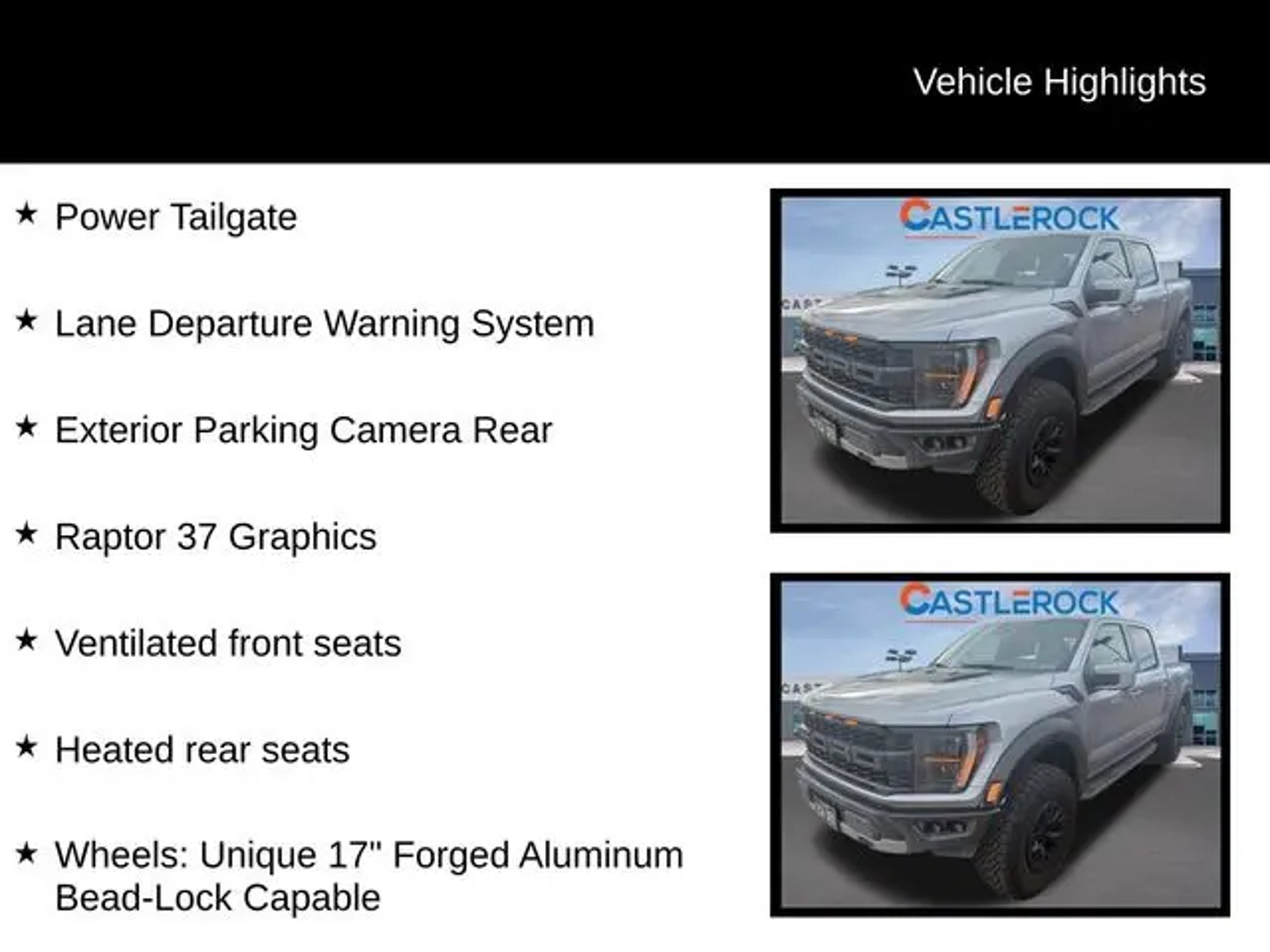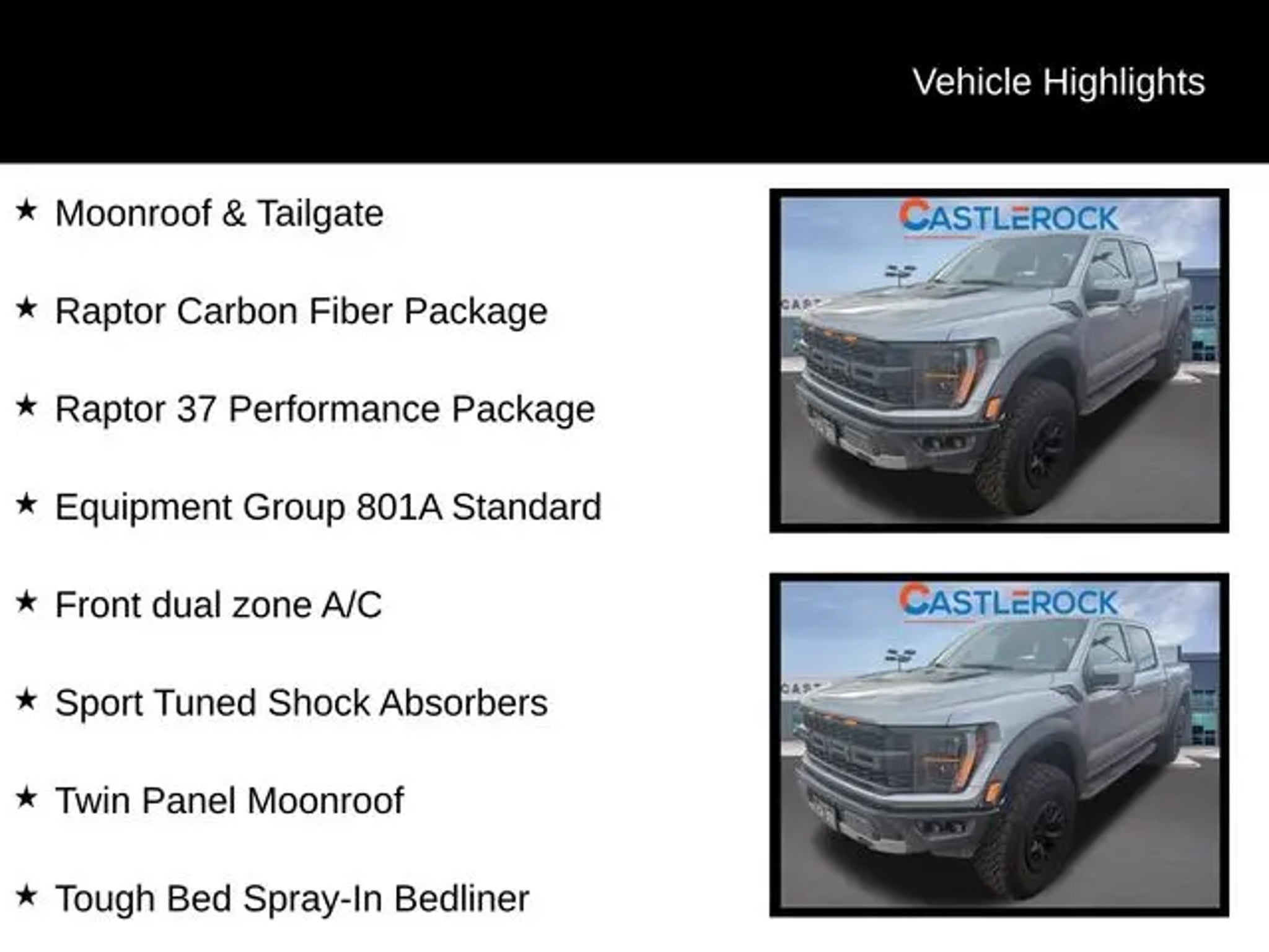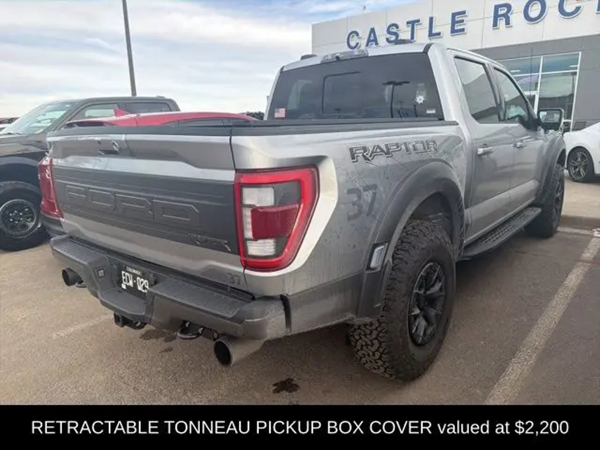 Discover the ultimate off-road experience with the 2023 Ford F-150 Raptor. This exceptional vehicle is engineered to conquer any terrain, blending unparalleled capability with refined comfort and cutting-edge technology. "¢ Raptor 37 Performance Package "¢ Raptor Carbon Fiber Package "¢ Retractable Tonneau Pickup Box Cover "¢ Moonroof & Tailgate "¢ Pro Power Onboard - 2KW "¢ Tough Bed Spray-In Bedliner Powered by a robust 3.5L V6 EcoBoost engine and equipped with a 10-speed automatic transmission, the Raptor delivers exceptional performance and control, with the added confidence of 4-wheel drive. Boasting a striking silver exterior, this vehicle is a true head-turner, complemented by its distinctive Raptor styling cues. Climb inside and experience the unparalleled comfort and convenience of the Raptor's cabin. Enjoy the comfort of heated and ventilated front seats, as well as a heated steering wheel, ensuring a relaxing ride no matter the weather. The twin-panel moonroof and power tailgate add an extra touch of luxury, while the Pro Power Onboard system provides the flexibility to power your tools or equipment on the go. Navigating the great outdoors has never been easier, thanks to the Raptor's advanced safety and technology features. Stay connected with the SYNC 4 infotainment system, which offers enhanced voice recognition and seamless integration with your smartphone. The lane departure warning system and rear-view camera provide added peace of mind, while the adaptive suspension ensures a smooth and responsive ride, even on the most challenging terrain. Whether you're tackling the toughest off-road trails or simply seeking a capable and stylish daily driver, the 2023 Ford F-150 Raptor is the ultimate choice. Experience the thrill of the open road and the freedom to explore with this exceptional vehicle. Visit CASTLE ROCK FORD or call for your V.I.P. appointment . Price does not include Tax, Title and Fees.