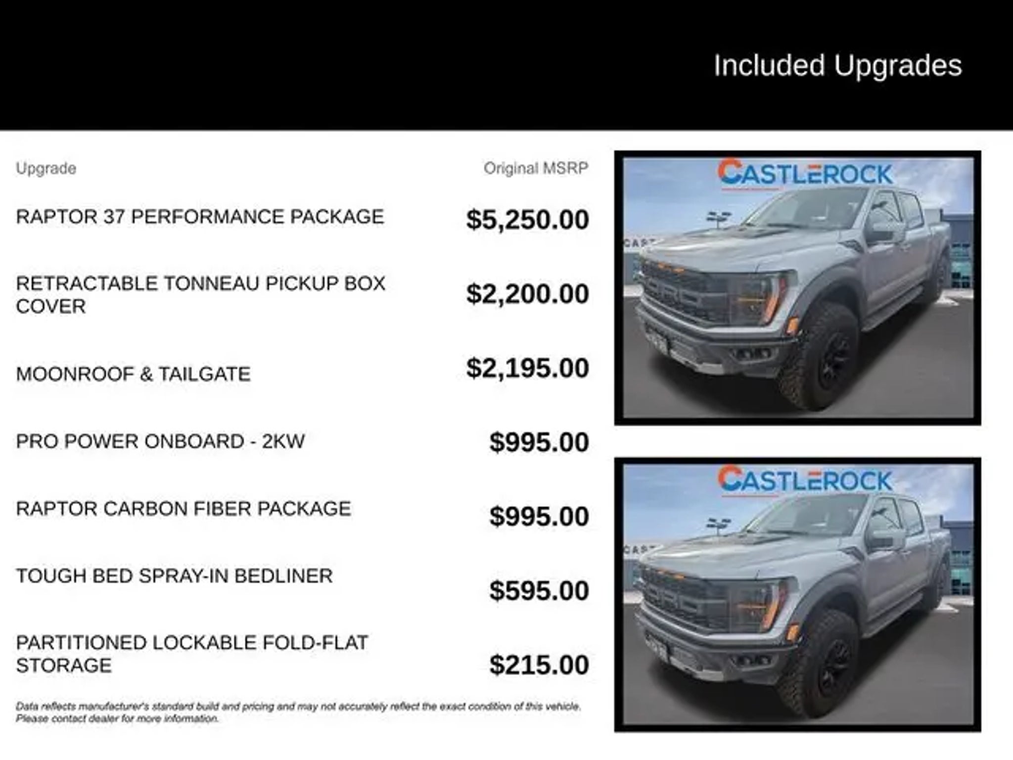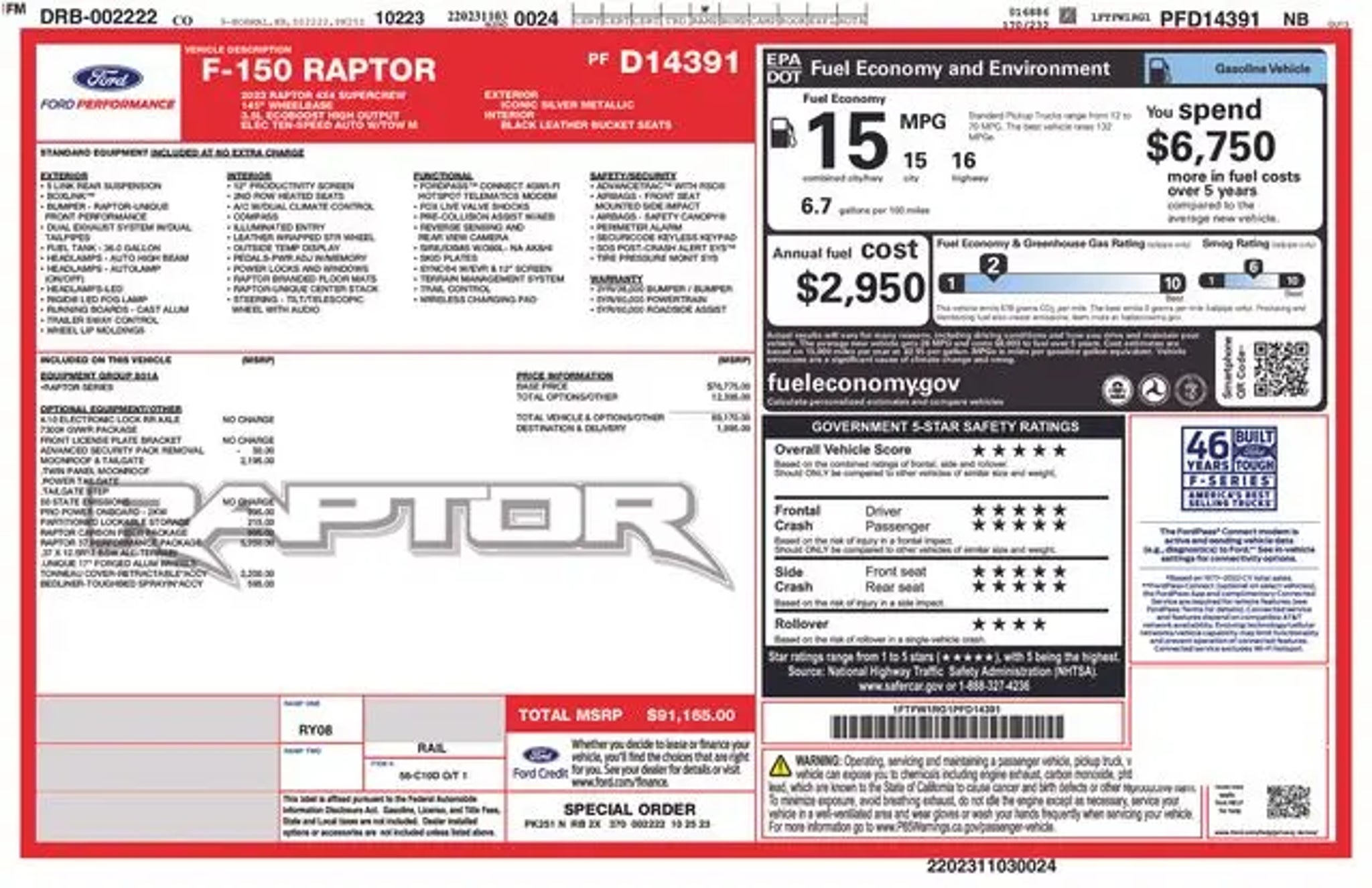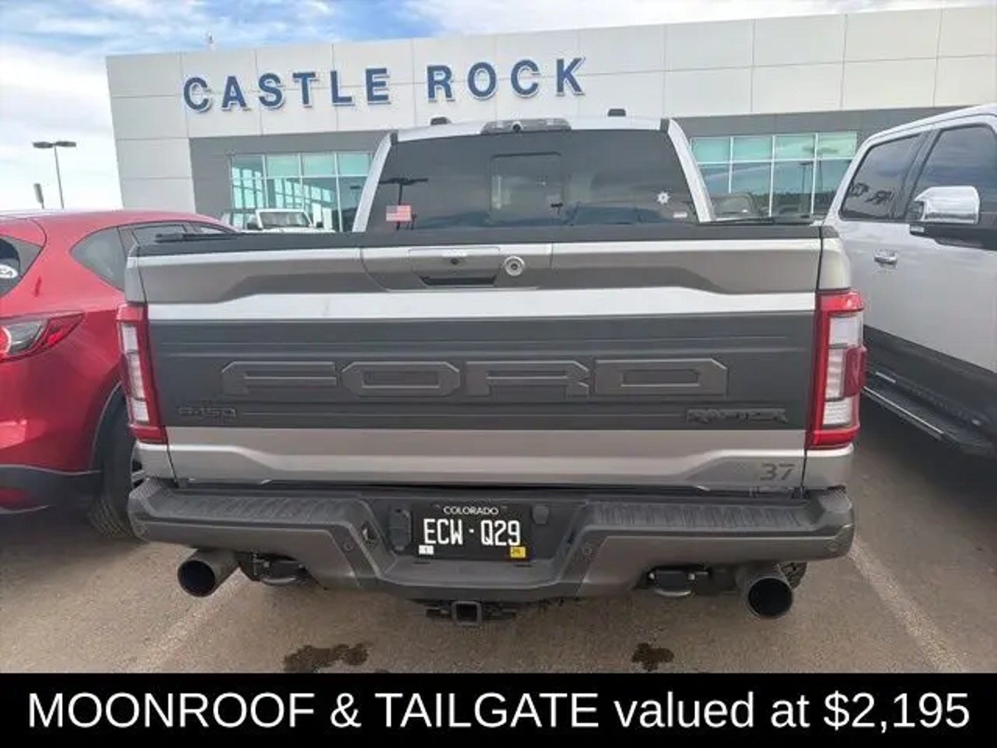 Discover the ultimate off-road experience with the 2023 Ford F-150 Raptor. This exceptional vehicle is engineered to conquer any terrain, blending unparalleled capability with refined comfort and cutting-edge technology. "¢ Raptor 37 Performance Package "¢ Raptor Carbon Fiber Package "¢ Retractable Tonneau Pickup Box Cover "¢ Moonroof & Tailgate "¢ Pro Power Onboard - 2KW "¢ Tough Bed Spray-In Bedliner Powered by a robust 3.5L V6 EcoBoost engine and equipped with a 10-speed automatic transmission, the Raptor delivers exceptional performance and control, with the added confidence of 4-wheel drive. Boasting a striking silver exterior, this vehicle is a true head-turner, complemented by its distinctive Raptor styling cues. Climb inside and experience the unparalleled comfort and convenience of the Raptor's cabin. Enjoy the comfort of heated and ventilated front seats, as well as a heated steering wheel, ensuring a relaxing ride no matter the weather. The twin-panel moonroof and power tailgate add an extra touch of luxury, while the Pro Power Onboard system provides the flexibility to power your tools or equipment on the go. Navigating the great outdoors has never been easier, thanks to the Raptor's advanced safety and technology features. Stay connected with the SYNC 4 infotainment system, which offers enhanced voice recognition and seamless integration with your smartphone. The lane departure warning system and rear-view camera provide added peace of mind, while the adaptive suspension ensures a smooth and responsive ride, even on the most challenging terrain. Whether you're tackling the toughest off-road trails or simply seeking a capable and stylish daily driver, the 2023 Ford F-150 Raptor is the ultimate choice. Experience the thrill of the open road and the freedom to explore with this exceptional vehicle. Visit CASTLE ROCK FORD or call for your V.I.P. appointment . Price does not include Tax, Title and Fees.