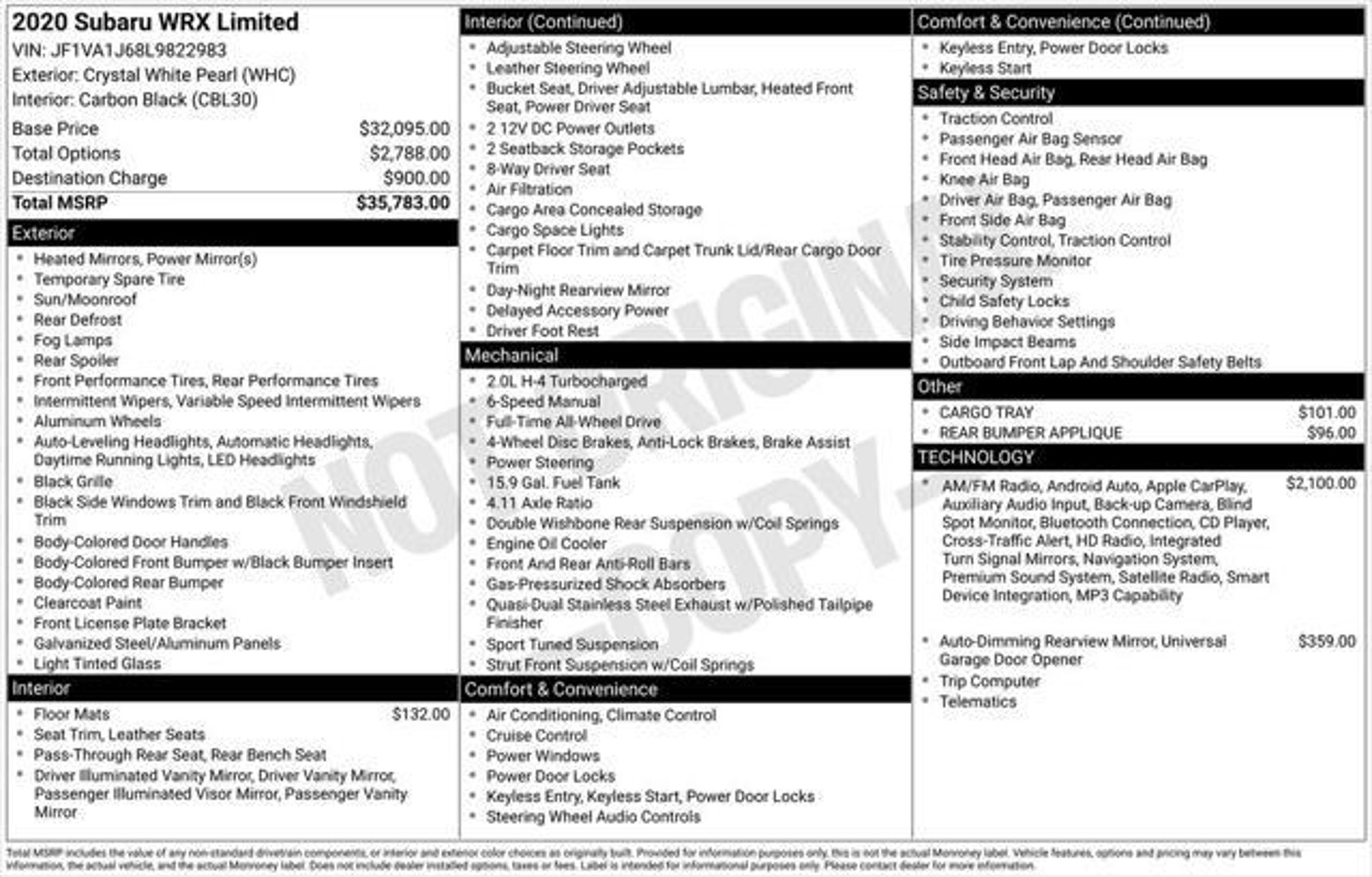 Details > 2020 Subaru WRX AWD Limited 4DR Sedan 6M For Sale in Waterloo, IA Private Party Sellers Click here to place your ad now! You auta tell them you saw the ad in AutaBuy when you call or email. 1/43 2/43 3/43 4/43 5/43 6/43 7/43 8/43 9/43 10/43 11/43 12/43 13/43 14/43 15/43 16/43 17/43 18/43 19/43 20/43 21/43 22/43 23/43 24/43 25/43 26/43 27/43 28/43 29/43 30/43 31/43 32/43 33/43 34/43 35/43 36/43 37/43 38/43 39/43 40/43 41/43 42/43 43/43 View 43 Photos View All Add to My Garage Parked in Your Garage! C&S Hyundai Contact Seller: I would like to: Make Offer Check Availability Ask A Question Request More Photos Check Financing Options Send a copy of this message to me Add this listing to my garage Send to Mobile Mileage 89,501 Exterior Color Crystal White Pearl Interior Color Carbon Black Doors 4 Engine 2.0L H4 Transmission 6 Speed Manual Stock # FSB13237A VIN JF1VA1J68L9822983 Estimated Monthly Payment $364 mo Apply Now J.J. Best Banc & Co. 2020 Subaru WRX AWD Limited 4DR Sedan 6M Description: C&S Car Company Used · Mileage: 89,501 · Color: Crystal White Pearl Price: $20,900. Mileage 89,501 Exterior Color Crystal White Pearl Interior Color Carbon Black Doors 4 Engine 2.0L H4 Transmission 6 Speed Manual Stock # FSB13237A VIN JF1VA1J68L9822983 Estimated Monthly Payment $364 mo Apply Now J.J. Best Banc & Co. Add to My Garage Parked in Your Garage! Message Seller C&S Hyundai Contact Seller: I would like to: Make Offer Check Availability Ask A Question Request More Photos Check Financing Options Send a copy of this message to me Add this listing to my garage Offered for sale by C&S Hyundai WATERLOO, IA Price: $20,900. Offered for sale by C&S Hyundai WATERLOO, IA [entire inventory] Ask Auta Intelligence How many of these were produced? Tell me about this model When was this model first introduced? Do you have a similar car to sell? List It Now! Questions about this car? Ask Auta Intelligence for production numbers, available options, etc. · Subscribe to AutaBuy! · Send a Gift Subscription Notice to a Friend