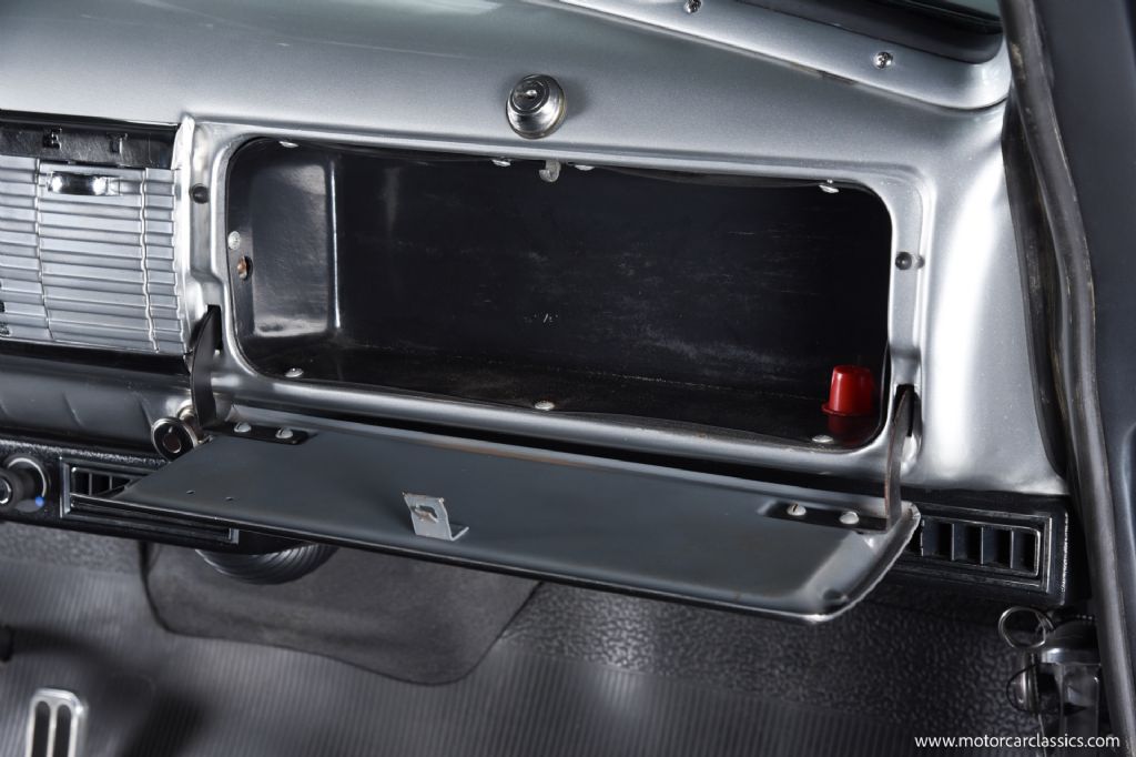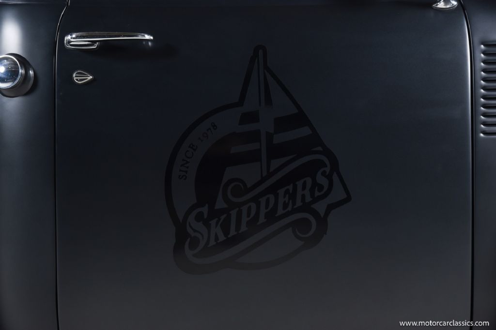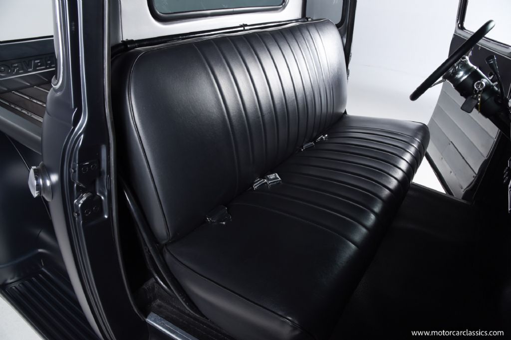 Inside, the cabin blends vintage design with thoughtful upgrades. The black and silver interior features a comfortable, padded bench seat with integrated seatbelts, a tilt steering column with a classic banjo-style wheel, crisp Art Deco gauges, and modern touches such as cold air conditioning and an AM/FM/CD stereo with satellite compatibility. Every surface reflects the quality of the restoration and the attention to period-correct detail.
