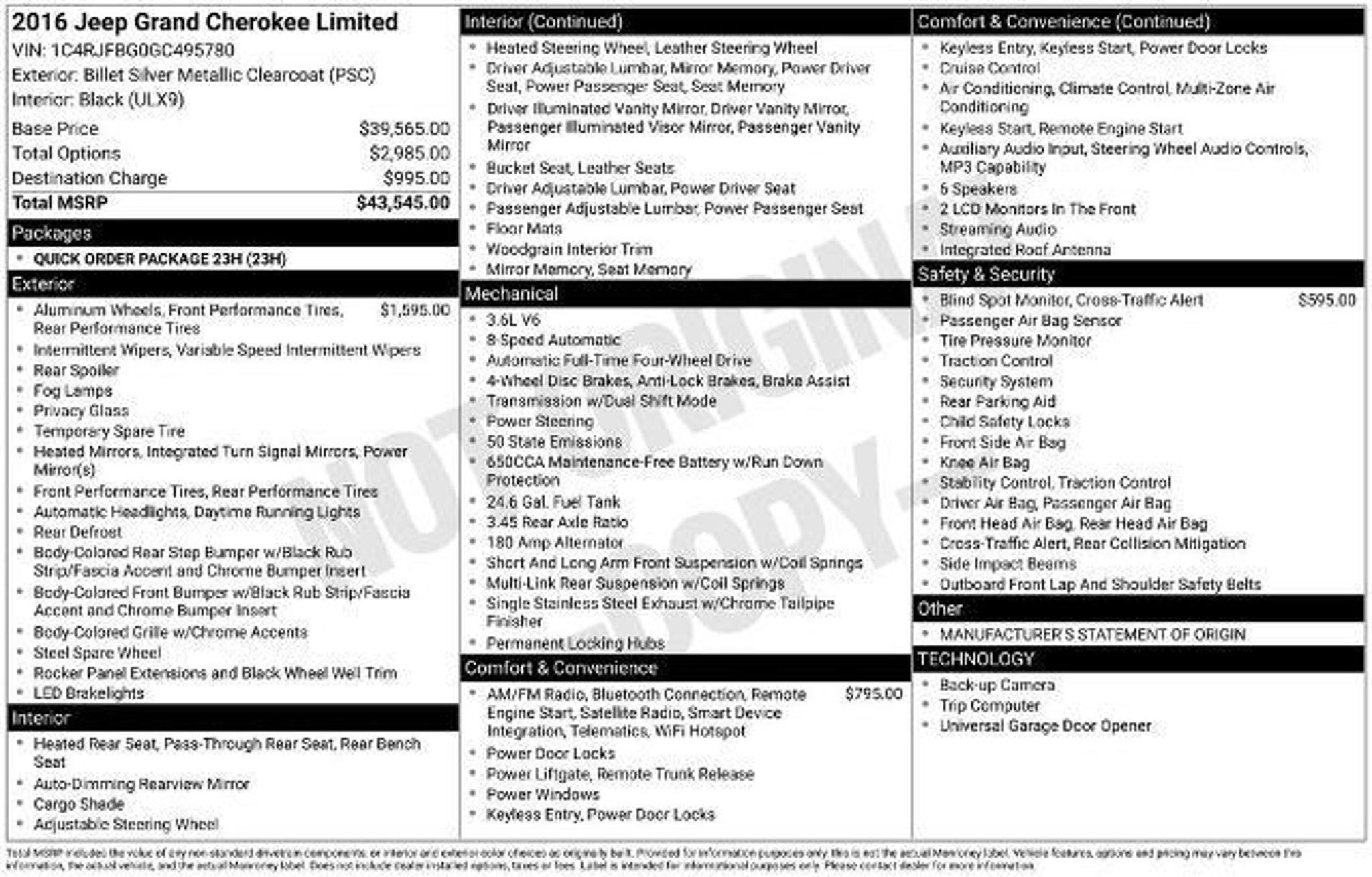 Experience the epitome of modern SUV luxury with this 2016 Jeep Grand Cherokee Limited. Boasting a sleek silver exterior and a well-appointed interior, this vehicle is the perfect blend of style, capability, and comfort. Highlighted features include: â 20 Aluminum Wheels â Uconnect 8.4 Touchscreen Display â Blind Spot & Cross Path Detection â Integrated Voice Command with Bluetooth â SiriusXM Satellite Radio Under the hood, the 3.6L V6 24V VVT engine, paired with an 8-speed automatic transmission, delivers a smooth and efficient driving experience. With its 4-wheel drive capability, this Grand Cherokee is ready to take you on any adventure, whether it's conquering the city streets or navigating off-road terrain. Slip into the spacious and well-appointed cabin, where you'll find premium leather-trimmed bucket seats, a heated steering wheel, and dual-zone automatic climate control. The Uconnect infotainment system, complete with navigation capabilities, keeps you connected and entertained on the go. Safety is also a top priority, with features like Blind Spot and Cross Path Detection, which help you stay aware of your surroundings. The Jeep Grand Cherokee Limited is a true testament to Jeep's commitment to quality and innovation. Imagine yourself behind the wheel of this exceptional SUV, exploring new horizons and enjoying the ride in unparalleled comfort and style. Experience the difference for yourself by scheduling a test drive today. We're confident you'll be impressed by the exceptional value and capabilities of this 2016 Jeep Grand Cherokee Limited.