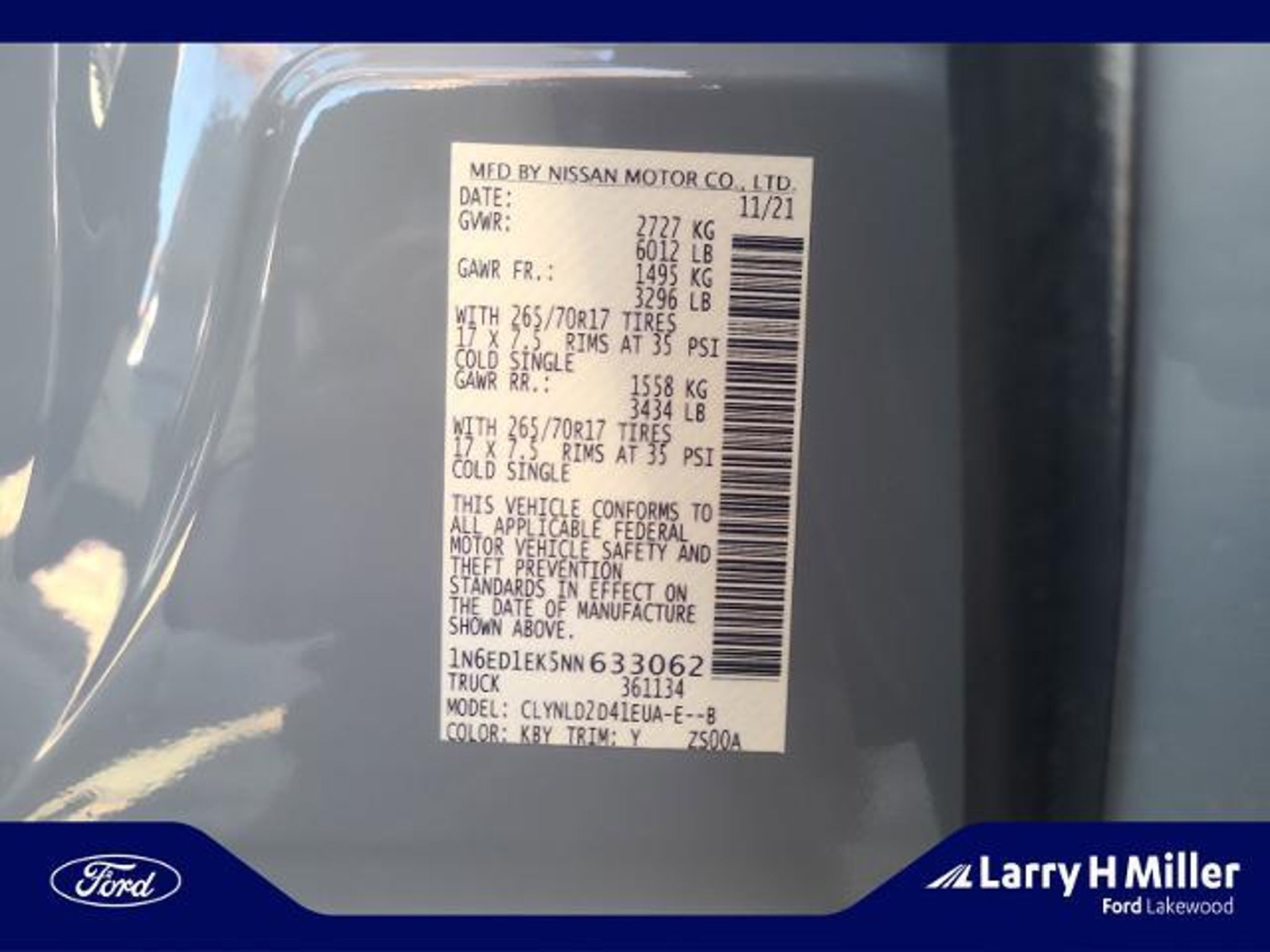 Boulder Gray Pearl 2022 Nissan Frontier PRO-4X 4WD 9-Speed Automatic 3.8L DI DOHC 24V V6 POWER MOONROOF NAVIGATION NISSAN TAILGATE AUDIO BY KICKER PRO CONVENIENCE PKG HEATED SEATS HEATED STEERING WHEEL REMOTE START TRAILER TOW INTELLIGENT 360 DEGREE CAMERA PRO PREMIUM PKG FENDER PREMIUM AUDIO W/10 SPEAKERS 17 BEADLOCK STYLE ALLOY WHEELS TECHNOLOGY PKG LANE DEPARTURE WARNING BLIND SPOT WARNING REAR CROSS TRAFFIC ALERT PARKING SENSORS INTELLIGENT CRUISE CONTROL BILSTEIN OFF ROAD SHOCKS DEVICE CAPABLE HANDS FREE BLUETOOTH BEST COLOR COMBO AND EXCELLENT CONDITION! OTHER OPTIONS INCLUDE: 120V Power Outlet in Bed 120V Power Outlet in Rear Center Console 17 Accessory Dark Beadlock Style Alloy Wheels 3.692 Axle Ratio 4-Wheel Disc Brakes ABS brakes Air Conditioning All Lava Red Accent Stitching Delete Anti-whiplash front head restraints Auto High-beam Headlights Auto-Dimming Mirror Auto-Tilt & Slide Sunroof w/Manual Shade Automatic temperature control Bed Under-Rail Lighting Brake assist Bumpers: body-color Delay-off headlights Driver door bin Driver vanity mirror Dual front impact airbags Dual front side impact airbags Electronic Stability Control Emergency communication system: NissanConnect Services Fender Premium Audio System w/10 Speakers Front & Rear Leather Seat Trim (1st/2nd) Front anti-roll bar Front Bucket Seats Front Center Armrest Front dual zone A/C Front fog lights Front reading lights Front wheel independent suspension Fully automatic headlights Heated Front Seats Heated Outside Mirrors Heated Steering Wheel HomeLink UGDO Illuminated entry Intelligent Around View Monitor (I-AVM) Knee airbag Leather Shift Knob Low tire pressure warning Navigation system: Nissan Navigation with Voice Recognition Nissan Tailgate Audio by Kicker w/Utili-Track Brkt Occupant sensing airbag Off-Road Protection Package Overhead airbag Overhead console Panic alarm Passenger door bin Passenger vanity mirror Power door mirrors Power driver seat Power steering Power windows PRO Embroidered Premium Cloth Seat Trim PRO-4X Comfort & Convenience Package PRO-4X Illuminated Kick Plates PRO-4X Mud Flaps PRO-4X Premium Package Radio data system Radio: SXM/AM/FM/AUX/USB Audio System w/6 Speakers Rear anti-roll bar Rear seat center armrest Rear step bumper Remote Engine Starter Remote keyless entry Security system Speed control Speed-sensing steering Split folding rear seat Spray-In Bedliner Steering wheel mounted audio controls Tachometer Tilt steering wheel Traction control Trailer Hitch w/Wiring Harness Trip computer Unique Premium Center Console Stitching Unique Premium Door Trim Utili-Track System Variably intermittent wipers Voltmeter Wireless Charging For Personal Devices. Why buy from Larry H Miller Ford of Lakewood? Thats easy! We have a list of reasons: -We will treat you like family -We support our local community and businesses -We will meet or beat any like equipped Ford Dealer pricing! -Convenient location at 6th & Simms in Lakewood -Our experienced team can help with ALL credit situations -Full selection of Ford parts & accessories -We service ALL makes & models -We truly appreciate the opportunity to earn your business.