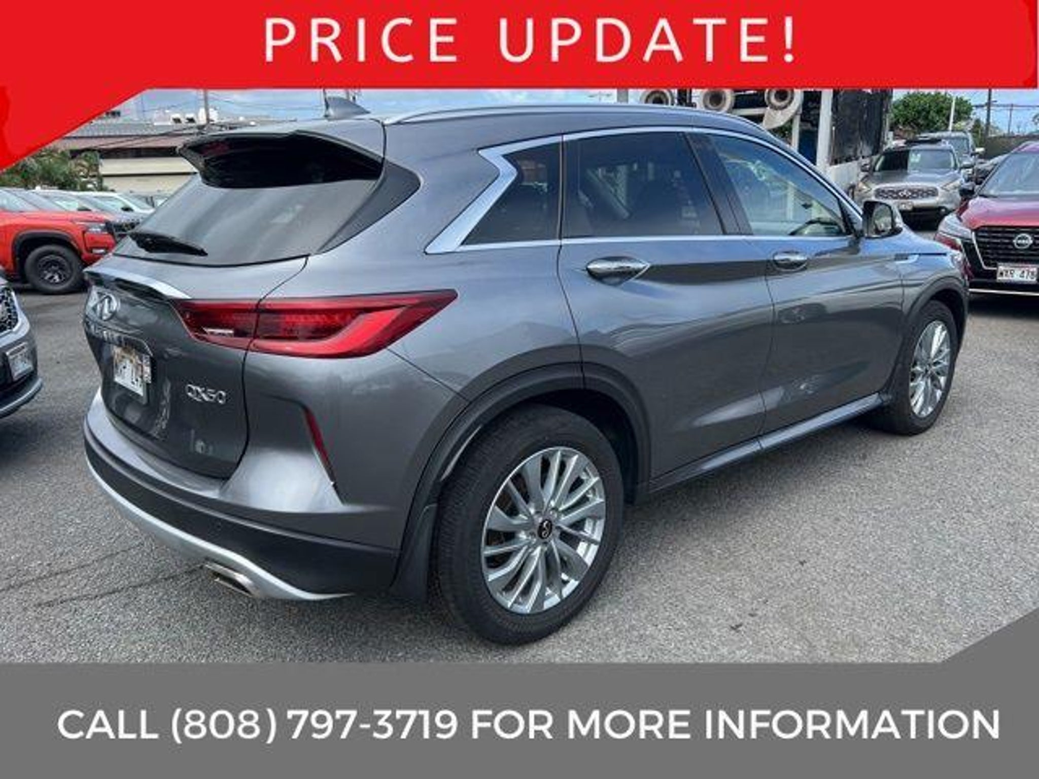 Premium style and advanced technology this 2023 INFINITI QX50 LUXE delivers both comfort and performance. Powered by INFINITIs innovative VC-Turbo engine, the QX50 combines strong performance with impressive fuel efficiency. The LUXE trim surrounds you with upscale features, including leather-appointed seating, a panoramic moonroof, and a dual-touchscreen infotainment system with Apple CarPlay, Android Auto, and INFINITI InTouch. Safety comes standard with ProPILOT Assist, Blind Spot Warning, and Forward Emergency Braking, giving you confidence on every drive. With its sleek design, clean history, and premium amenities, this QX50 LUXE offers a refined driving experience thats perfect for families and professionals alike. Stylish, capable, and priced to move schedule your test drive today! All Purchases come with a free oil change, Key Replacement Coverage, and Annual Hawaii Safety Inspections. Our Service Department has a Fast Lane for Quick Service as well as a Rental Car Department. Recent Arrival! 23/29 City/Highway MPG King Windward Nissan uses Advanced Market based pricing. **Attention!! King Windward Nissan uses an Advanced Software Program to shop the Market everyday!! This Program allows us to offer you the Best Value you can find anywhere!! We know you've done your Homework on-line and so have we!! Call or Click today and get your Quick No Pressure Quote! **