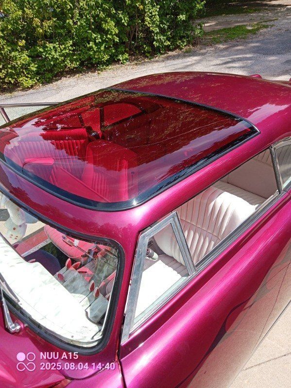 This 1954 Mercury Monterey is a professionally built custom that has undergone a complete frame-off rebuild. The frame was sandblasted and refinished, and the vehicle features a rebuilt 289 CI V8 engine along with a rebuilt transmission and rear end. The exterior presents in fuchsia with a high-quality finish, while the white interior is clean and well-kept. The car is equipped with power steering, dropped spindles, a chopped top, and suicide doors operated by remote control. Additional features include air conditioning, heat, a factory-style radio with cassette player, and a swing-away continental kit. The vehicle has been garage-kept in a climate-controlled environment, driven occasionally, and is reported to need nothing. It has won trophies at every show it has attended, including a first-place finish at a large Kansas City show several years ago.