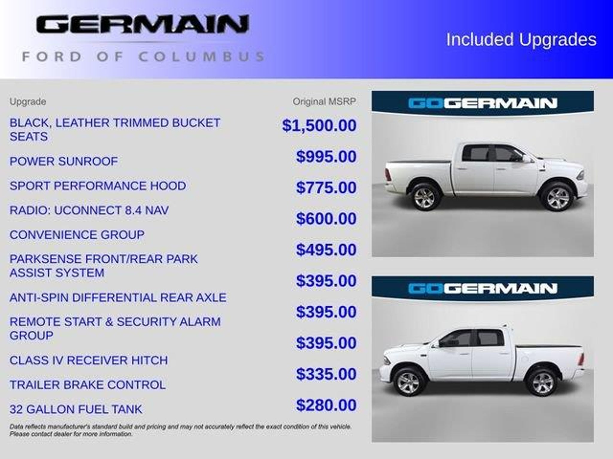 Bright White Clearcoat 4WD 8-Speed Automatic HEMI 5.7L V8 Multi Displacement VVT. Auto High Beam Headlamp Control, Convenience Group, GPS Navigation, Keyless Enter-N-Go, Power Sunroof, Rain Sensitive Windshield Wipers, Remote Proximity Keyless Entry.WE HAVE INCLUDED 30 PHOTO'S OF OUR VEHICLES. PLEASE VISIT WWW.GERMAINFORD.COM. Recent Arrival!What is Live Market Pricing? Simple. Live Market Pricing provides the most competitive prices on all our pre-owned vehicles, all the time. Pre-owned Live Market Pricing is achieved by polling over 40,000 pre-owned websites every hour to ensure that every single customer receives real-time Value Pricing on every single Pre-Owned Vehicle we sell. We don't play the pricing games. See for yourself how we measure up to the competitors by. 2016 Ram 1500 Sport