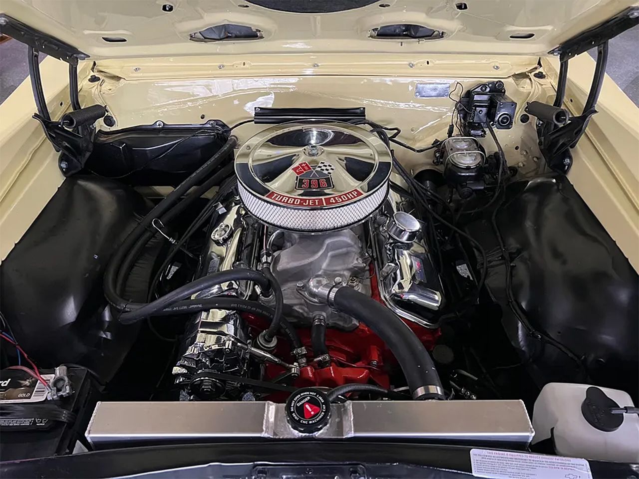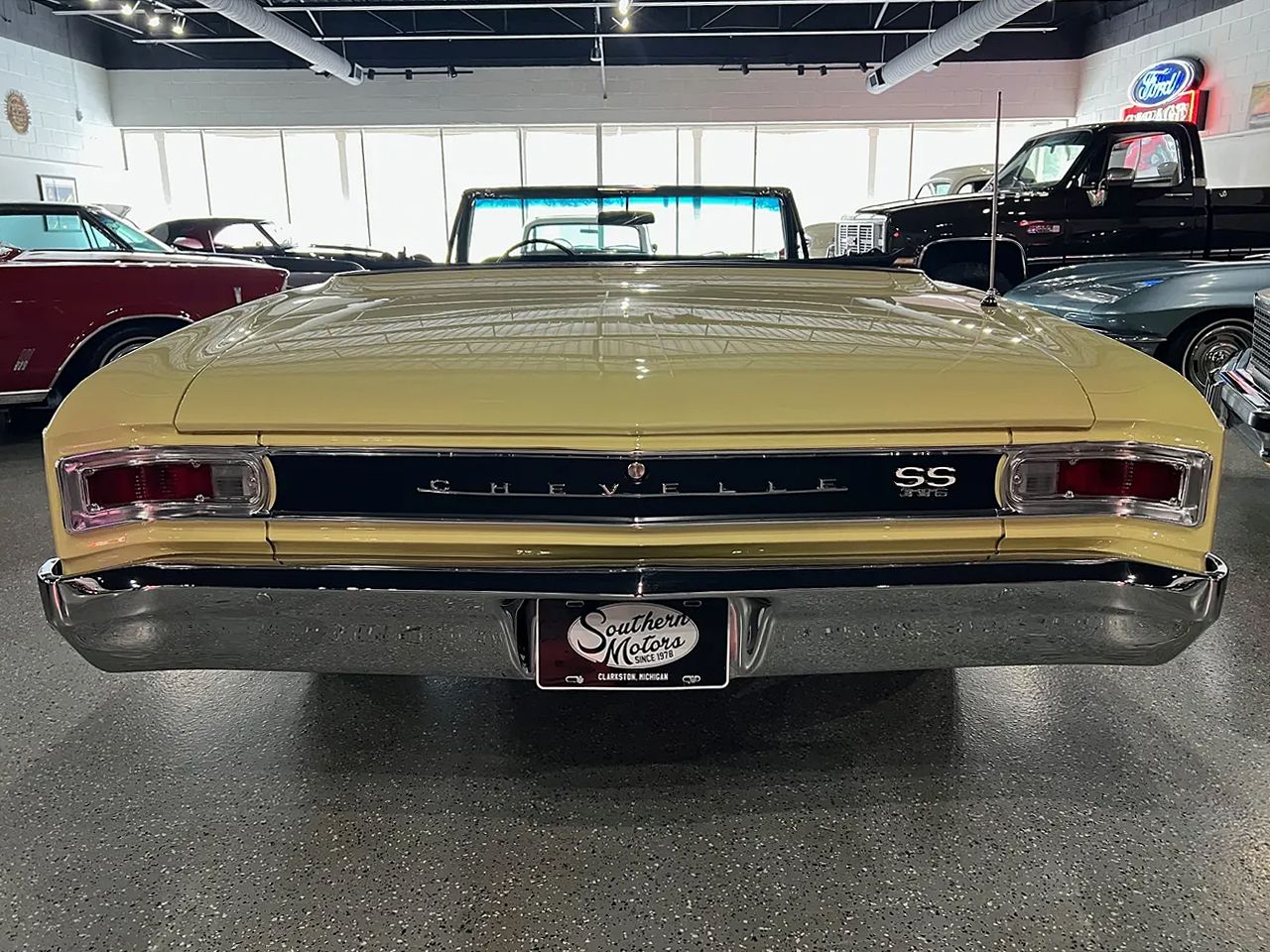 Clean Georgia car, Recent Frame-Up Restoration, SS tribute, beautiful Lemonwood yellow paint, black vinyl interior, black convertible top, 396 ci engine, Muncie 4 speed manual transmission, Brawler Performance dual feed 4 bbl, aluminum intake, mild camshaft, headers, chrome air cleaner & valve covers, HEI distributor, power steering, front disc brakes, aluminum radiator with dual electric fans, bucket seats with center console, Sport steering wheel, factory dash, aftermarket gauges, Sony am-fm radio, power top, Flowmaster dual exhaust, 12 bolt 3.23 rear axle, factory jack with spare, 245/40ZR20 rear tires, 225/40ZR18 fronts, 18 & 20” chrome Coys wheels, Super Sport hood & trim, One Clean Bowtie!