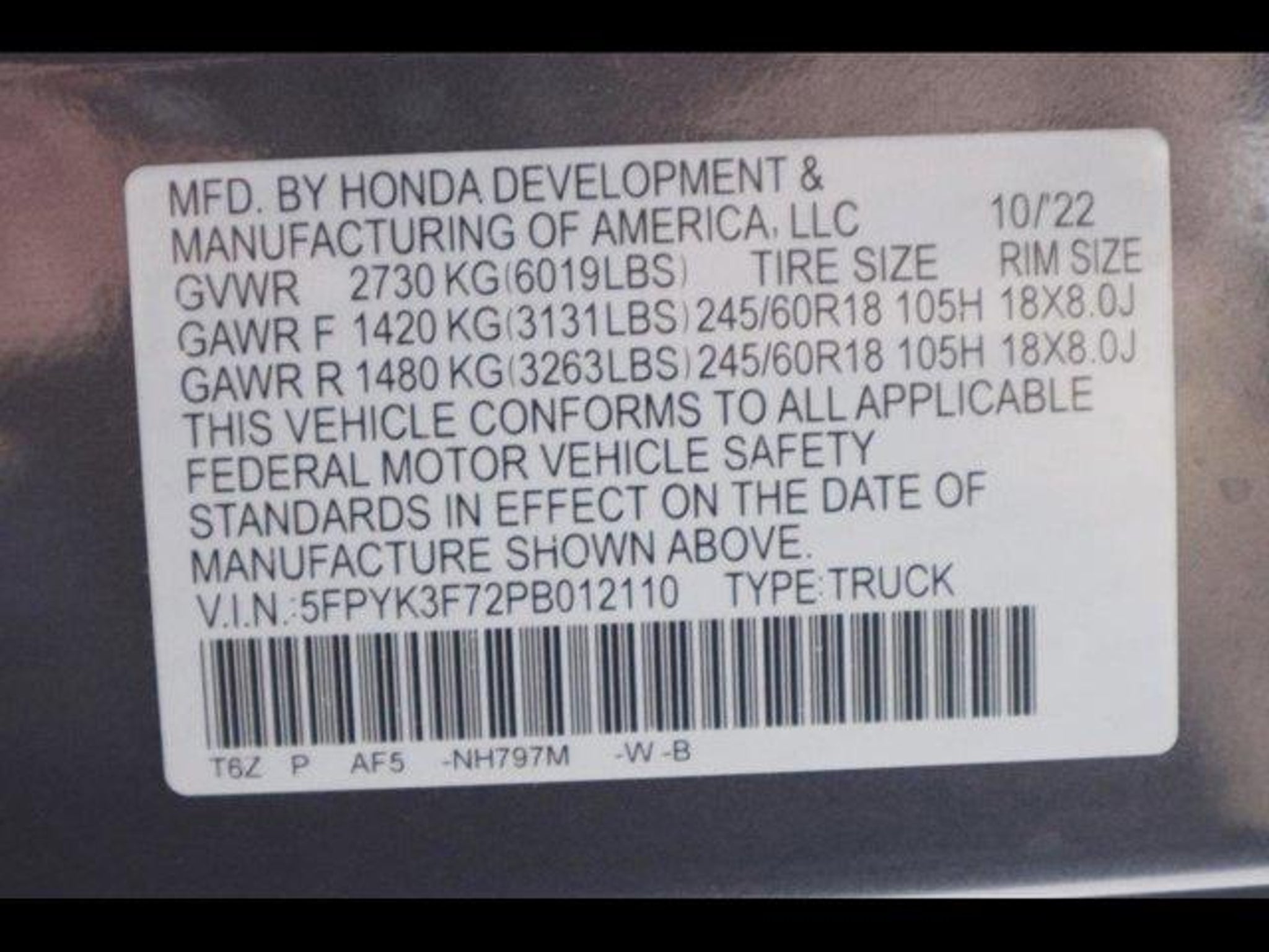 VIN 5FPYK3F72PB012110