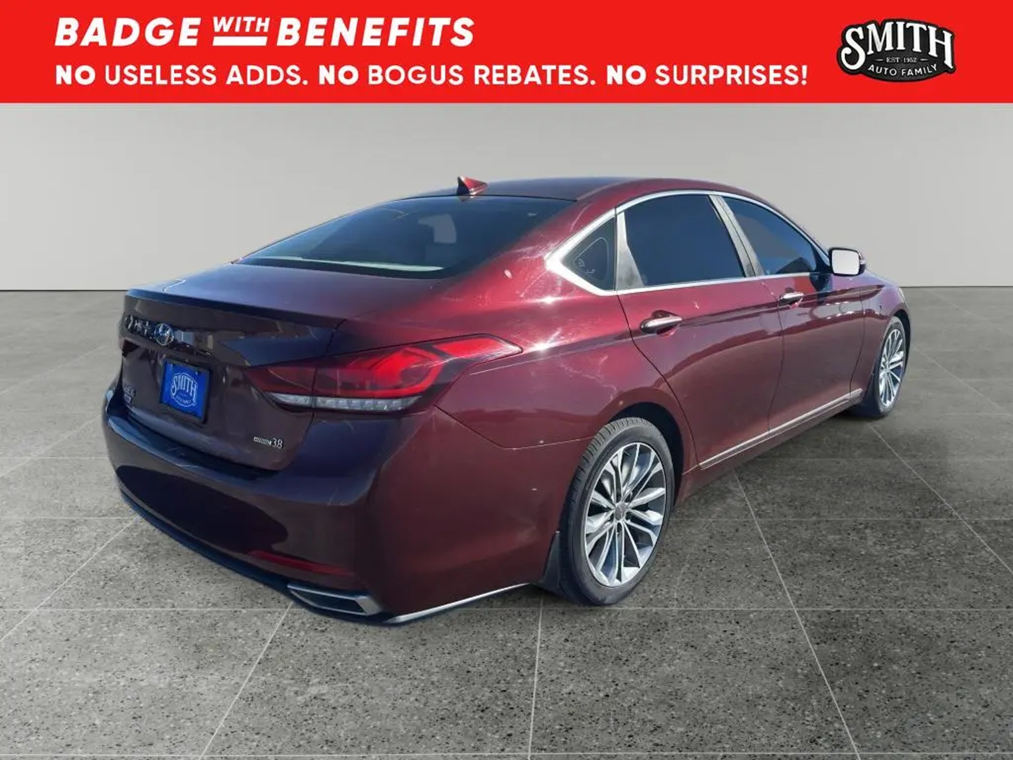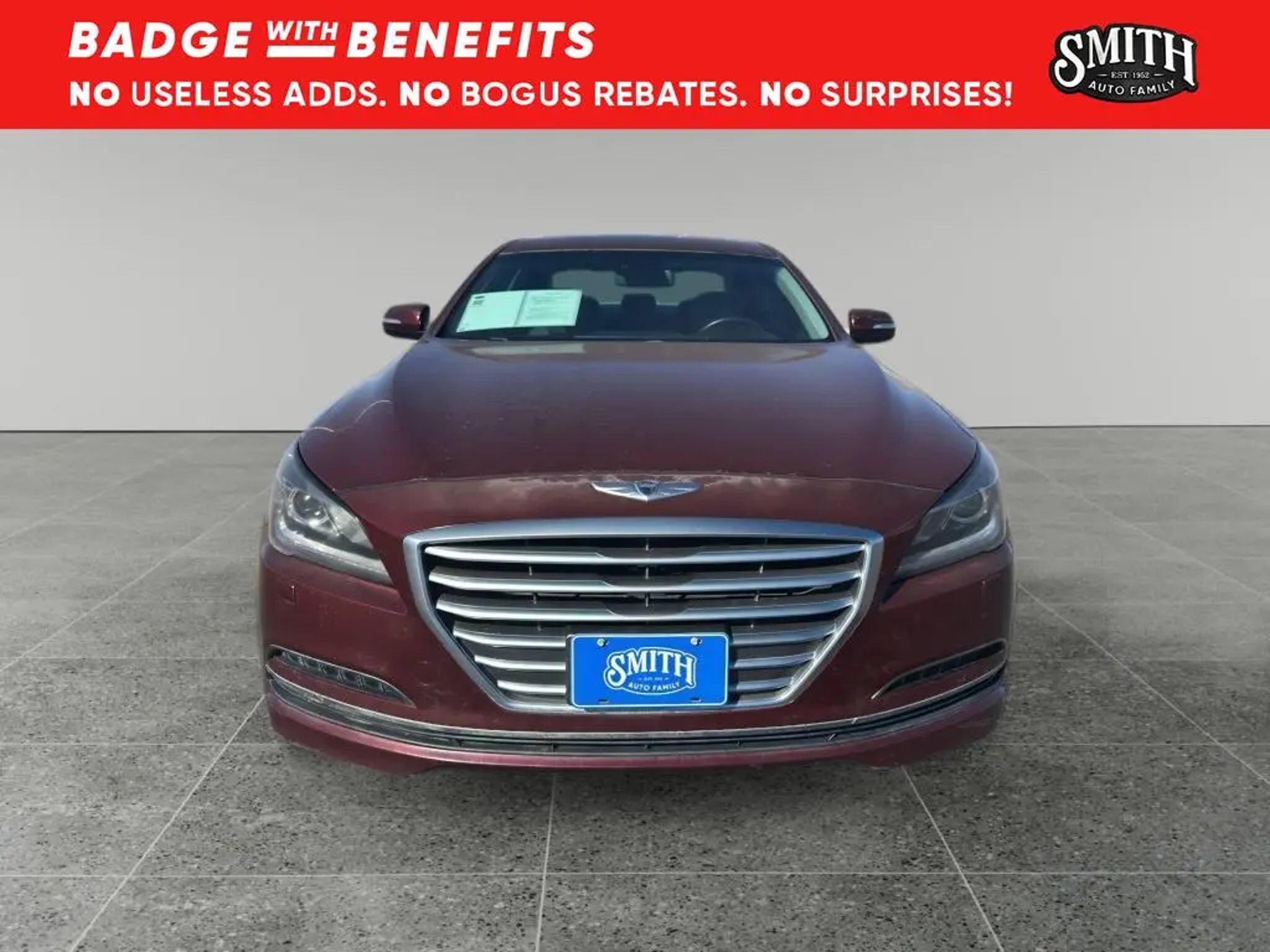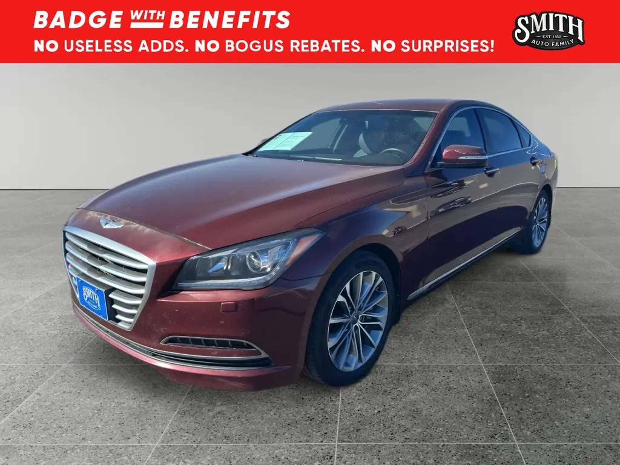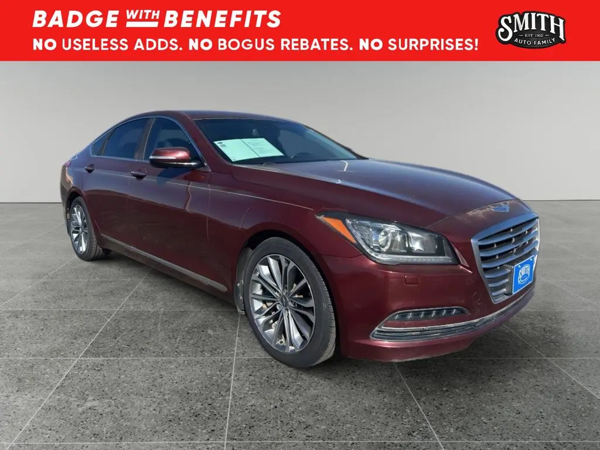 Vehicle Details 2015 Hyundai Genesis 3.8L V6 "” RWD luxury sedan located in Plainview, TX, offering the best price in the area. This well-maintained Hyundai Genesis pairs a smooth 3.8L V6 gasoline engine with rear-wheel drive and a refined automatic transmission for confident highway cruising and composed city driving. Premium features elevate daily comfort: automatic climate control maintains ideal cabin temperatures, heated steering wheel adds winter convenience, and leather-appointed seating ensures a luxury feel. Stay connected and on course with the factory navigation system, while the back-up camera enhances safety and parking confidence. Enjoy premium audio options including XM Radio for endless entertainment on long drives. Advanced engineering and a solid service history make this Hyundai Genesis a compelling choice for buyers seeking performance, comfort, and value. This Hyundai Genesis delivers an engaging driving experience without sacrificing practicality"”ample trunk space and thoughtfully designed interior controls make every journey comfortable. Safety and convenience features are designed to protect occupants and simplify driving tasks. Located in Plainview, TX, this vehicle is competitively priced to sell quickly; we're offering the best price compared to similar local listings, providing exceptional value for a luxury sedan with a V6 powerplant. Schedule a test drive today to experience the smooth ride, responsive V6 performance, and premium amenities firsthand. Competitive pricing combined with desirable features makes this 2015 Hyundai Genesis an outstanding buy. Equipment You'll never again be lost in a crowded city or a country region with the navigation system on this large car. with XM/Sirus Satellite Radio you are no longer restricted by poor quality local radio stations while driving this Hyundai Genesis. Anywhere on the planet, you will have hundreds of digital stations to choose from. This vehicle features a hands-free Bluetooth phone system. This unit offers Automatic Climate Control for personalized comfort. The leather seats in this large car are a must for buyers looking for comfort, durability, and style. It is pure luxury with a heated steering wheel. Protect the Hyundai Genesis from unwanted accidents with a cutting edge backup camera system. This Hyundai Genesis excites both driver and bystanders with a polished red exterior with racy lines. The Hyundai Genesis is rear wheel drive. Set the temperature exactly where you are most comfortable in the vehicle. The fan speed and temperature will automatically adjust to maintain your preferred zone climate. Packages Option Group 01. All Weather Floor Mats. Reversible Cargo Tray. Mud Guards. Rear Bumper Applique. Wheel Locks. First Aid Kit. **Equipment listed is based on original vehicle build and subject to change. Please confirm the accuracy of the included equipment by calling the dealer prior to purchase.**