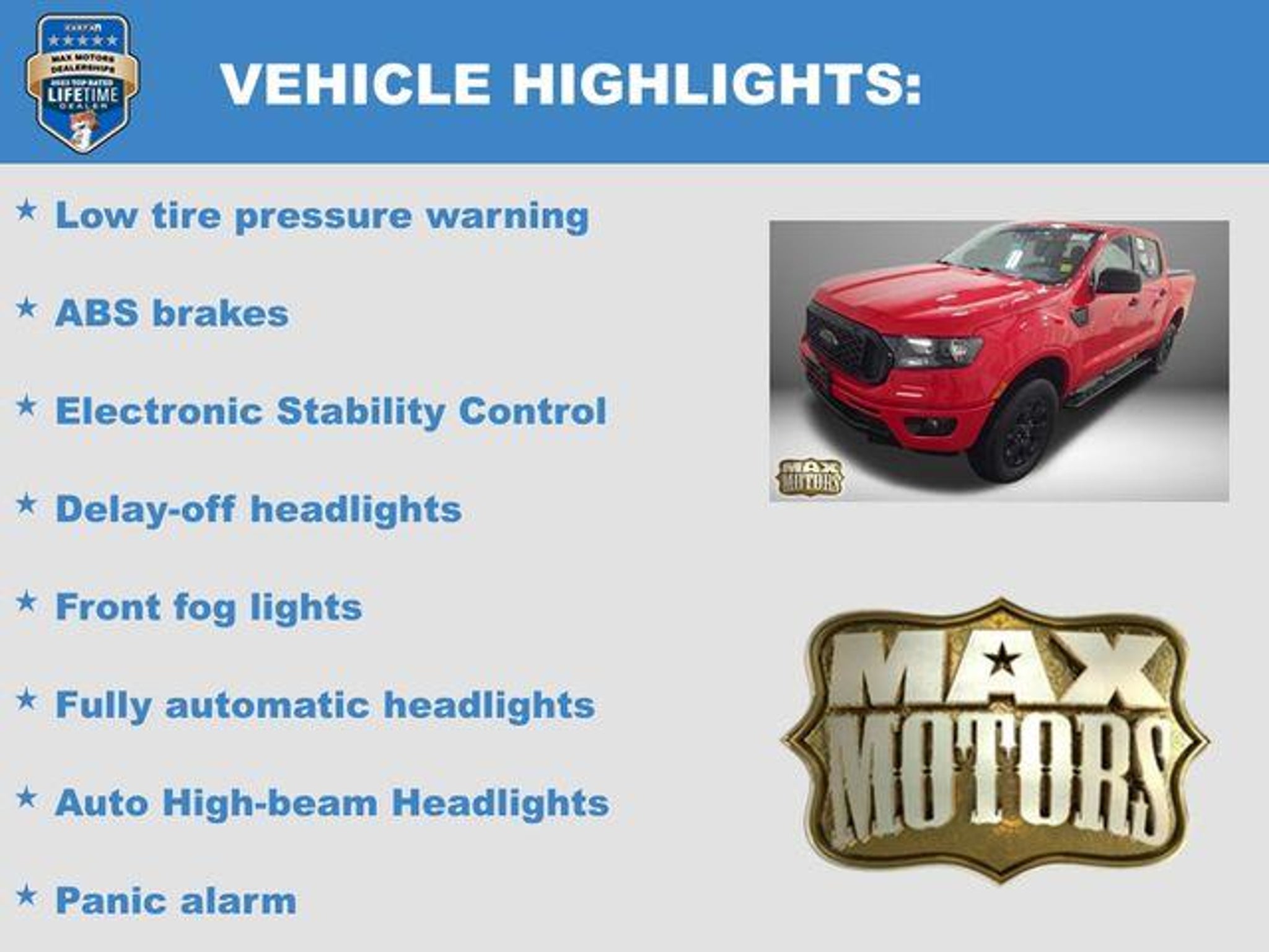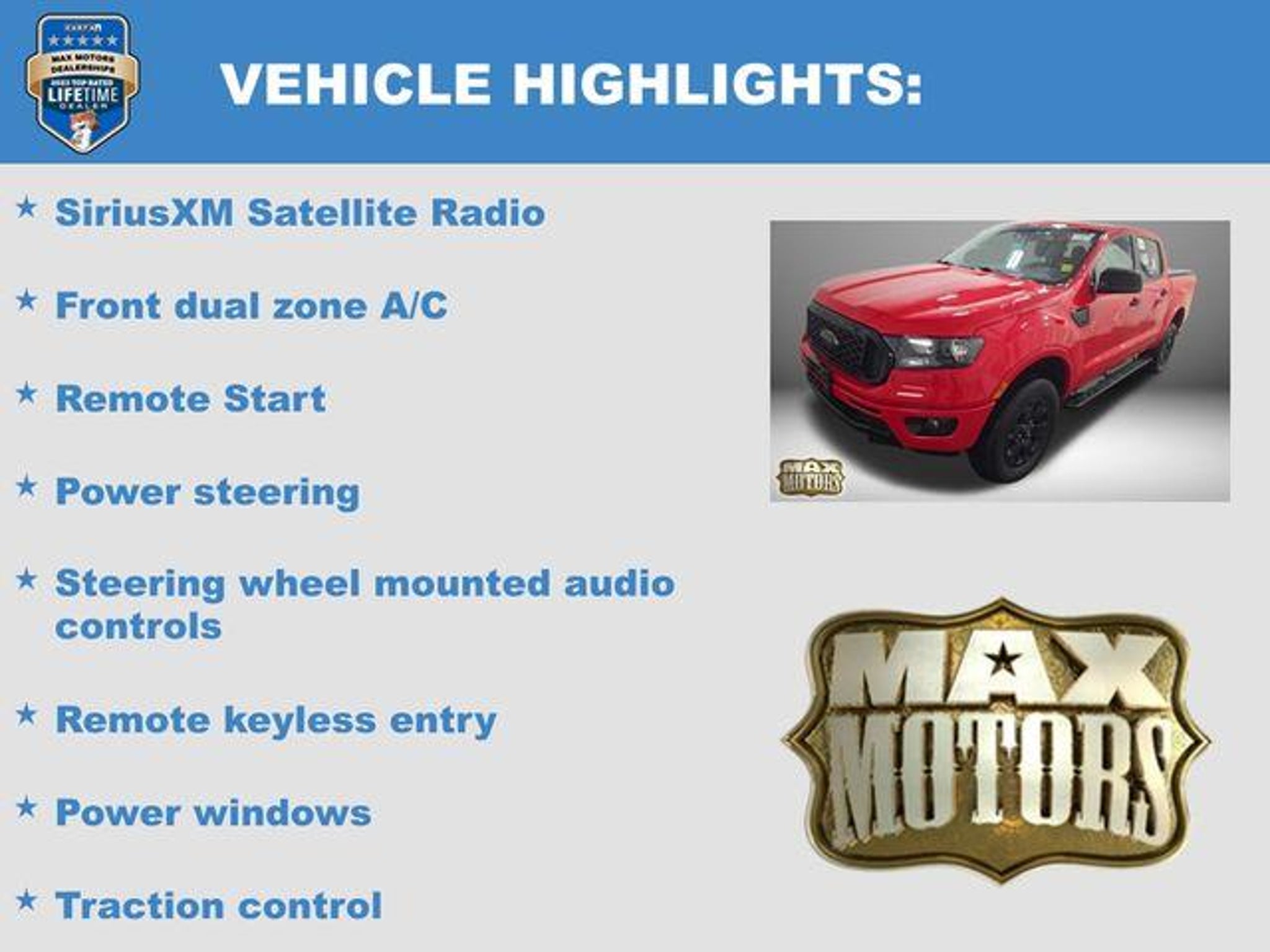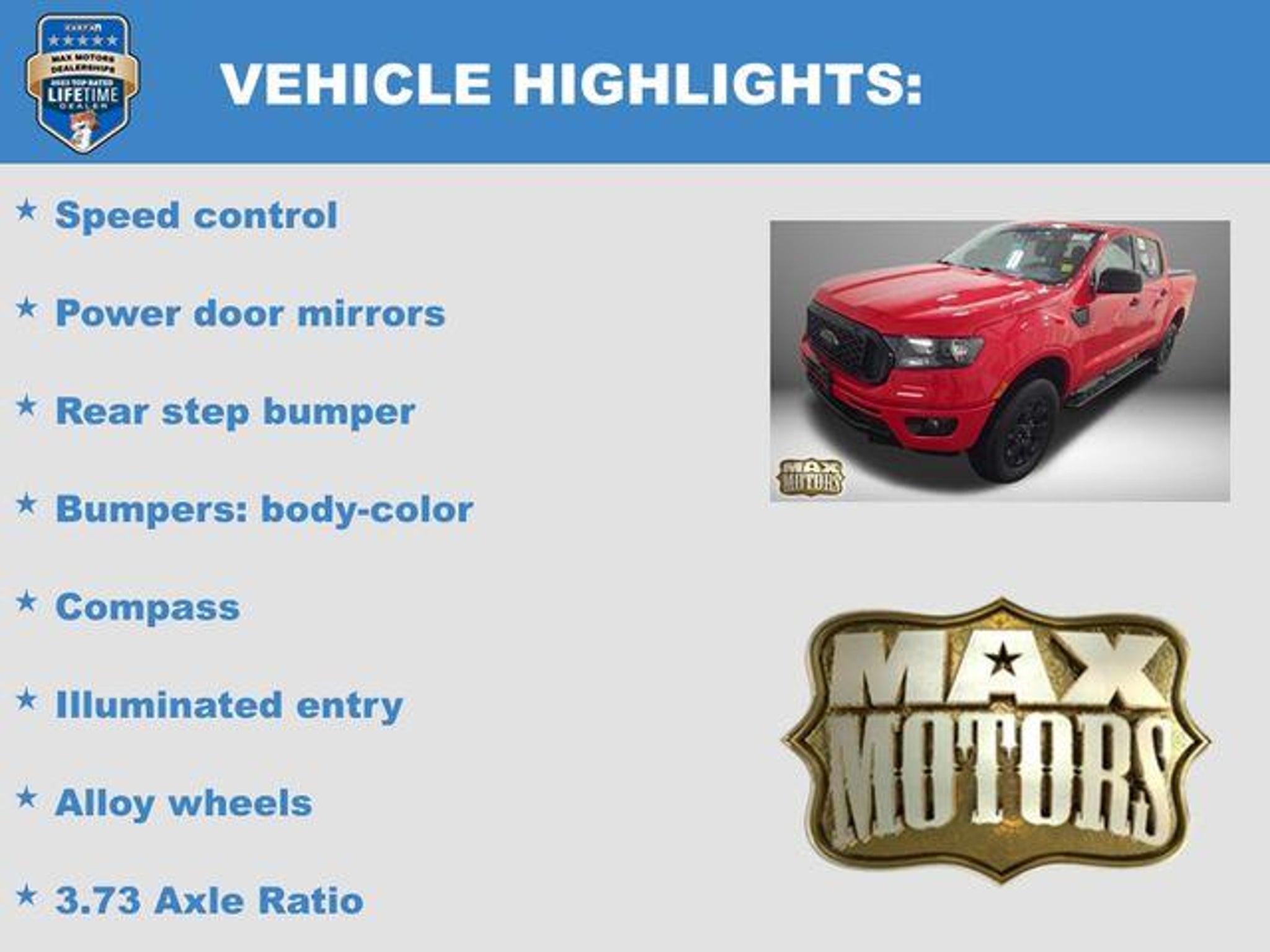Clean CARFAX. Race Red 2021 Ford Ranger XLT 4D Crew Cab XLT 4WD EcoBoost 2.3L I4 GTDi DOHC Turbocharged VCT 20/24 City/Highway MPG 4WD, 3.73 Axle Ratio, ABS brakes, Alloy wheels, Auto High-beam Headlights, Bumpers: body-color, Compass, Delay-off headlights, Electronic Stability Control, Front dual zone A/C, Front fog lights, Fully automatic headlights, Illuminated entry, Low tire pressure warning, Panic alarm, Power door mirrors, Power steering, Power windows, Rear step bumper, Remote keyless entry, Remote Start, SiriusXM Satellite Radio, Speed control, Steering wheel mounted audio controls, Traction control. Odometer is 12993 miles below market average! At Max Motors, our mission is simple: to provide every customer with a honest, transparent, and rewarding automotive experience. For 19 years as a family-owned business, we build strong customer relationships that go beyond a sale. Buying a vehicle is significant, and we ensure the process is smooth and straightforward.