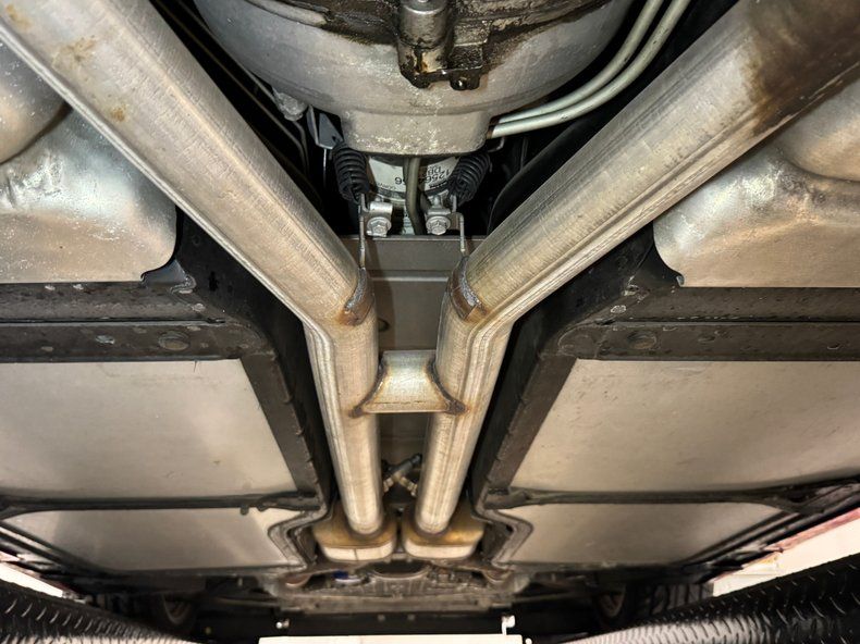 Clean and unremarkable underneath, here's where we find four wheel power disc brakes, dual exhaust running through original equipment, and double wishbone cast aluminum upper and lower control arms, transverse mounted composite leaf springs, and monotube shock absorbers make up the suspension for the front and the rear.