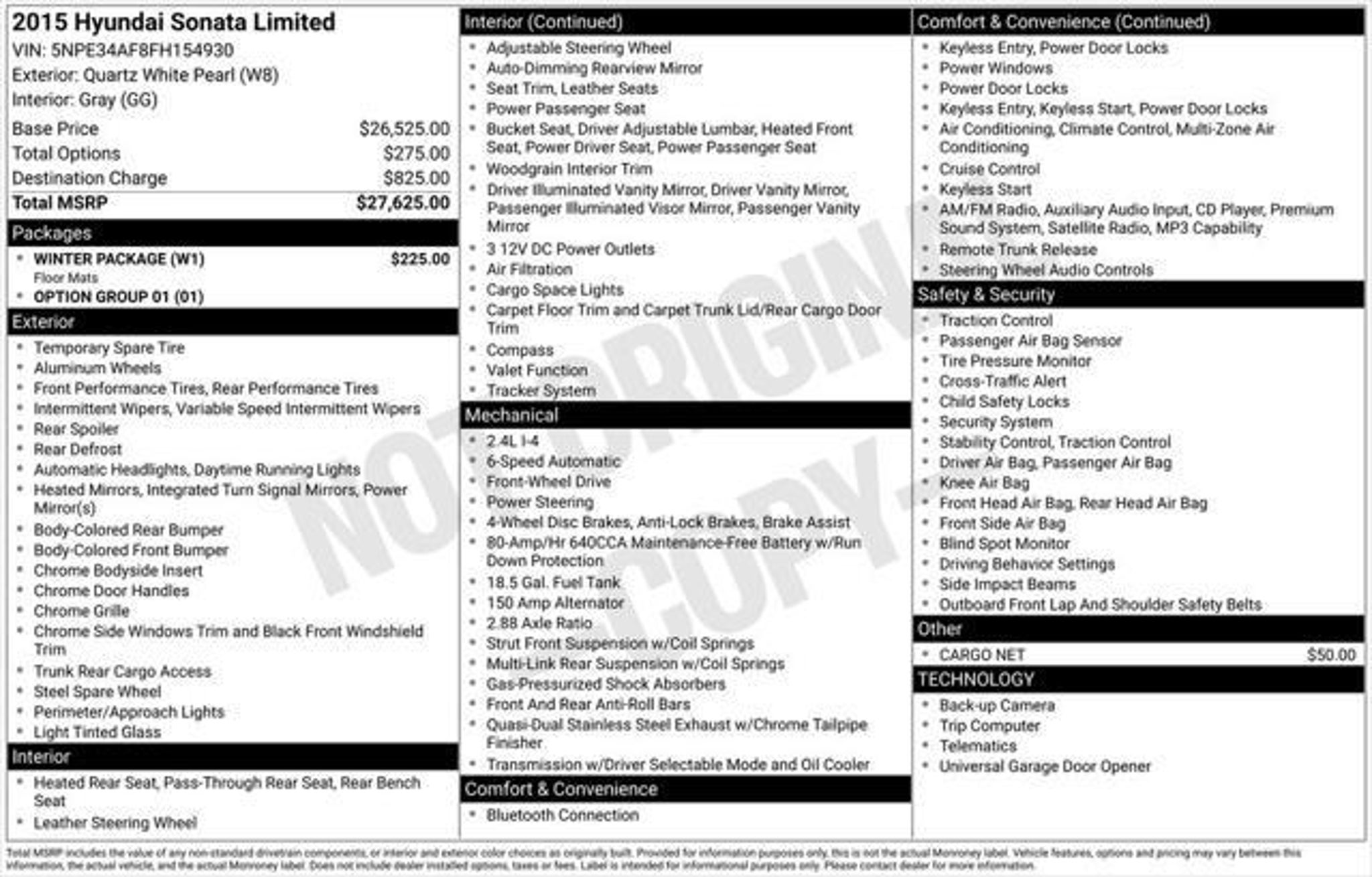 Details > 2015 Hyundai Sonata Limited 4DR Sedan For Sale in Columbus, OH Private Party Sellers Click here to place your ad now! You auta tell them you saw the ad in AutaBuy when you call or email. 1/34 2/34 3/34 4/34 5/34 6/34 7/34 8/34 9/34 10/34 11/34 12/34 13/34 14/34 15/34 16/34 17/34 18/34 19/34 20/34 21/34 22/34 23/34 24/34 25/34 26/34 27/34 28/34 29/34 30/34 31/34 32/34 33/34 34/34 View 34 Photos View All Add to My Garage Parked in Your Garage! Germain Hyundai Contact Seller: I would like to: Make Offer Check Availability Ask A Question Request More Photos Check Financing Options Send a copy of this message to me Add this listing to my garage Send to Mobile Mileage 107,470 Exterior Color Quartz White Pearl Interior Color Gray Doors 4 Engine 2.4L I4 Transmission 6 Speed Auto Stock # HTFH154930 VIN 5NPE34AF8FH154930 Estimated Monthly Payment $169 mo Apply Now J.J. Best Banc & Co. 2015 Hyundai Sonata Limited 4DR Sedan Description: Germain Hyundai · Mileage: 107,470 · Color: Quartz White Pearl Price: $9,740. Price: $9,700. Mileage 107,470 Exterior Color Quartz White Pearl Interior Color Gray Doors 4 Engine 2.4L I4 Transmission 6 Speed Auto Stock # HTFH154930 VIN 5NPE34AF8FH154930 Estimated Monthly Payment $169 mo Apply Now J.J. Best Banc & Co. Add to My Garage Parked in Your Garage! Message Seller Germain Hyundai Contact Seller: I would like to: Make Offer Check Availability Ask A Question Request More Photos Check Financing Options Send a copy of this message to me Add this listing to my garage Offered for sale by Germain Hyundai COLUMBUS, OH Price: $9,740. Price: $9,700. Offered for sale by Germain Hyundai COLUMBUS, OH [entire inventory] Ask Auta Intelligence What colors did these come in? What trim levels were available for this model? What engine options did these come with? What kind of mileage do these get? How many of these were produced? What transmission options did these offer? Tell me more about this model How easy are parts to find for this model? How far is this from me? What factory options were available on this model? What does this VIN number tell me? When was this model first introduced? Can you show me more cars for a similar price? Do you have a similar car to sell? List It Now! Questions about this car? Ask Auta Intelligence for production numbers, available options, etc. · Subscribe to AutaBuy! · Send a Gift Subscription Notice to a Friend