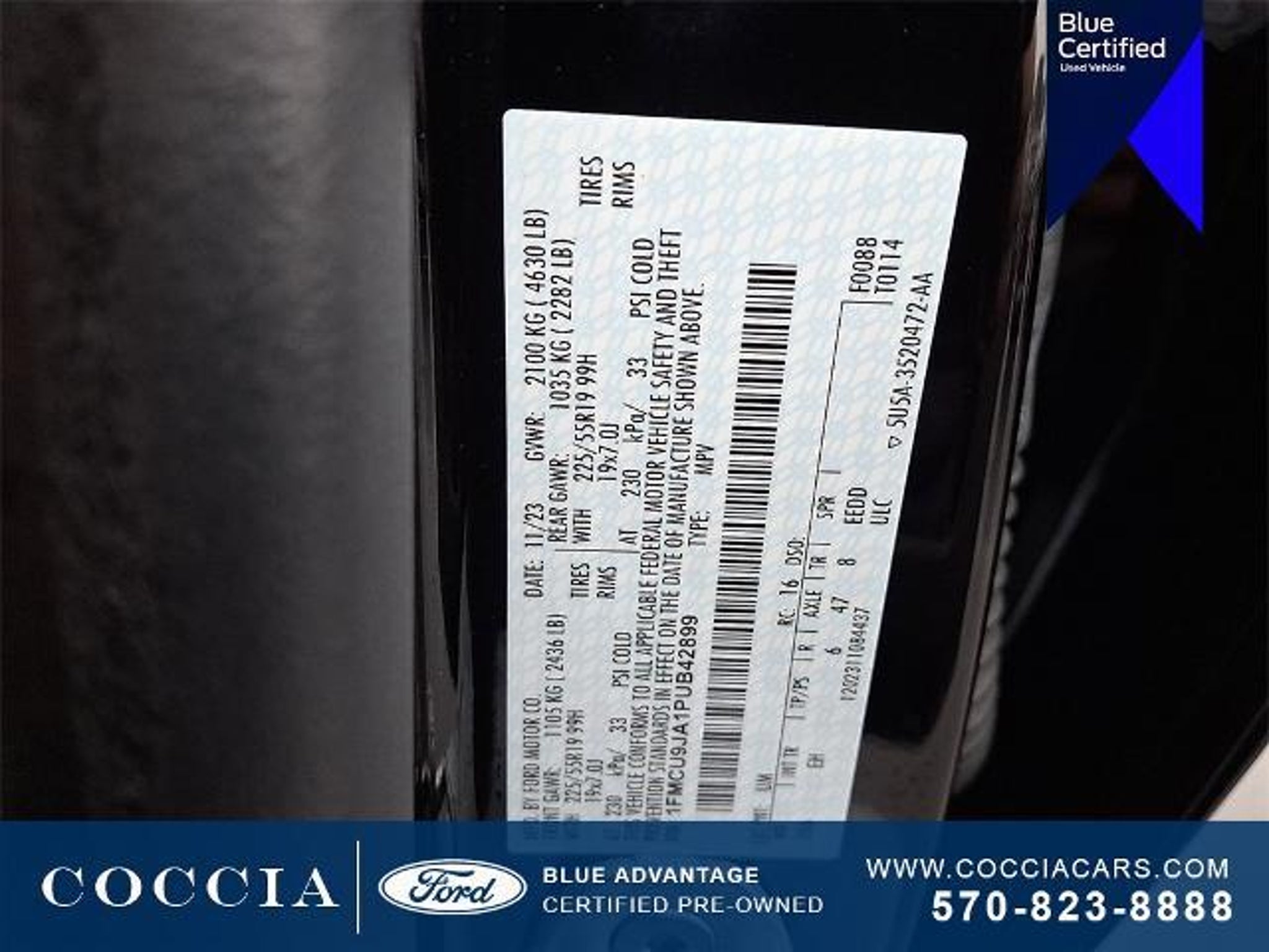 Owned Vehicles include a 3 month / 4000 mile Ford limited warranty coverage* 139 point inspection performed by a COCCIA factory trained technicians Vehicle History report 24/7 Roadside Assistance and 3 months of SirusXM Satellite Radio. COCCIA has been Family Owned and Operated for over 35 years. Certified. 4D Sport Utility AWD EcoBoost 2.0L I4 GTDi DOHC Turbocharged VCT 8-Speed Automatic 23/31 City/Highway MPG One Owner Clean Vehicle History Report Buy at Coccia and receive complimentary inspections for the life of your vehicle Complimentary car wash with every service visit Convenient Saturday service department hours available Family owned and operated for over 35 years! AWD 2.91 Axle Ratio 6 Speakers Air Conditioning Alloy wheels AM/FM radio: SiriusXM AM/FM Stereo Auto High-beam Headlights Auto-dimming Rear-View mirror Automatic temperature control Black Roof-Rack Side Rails Brake assist Bumpers: body-color Class II Trailer Tow Package Compass Delay-off headlights Driver door bin Driver vanity mirror Electronic Fuel Door Release Electronic Stability Control Equipment Group 601A Exterior Parking Camera Rear FordPass Connect Four wheel independent suspension Front Bucket Seats Front Center Armrest Front dual zone A/C Front fog lights Front reading lights Fully automatic headlights Garage door transmitter Heated ActiveX Trimmed Front Sport Contour Bucket Seats Heated door mirrors Heated front seats Heated steering wheel Illuminated entry Memory seat Navigation system: Connected Navigation Neutral Towing Capability Outside temperature display Overhead console Panic alarm Panoramic Vista Roof Passenger door bin Passenger vanity mirror Pedestrian Alert Sounder Power door mirrors Power driver seat Power Liftgate Power passenger seat Power steering Power windows Radio data system Rain sensing wipers Rear reading lights Rear seat center armrest Rear window defroster Rear window wiper Remote keyless entry Security system Speed control Speed-sensing steering Speed-Sensitive Wipers Split folding rear seat Spoiler Steering wheel mounted audio controls SYNC 4 w/Enhanced Voice Recognition Telescoping steering wheel Tilt steering wheel Traction control Trip computer Variably intermittent wipers Wheels: 19 Machined-Face Aluminum. Certification Program Details: Ford Blue Advantage: Blue Certified * 139 Point Inspection * Transferable Warranty * Vehicle History * Warranty Deductible: $100 * Roadside Assistance * Limited Warranty: 3 Month/4000 Mile (whichever comes first) after new car warranty expires or from certified purchase date * and 11000 FordPass Rewards Points to use toward first maintenance visit COCCIA is Family Owned Customer Driven.