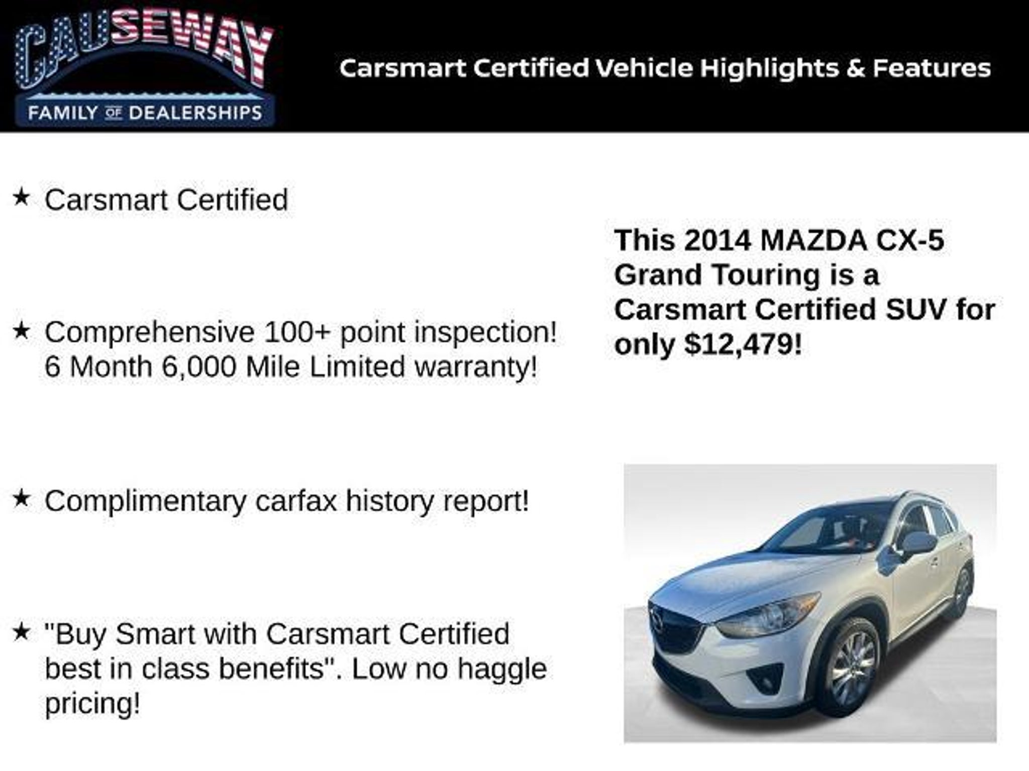 2014 Mazda CX-5 Grand Touring Crystal White Pearl Mica FWD 6-Speed Automatic SKYACTIVÂ 2.5L 4-Cylinder DOHC 16V Carsmart Certified, Comprehensive 100 point inspection! 6 Month 6,000 Mile Limited warranty!, Complimentary carfax history report!, Buy Smart with Carsmart Certified best in class benefits. Low no haggle pricing!. Recent Arrival! Odometer is 27220 miles below market average! 25/32 City/Highway MPG Certification Program Details: 6 month/6000 mile warranty, powertrain 100 point inspection, Free Carfax history report, available Extended Protection! Ask us how you can make money using our Causeway Referral Rewards Program!