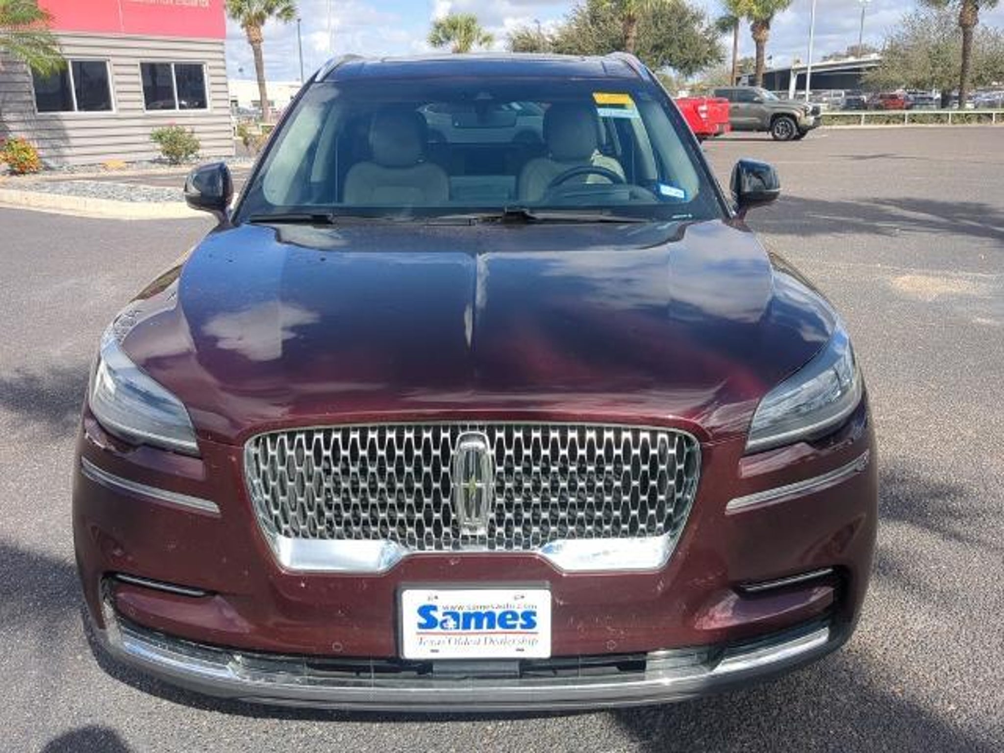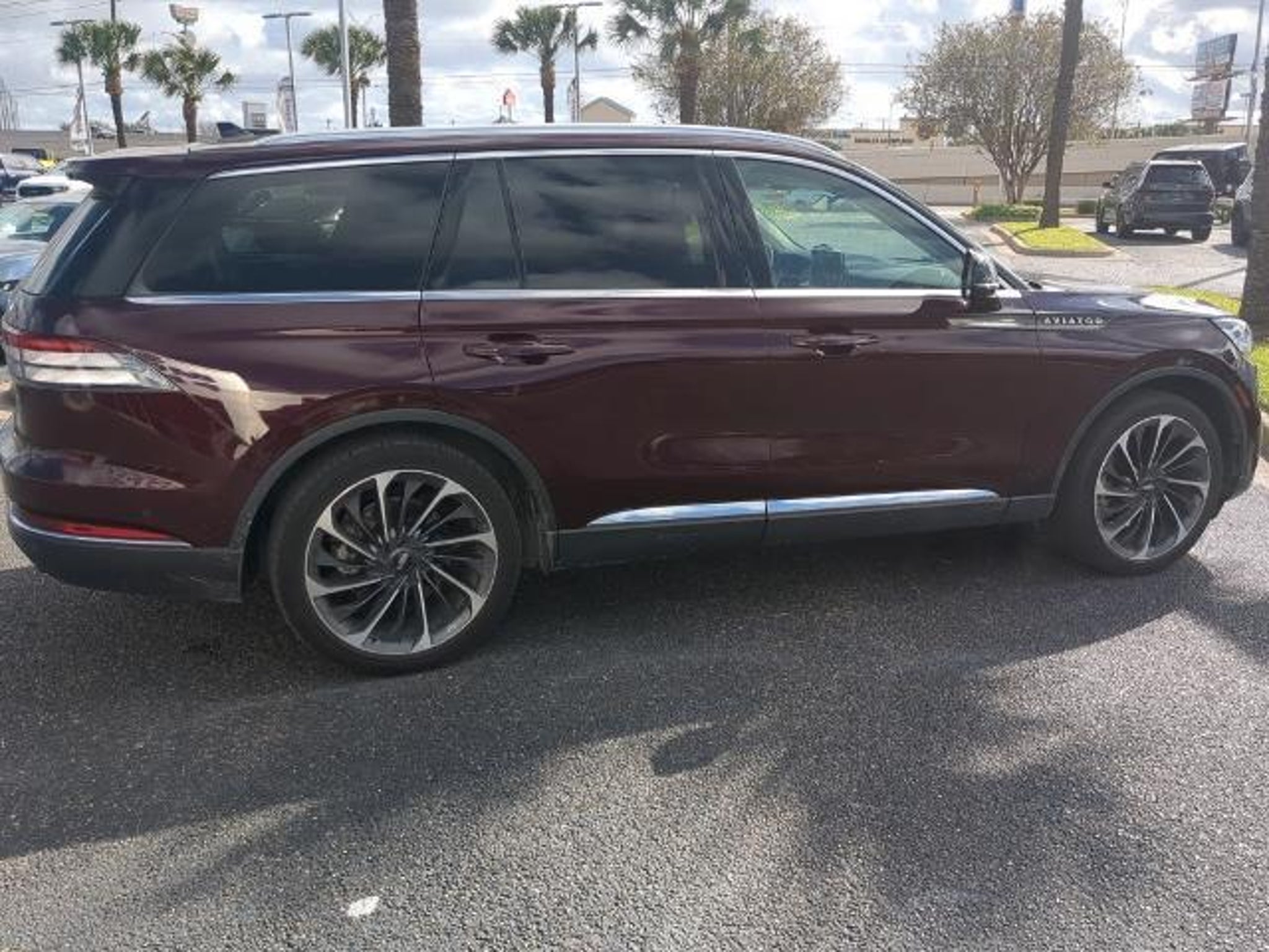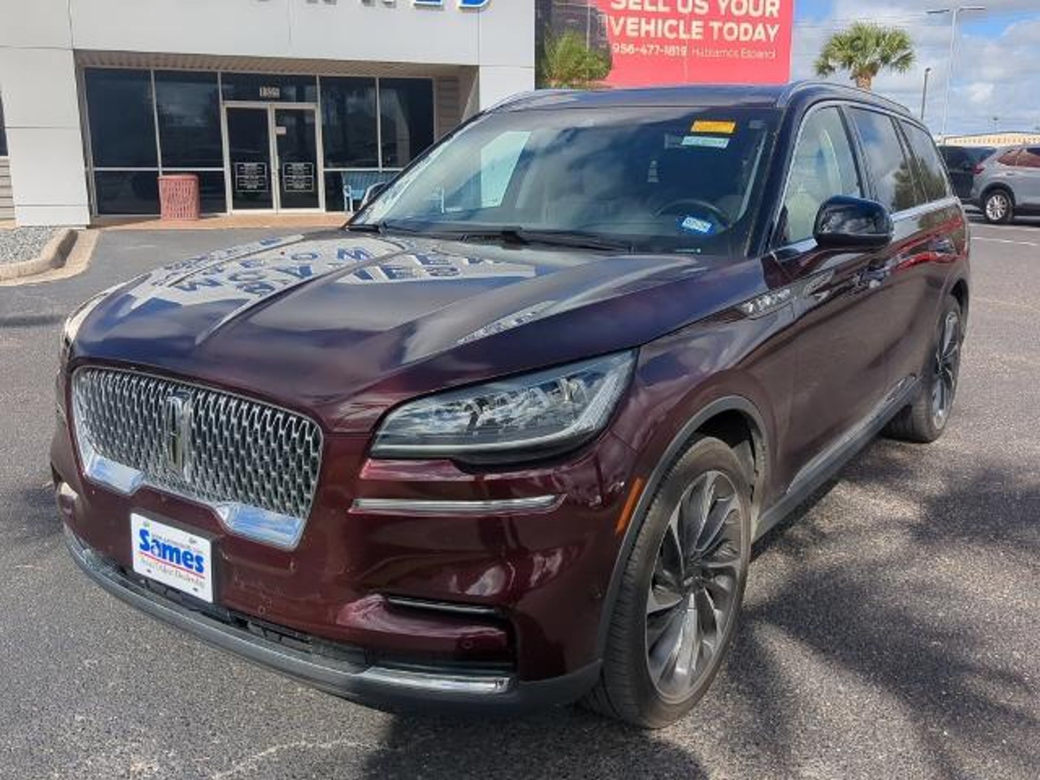 This 2022 Lincoln Aviator Reserve in Burgundy Velvet Metallic Tinted Clearcoat comes with the following features: 3.0L V6 10-Speed Automatic RWD Elements Package Plus (Auto Air Refresh, Auto Heated/Ventilated Driver & Passenger Seats, Heated Steering Wheel, Heated VisioBlade Wipers, and Heated/Ventilated 2nd Row Outboard Seats), Equipment Group 201A (Head-Up Display and Phone As A Key), Lincoln Co-Pilot360 1.5 Plus (Active Park Assist 2.0, Evasive Steering Assist, Intelligent Adaptive Cruise Control, and Reverse Brake Assist), Luxury Package (30-Way Perfect Position Seats w/Active Motion, Radio: Revel Ultima 3D Audio System w/28 Speakers, and Rear Door Sunshades), Sames Certified Certified, 14 Speakers, 3.58 Axle Ratio, 3rd row seats: split-bench, 4-Wheel Disc Brakes, ABS brakes, Air Conditioning, Alloy wheels, AM/FM radio: SiriusXM, Audio memory, Auto High-beam Headlights, Auto-dimming door mirrors, Auto-dimming Rear-View mirror, Automatic temperature control, Brake assist, Bumpers: body-color, Compass, Delay-off headlights, Driver door bin, Driver vanity mirror, Dual front impact airbags, Dual front side impact airbags, Electronic Stability Control, Emergency communication system, Four wheel independent suspension, Front anti-roll bar, Front Bucket Seats, Front Center Armrest, Front dual zone A/C, Front fog lights, Front reading lights, Fully automatic headlights, Garage door transmitter, Heated door mirrors, Heated front seats, HVAC memory, Illuminated entry, Knee airbag, Leather steering wheel, Low tire pressure warning, Memory seat, Navigation System, Occupant sensing airbag, Outside temperature display, Overhead airbag, Overhead console, Panic alarm, Passenger door bin, Passenger vanity mirror, Power door mirrors, Power driver seat, Power Liftgate, Power moonroof: Panoramic Vista Roof, Power passenger seat, Power steering, Power windows, Premium Lthr Heated/Ventilated Fnt Captain's Chairs, Radio data system, Radio: Revel AM/FM Audio System w/14 Speakers, Rain sensing wipers, Rear air conditioning, Rear anti-roll bar, Rear audio controls, Rear dual zone A/C, Rear reading lights, Rear window defroster, Rear window wiper, Remote keyless entry, Security system, SiriusXM Radio, Speed control, Speed-Sensitive Wipers, Split folding rear seat, Spoiler, Steering wheel memory, Steering wheel mounted A/C controls, Steering wheel mounted audio controls, SYNC 3 Communication & Entertainment System, Tachometer, Telescoping steering wheel, Tilt steering wheel, Traction control, Trip computer, Turn signal indicator