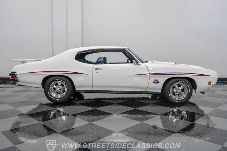 HIGHLIGHTS: PHS Certified Judge Factory Correct Polar White Repaint Judge Decals Period Correct Ram Air III 400 CID V8 Quadrajet Four Barrel Four Speed Manual 3.55 Posi Rear End Power Front Disc Brakes Power Steering Factory Correct Blue Vinyl Center Console with Hurst Shifter Correct Factory Dash Correct Factory Gauges Hood Tach Wood Rimmed Steering Wheel on Tilt Column Jensen AM/FM/Cassette