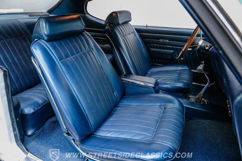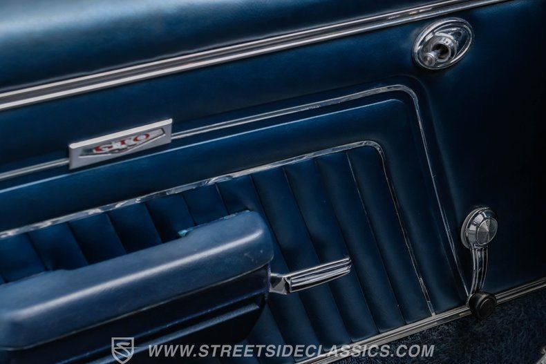 Inside, we find a factory-correct Blue vinyl interior, complemented by a touch of woodgrain trim along the dash. A three-pod Rally gauge cluster sits front and center of the power-assisted (and rare) wooden three-spoke steering wheel, featuring (from left to right) a multi-purpose fuel/oil/temperature readout, a big 140 mph speedometer, and a unique and equally large analog clock closest to the passenger side. If you're unfamiliar with the GTO, you might be searching for the tach, but fear not, you need only look just above the dashboard and out the windshield to find an ingenious hood-mounted 8,000 rpm external tachometer, which not only looks unbelievably cool but makes it that much easier to keep your eyes on the fast-approaching road while still being able to hit that perfect 1-2 shift courtesy of a Hurst T-bar handle. A center console separates a pair of bucket seats, while at the same time, A Jensen AM/FM/Cassette stereo offers an optional soundtrack if, for some reason, you ever get tired of listening to that rumble emanating from the dual exhaust just beneath you.