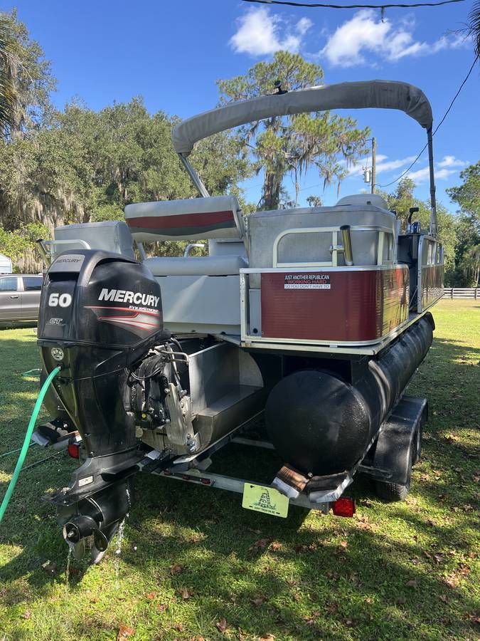 2022 16 ft Tri-Toon Pontoon Tracker Boat This 16-foot tri-toon pontoon boat was completely redone in 2022 and is powered by a 2015 Mercury 60HP Command Thrust outboard with 574 hours. The custom third center tube adds approximately 1,600 lbs of additional buoyancy and includes a built-in 25-gallon fuel tank, providing excellent stability and shallow draft performance. The boat is fully turnkey and includes a galvanized dual-axle trailer with new tires and bearings. Additional features include Garmin depth and sonar, sound system with subwoofer, underwater lighting, LED headlights, and top speeds of approximately 19 mph light and 17 mph loaded. This boat has been meticulously maintained and is ready for immediate enjoyment. Located in Hawthorne, FL 32640 For more information, please call 833-265-6113 and mention ID 201039