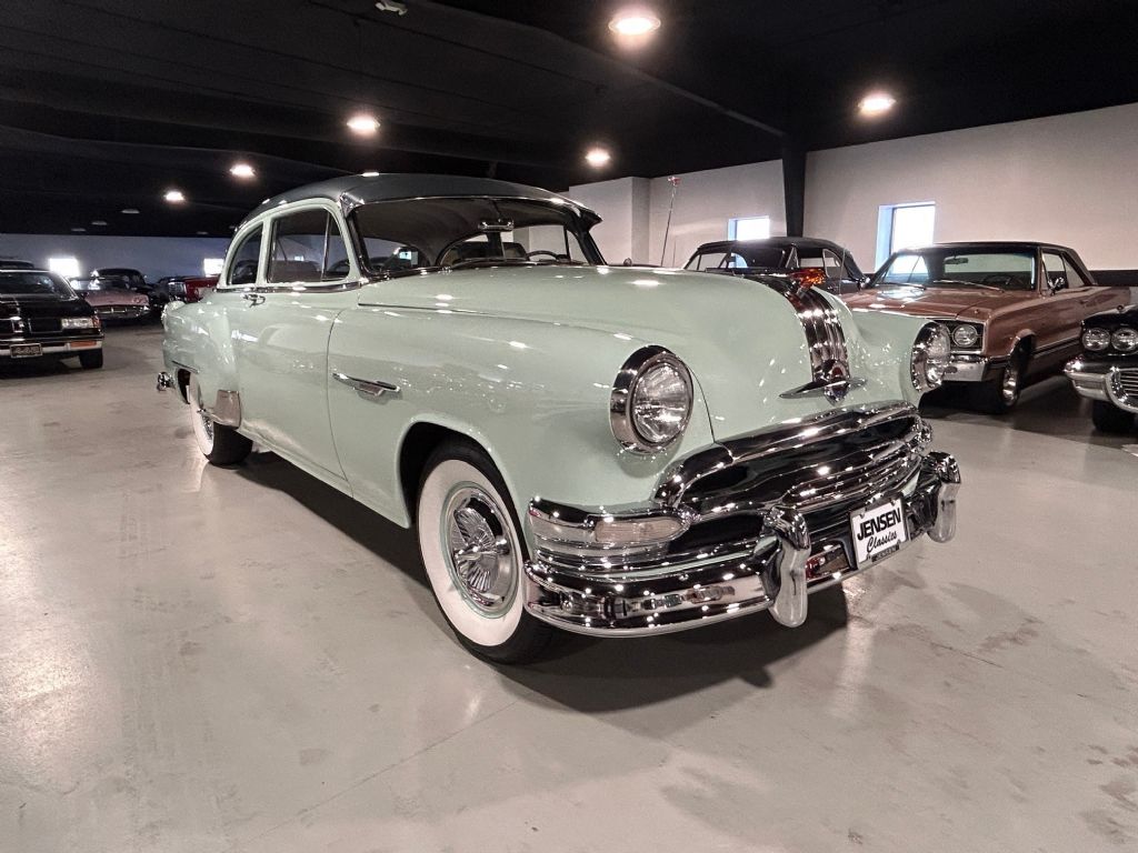 1954 Pontiac Chieftain • Ultra high-end restoration • 239 inline 6-cylinger engine • 3-speed manual transmission • Sun visor • Fender skirts • Illuminated Indian hood mascot • Pushbutton radio • Traffic light viewer • New Coker Whitewall radial tires • Full size wheel covers • Turnkey condition (excluding radio)