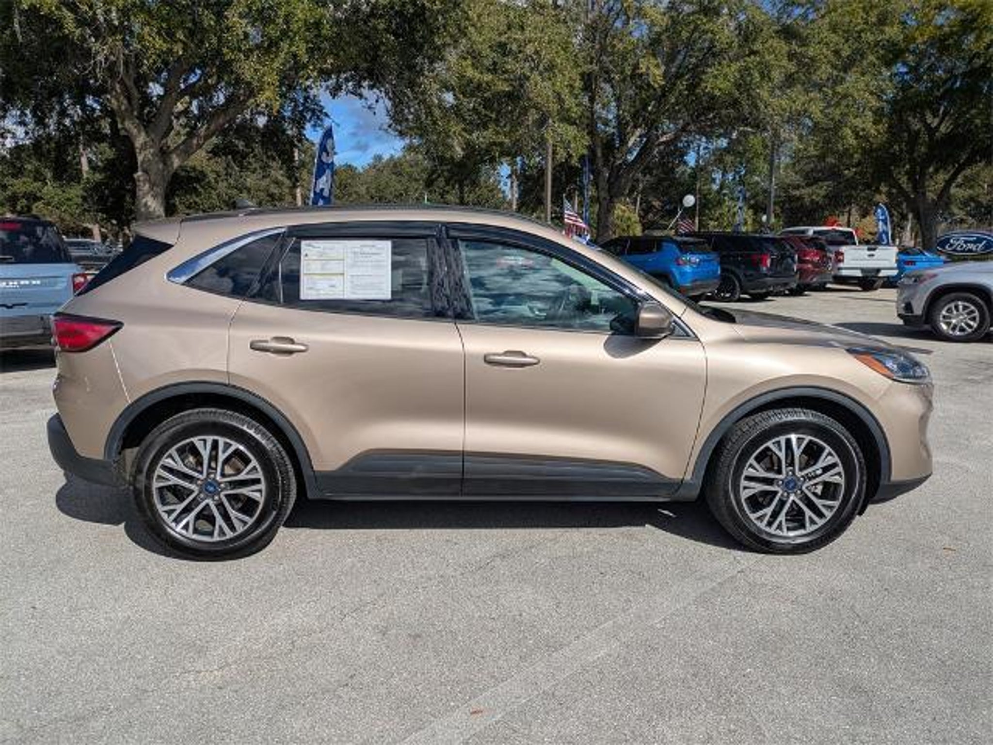 Recent Arrival! 2020 Ford Escape SEL AWD 1.5L EcoBoost 8-Speed Automatic Desert Gold Metallic AWD. CARFAX One-Owner. Odometer is 12680 miles below market average! 26/31 City/Highway MPG Equipped with Equipment Group 301A, Ford Co-Pilot360 Assist (Adaptive Cruise Control w/Stop-and-Go and Voice-Activated Touchscreen Navigation System), AWD, 18 Machined-Face Aluminum Wheels, 3.81 axle ratio, 4-Wheel Disc Brakes, 6 Speakers, ABS brakes, Air Conditioning, Alloy wheels, AM/FM radio: SiriusXM, AM/FM Stereo, Auto High-beam Headlights, Automatic temperature control, Brake assist, Bumpers: body-color, Compass, Delay-off headlights, Driver door bin, Driver vanity mirror, Dual front impact airbags, Dual front side impact airbags, Electronic Stability Control, Emergency communication system: SYNC 3 911 Assist, Exterior Parking Camera Rear, FordPass Connect, Four wheel independent suspension, Front anti-roll bar, Front Bucket Seats, Front Center Armrest, Front fog lights, Front reading lights, Fully automatic headlights, Heated ActiveX Front Sport Contour Bucket Seats, Heated door mirrors, Heated front seats, Heated steering wheel, Illuminated entry, Knee airbag, Leather steering wheel, Low tire pressure warning, Memory seat, Occupant sensing airbag, Outside temperature display, Overhead airbag, Overhead console, Panic alarm, Passenger door bin, Passenger vanity mirror, Power door mirrors, Power driver seat, Power Liftgate, Power steering, Power windows, Radio data system, Rear anti-roll bar, Rear reading lights, Rear seat center armrest, Rear window defroster, Rear window wiper, Remote keyless entry, Speed control, Speed-sensing steering, Speed-Sensitive Wipers, Split folding rear seat, Spoiler, Steering wheel mounted audio controls, SYNC 3 Communications & Entertainment System, Tachometer, Telescoping steering wheel, Tilt steering wheel, Traction control, Trip computer, and Variably intermittent wipers. Palm Coast Ford, We're Not That Far! Free deliveries within 200 miles. Call us today to experience the difference, (386) 447-3380.