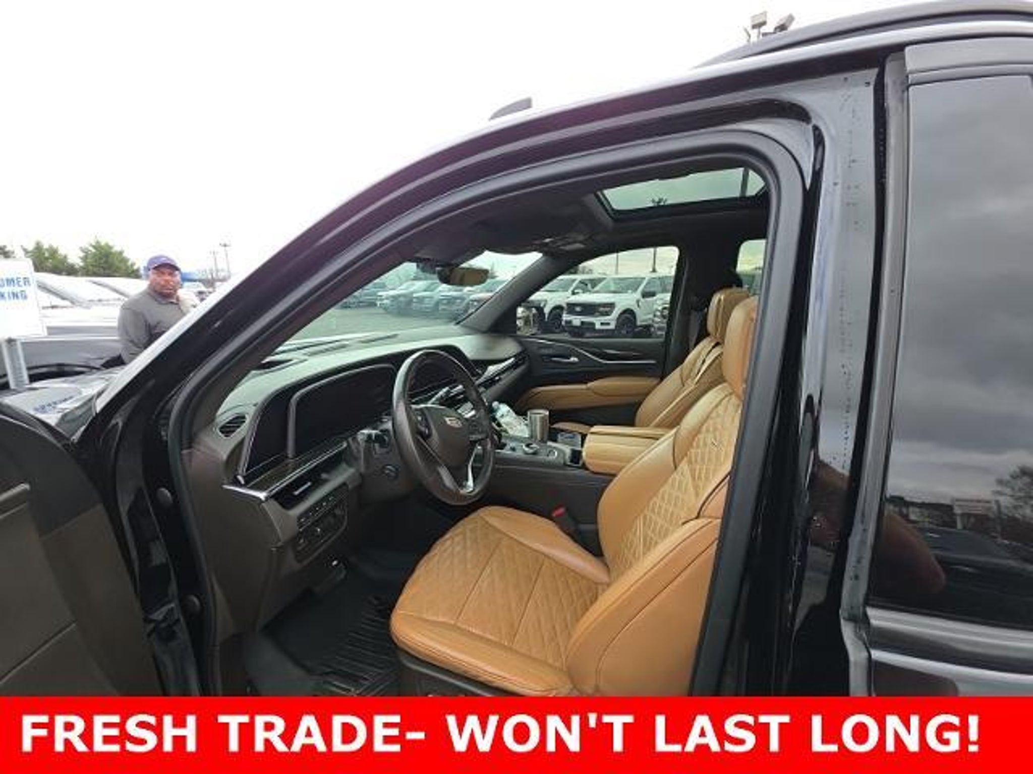 2022 Cadillac Escalade Sport Escalade Sport, 4D Sport Utility, 6.2L V8, 10-Speed Automatic, 4WD, Black Raven, Brandy w/Very Dark Atmosphere Accents w/Full Leather Seats w/Faceted Quilting, 16.9 Diagonal OLED Infotainment Screen, 19 Speakers, 2-Presets Memory For Driver Seat Adjuster, 3.23 Axle Ratio, 3rd row seats: split-bench, 4-Wheel Disc Brakes, 8-Way Power Driver Seat Adjuster, 8-Way Power Front Passenger Seat Adjuster, ABS brakes, Adaptive Cruise Control, Adaptive suspension, Air Conditioning, AKG Studio 19-Speaker Audio System, Alloy wheels, AM/FM radio: SiriusXM with 360L, Apple CarPlay/Android Auto, Audio memory, Auto High-beam Headlights, Auto tilt-away steering wheel, Auto-dimming door mirrors, Auto-dimming Rear-View mirror, Automatic Seat Belt Tightening, Automatic Stop/Start, Automatic temperature control, Body-Color Door Handles, Brake assist, Bumpers: body-color, Compass, Cruise Control, Delay-off headlights, Door Lock & Latch Shields, Driver door bin, Driver vanity mirror, Dual front impact airbags, Dual front side impact airbags, Electronic Limited-Slip Differential, Electronic Stability Control, Emergency communication system: OnStar and Cadillac connected services capable, Enhanced Automatic Emergency Braking, Enhanced Automatic Parking Assist, Four wheel independent suspension, Front anti-roll bar, Front Bucket Seats, Front Center Armrest w/Storage, Front dual zone A/C, Front reading lights, Fully automatic headlights, Garage door transmitter, Glass Breakage Sensor, HD Radio, Heads-Up Display, Heated & Ventilated Driver & Front Passenger Seats, Heated and Cooled Seats, Heated door mirrors, Heated Driver & Front Passenger Seats, Heated rear seats, Heated steering wheel, Hitch Guidance w/Hitch View, Illuminated entry, Integrated Trailer Brake Controller, Leather Seating Surfaces w/Precision Perf Inserts, Leather steering wheel, Low tire pressure warning, Magnetic Ride Control Suspension, Memory seat, Navigation System, Not Equipped w/4-Way Driver & Fr Pass Pwr Lumbar, Not Equipped w/Steering Column Lock, Occupant sensing airbag, Outside temperature display, Overhead airbag, Overhead console, Panic alarm, Passenger door bin, Passenger vanity mirror, Power door mirrors, Power driver seat, Power Liftgate, Power moonroof, Power Panoramic Tilt-Sliding Sunroof, Power passenger seat, Power steering, Power windows, Preferred Equipment Group 1SC, Puddle Lamps w/Cadillac Crest (LPO), Radio data system, Radio: AM/FM/SiriusXM w/Navigation, Rain sensing wipers, Rear air conditioning, Rear anti-roll ba