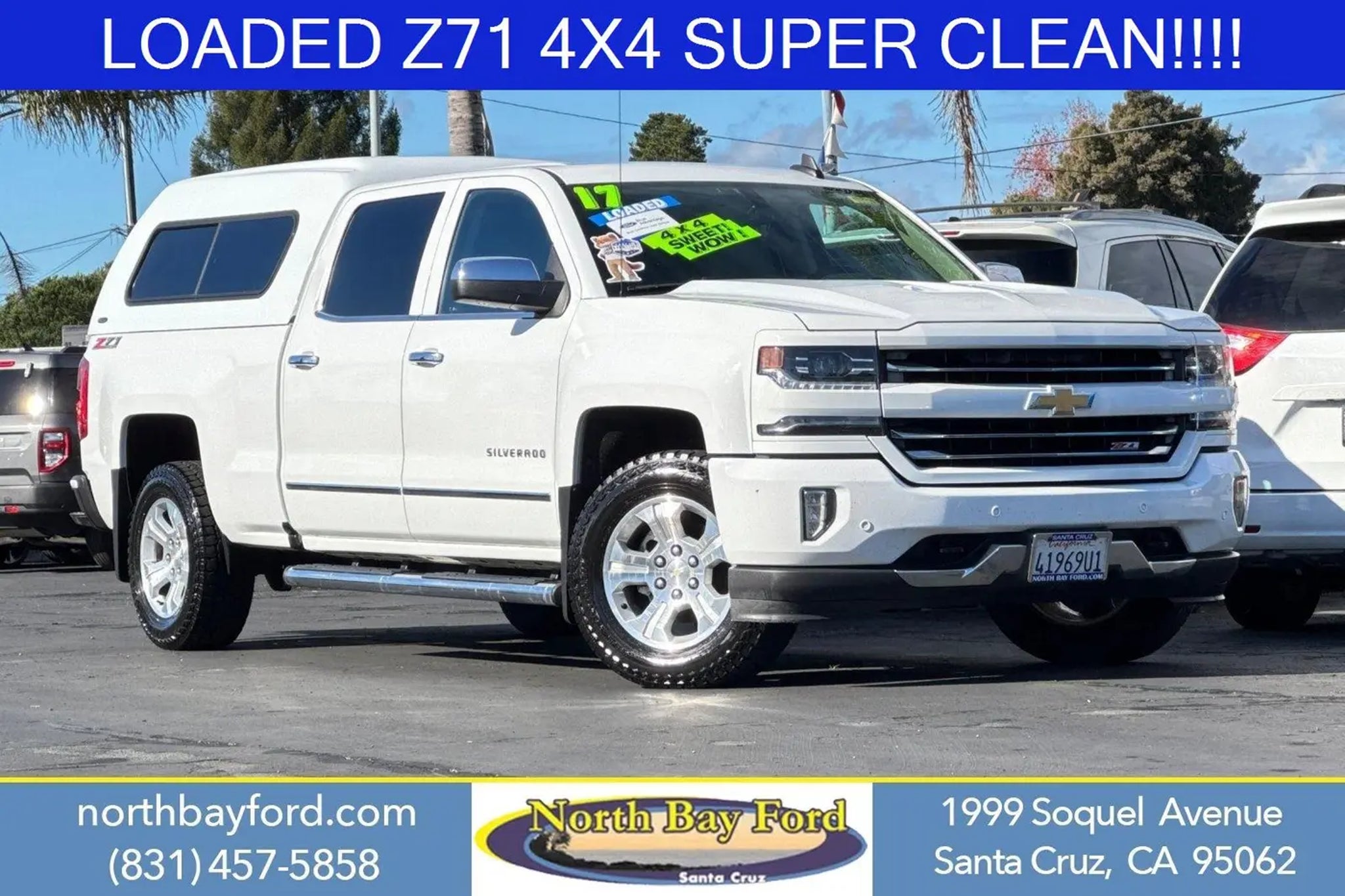Why Buy from North Bay Ford ? When you choose this 2017 Chevrolet Silverado 1500 LTZ from North Bay Ford|you're not just buying a used car - you're investing in quality, reliability, and peace of mind. Located in Santa Cruz,CA|we're proud to offer the best selection of certified pre-owned Chevroletvehicles and top-tier used cars in our local market. Here's why savvy buyers trust us: Transparent Pricing : At $$27,950|what you see is what you pay. Certified Quality: Every vehicle, like this 2017 Chevrolet Silverado 1500 LTZ|undergoes a rigorous multi-point inspection to ensure it meets our high standards. Customer-First Service: Our award-winning team treats you like family, backed by an excellent customer satisfaction rating. Convenience: From complimentary pick-up and delivery for service and sales, to easy financing options, we make car buying stress-free. Also for your convenience: we have our service department open 24 hours a day and 7 days a week. No Accidents! LTZ Plus Package ($1,165 value) Power Adjustable Pedals Ultrasonic Front and Rear Park Assist Bose Speaker System Leather Wrapped Heated Steering Wheel Preferred Equipment Group 2LZ Power Windows with Driver Express Up Power Sliding Rear Window Rear 60/40 Folding Bench Seat (folds Up) Remote Locking Tailgate Deep-Tinted Glass Remote Keyless Entry Rear Wheelhouse Liners Color-Keyed Carpeting with Rubberized Vinyl Floor Mats Chrome Bodyside Moldings Bluetooth For Phone Remote Vehicle Starter System Spray-On Pickup Box Bed Liner Dual-Zone Automatic Climate Control Auto-Dimming Inside Rearview Mirror Driver and Front Passenger Illuminated Vanity Mirrors Chrome Cap Power-Adjustable Heated Outside Mirrors Chrome Mirror Caps Chrome Door Handles Heavy-Duty Rear Locking Differential 3.42 Rear Axle Ratio Body-Color Headlamp Bezels AM/FM 8 Diagonal Color Touch Screen Radio 150 Amp Alternator 110-Volt AC Power Outlet Auxiliary External Transmission Oil Cooler 5.3L EcoTec3 V8 Engine LED Taillamps with Signature 8-Speed Automatic Transmission with Overdrive Manual Tilt/telescoping Steering Column Leather Wrapped Steering Wheel with Cruise Controls 4WD Active Transfer Case EZ Lift and Lower Tailgate P265/70R17 AS BW Spare Tire Thin Profile LED Fog Lamps Single Slot CD/MP3 Player Body-Color Grille Surround HD Radio 4.2 Diagonal Color Display Driver Info Center OnStar 3 Months Guidance Plan Universal Home Remote Steering Wheel Audio Controls 6 Speaker Audio System Theft Deterrent System (unauthorized Entry) Rear Vision Camera Front Chrome Bumper Front Body-Color Bumper Rear Chrome Bumper Body Color Rear Bumper with Cornersteps OnStar with 4G LTE Off-Road Suspension Package Trailering Package EMISSIONS, CALIFORNIA STATE REQUIREMENTS, ENGINE, 5.3L ECOTEC3 V8 WITH ACTIVE FUEL MANAGEMENT, DIRECT INJECTION AND VARIABLE VALVE TIMING, TRANSMISSION, 8-SPEED AUTOMATIC, ELECTRONICALLY CONTROLLED, REAR AXLE, 3.42 RATIO, WHEELS, 18 X 8.5 (45.7 CM X 21.6 CM) BRIGHT-MACHINED ALUMINUM, TIRES, P265/65R18 ALL-TERRAIN, BLACKWALL, PAINT, SOLID, SUMMIT WHITE, SEATS, FRONT FULL-FEATURE LEATHER-APPOINTED BUCKET WITH (KA1) HEATED SEAT CUSHIONS AND SEAT BACKS, COCOA/DUNE, PERFORATED LEATHER-APPOINTED SEAT TRIM, AUDIO SYSTEM, CHEVROLET MYLINK RADIO WITH 8 DIAGONAL COLOR TOUCH-SCREEN, AM/FM STEREO, LTZ PLUS PACKAGE, ENGINE BLOCK HEATER, TRAILER BRAKE CONTROLLER, INTEGRATED, LPO, MOLDED SPLASH GUARDS, BLACK, LICENSE PLATE KIT, FRONT, BOSE SOUND WITH 6 SPEAKER SYSTEM, WIRELESS CHARGING, SEATING, HEATED AND VENTED PERFORATED LEATHER-APPOINTED FRONT BUCKET, CONSOLE, FLOOR MOUNTED, RECONFIGURABLE, LPO, ALL-WEATHER FLOOR MATS, FRONT AND REAR ON CREW CAB AND DOUBLE CAB, STEERING WHEEL, HEATED, LEATHER-WRAPPED AND COLOR-KEYED, PEDALS, POWER-ADJUSTABLE, FRONT AND REAR PARK ASSIST, ULTRASONIC Convenience Cruise control with steering wheel mounted controls. Set it and forget it. Road trips used to be stressful, until cruise control set the pace. Simply set the desired speed using the steering wheel mounted controls and it will maintain that speed without driver intervention. This can help minimize driver fatigue and improve overall fuel economy. Resting your right foot is right at your fingertips thanks to cruise control with steering wheel mounted controls. Smart device and keyfob engine start control - Phone ahead. Remotely start your vehicle's engine from the key fob or your smart device, ensuring your ride is ready to go when you get in. Now you can stay comfortable inside while your vehicle gets comfortable outside,thanks to Smart device and Keyfob engine start control. Safety and Security Rear camera - Watching your back! The rear camera helps you see obstacles and hazards you otherwise couldn't by showing enhanced images of what is behind you. The rear camera is an extra set of eyes that's both convenient and safe. Brake assist - Stop right there. Something jumps out into the middle of the road and you need to stop now! With brake assist, you will. It uses the speed of the brake pedal's travel to sense panic braking, then applies all available power to boost your stopping power. Brake assist can stop the accident before it is one. Technology and Telematics Mobile hotspot - WiFi on the fly. Connect your devices to the Internet through your vehicle's private mobile hotspot and take the internet wherever your journey takes you, without eating up your data allowance. Find the hotspot with mobile hotspot. Ready to drive home this 2017 Chevrolet Silverado 1500 LTZ today at North Bay Ford or Call us at to schedule your visit. Don't miss out - at this price $$27,950 it won't last long!