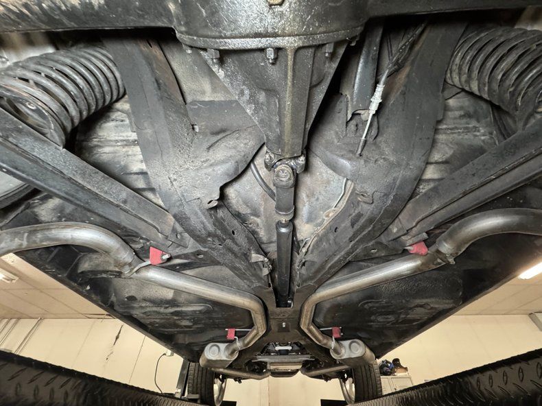 Clean and dry underneath with minimal surface rust but some swiss cheese on the trunk floor. Power brakes are behind the big wheels with disc in front and drums in back and dual exhaust run from the header through stock style mufflers and dumping just in front of each rear wheel. Suspension includes coil springs front and rear with a 3 link and a panhard bar helping out in back.
