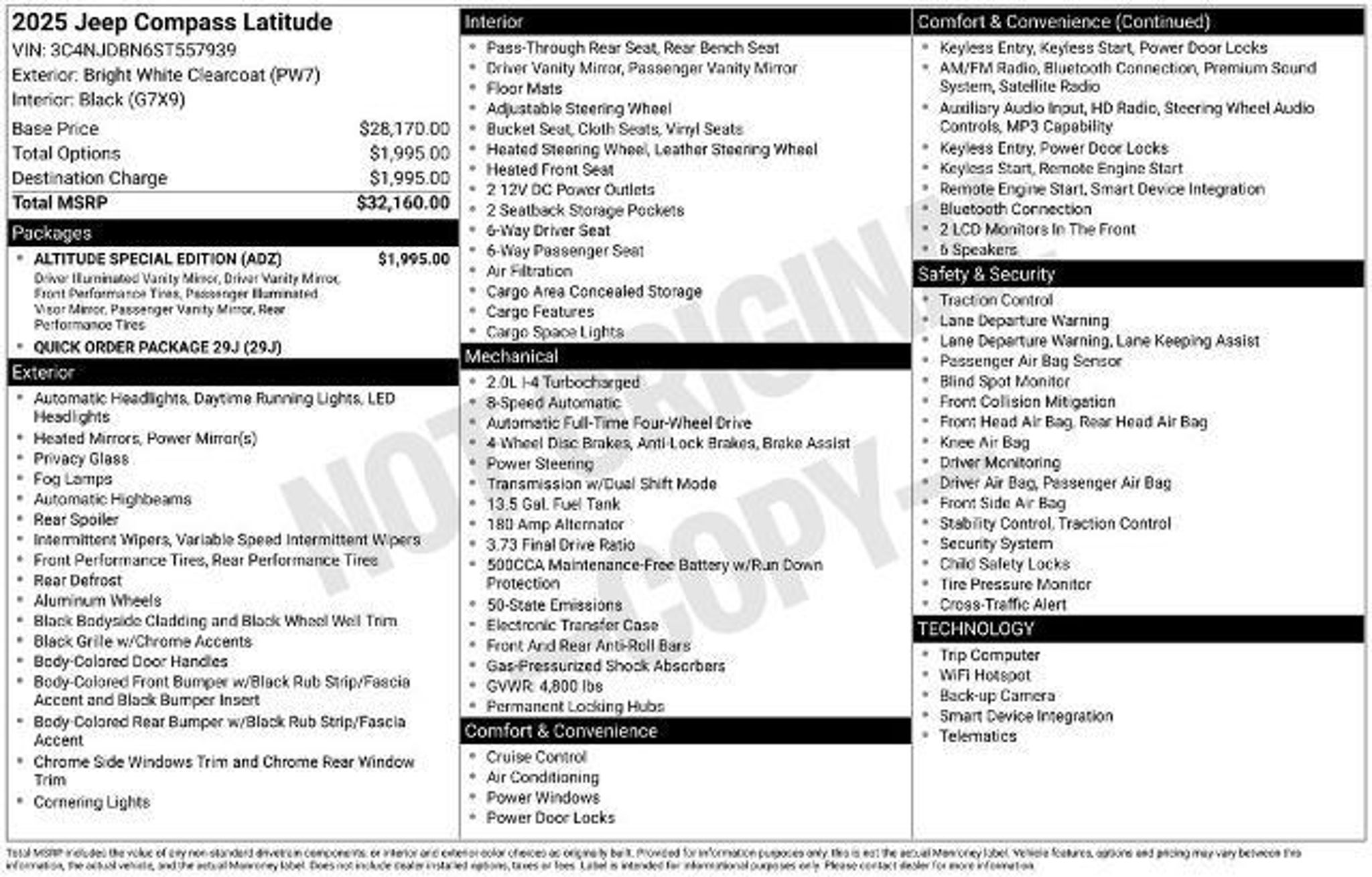 At Mullinax there are NO DEALER FEES ! That SAVES you $900 over our largest competitors every day. This 2025 Jeep Compass Latitude is equipped with a host of impressive features that make it an exceptional choice for the discerning driver. Boasting an Altitude Special Edition package, this Compass stands out with its Gloss Black Surround/Neutral Gray Rings, 10.1 Touchscreen Display, Black Day Light Opening Moldings, Wheels: 18 x 7 Gloss Black Painted Aluminum, Neutral Gray Exterior Badging, Piano Black Interior Accents, and Sliding Sun Visors with Illuminated Mirrors. "¢ Altitude Special Edition "¢ Quick Order Package 29J "¢ 6 Speakers "¢ AM/FM radio: SiriusXM "¢ Premium audio system: UConnect 5 "¢ Radio: Uconnect 5 w/8.4 Display "¢ Air Conditioning "¢ Rear window defroster "¢ Power steering "¢ Power windows "¢ Remote keyless entry "¢ Steering wheel mounted audio controls This Jeep Compass Latitude is more than just a stylish and well-equipped SUV; it's a testament to Jeep's commitment to quality and performance. Powered by a 2.0L I4 DOHC engine and equipped with an 8-Speed Automatic transmission and 4WD, this Compass delivers an impressive blend of efficiency and capability, with an EPA-estimated 24 city/32 highway MPG. The Ford Blue Advantage Program helps provide some peace of mind when buying a previously owned vehicle. Driving a Ford Blue Advantage: Blue Certified used vehicle means driving with the knowledge and confidence that the vehicle you purchased has been inspected and comes with manufacturer-backed limited warranty coverage, 90-day/4,000-mile Comprehensive Limited Warranty coverage (whichever comes first),14-day/1,000-mile Money Back Guarantee,139 points of inspection by certified technicians,11,000 FordPass Rewards Points to use toward scheduled maintenance visits or other rewards. JUST ADD TAX! At Mullinax, there are NO DEALER FEES! We save you over $900 vs. Our largest competitors every day! Over 3,500 vehicles to choose from!