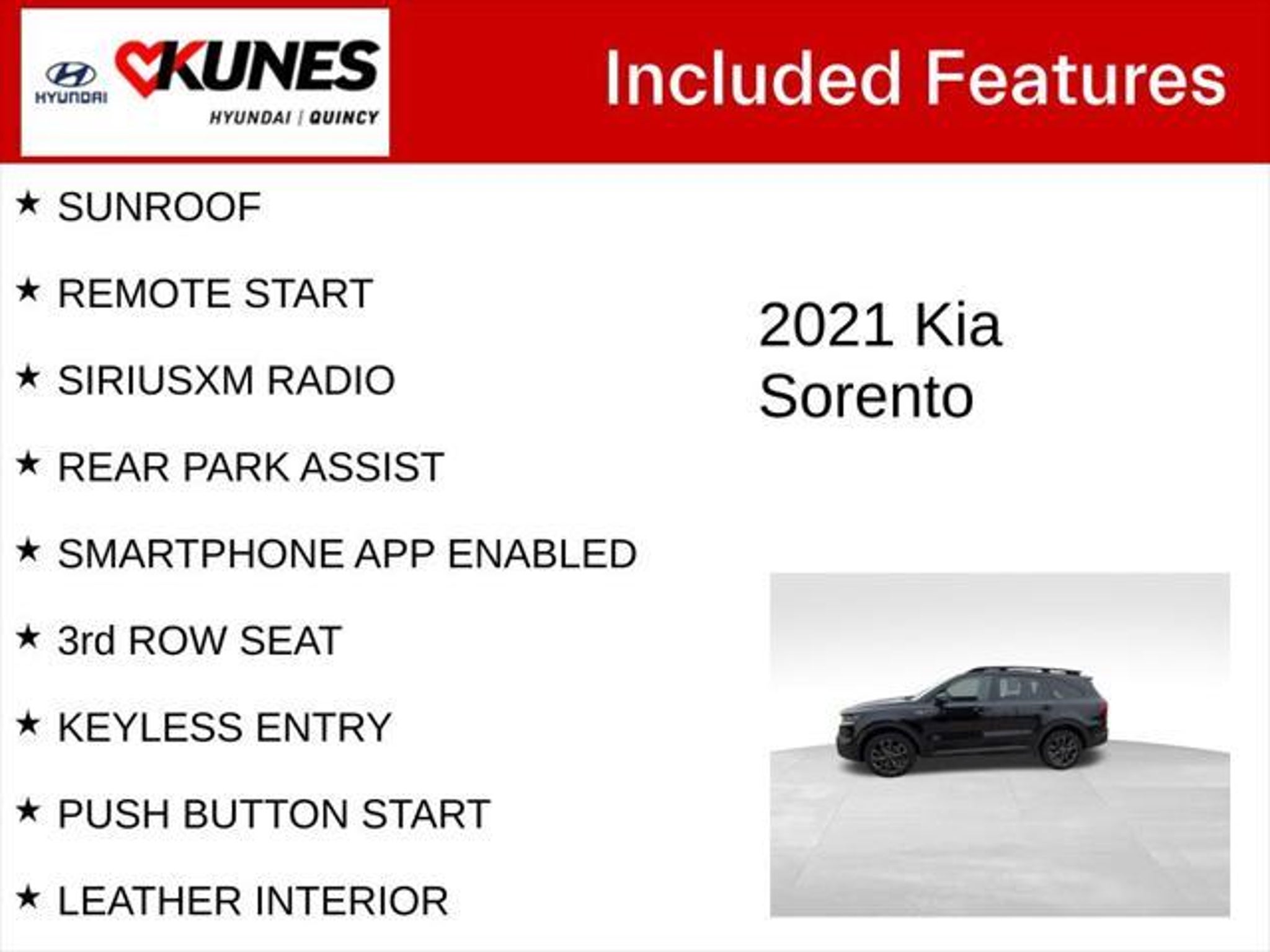 Details > 2021 Kia Sorento AWD SX 4DR SUV For Sale in Quincy, IL Private Party Sellers Click here to place your ad now! You auta tell them you saw the ad in AutaBuy when you call or email. 1/30 2/30 3/30 4/30 5/30 6/30 7/30 8/30 9/30 10/30 11/30 12/30 13/30 14/30 15/30 16/30 17/30 18/30 19/30 20/30 21/30 22/30 23/30 24/30 25/30 26/30 27/30 28/30 29/30 30/30 View 30 Photos View All Add to My Garage Parked in Your Garage! Kunes Country Hyundai of Quincy Contact Seller: I would like to: Make Offer Check Availability Ask A Question Request More Photos Check Financing Options Send a copy of this message to me Add this listing to my garage Send to Mobile Mileage 41,848 Exterior Color Ebony Black Interior Color Black Doors 4 Engine 2.5L I4 Transmission 8 Speed Auto Stock # 14T1389A VIN 5XYRKDLF7MG029469 Estimated Monthly Payment $496 mo Apply Now J.J. Best Banc & Co. 2021 Kia Sorento AWD SX 4DR SUV Description: Kunes Country Hyundai Of Quincy · Mileage: 41,848 · Color: Ebony Black Price: $28,493. Mileage 41,848 Exterior Color Ebony Black Interior Color Black Doors 4 Engine 2.5L I4 Transmission 8 Speed Auto Stock # 14T1389A VIN 5XYRKDLF7MG029469 Estimated Monthly Payment $496 mo Apply Now J.J. Best Banc & Co. Add to My Garage Parked in Your Garage! Message Seller Kunes Country Hyundai of Quincy Contact Seller: I would like to: Make Offer Check Availability Ask A Question Request More Photos Check Financing Options Send a copy of this message to me Add this listing to my garage Offered for sale by Kunes Country Hyundai of Quincy QUINCY, IL Price: $28,493. Offered for sale by Kunes Country Hyundai of Quincy QUINCY, IL [entire inventory] Ask Auta Intelligence How easy are parts to find for this model? What trim levels were available for this model? What transmission options did these offer? What factory options were available on this model? Tell me the history on this model When was this model first introduced? What colors did these come in? What safety features does this model offer? Can you show me more suvs for a similar price? How far is this from me? What engine options did these come with? What kind of mileage do these get? How many of these were produced? What does this VIN number tell me? Do you have a similar car to sell? List It Now! Questions about this car? Ask Auta Intelligence for production numbers, available options, etc. · Subscribe to AutaBuy! · Send a Gift Subscription Notice to a Friend