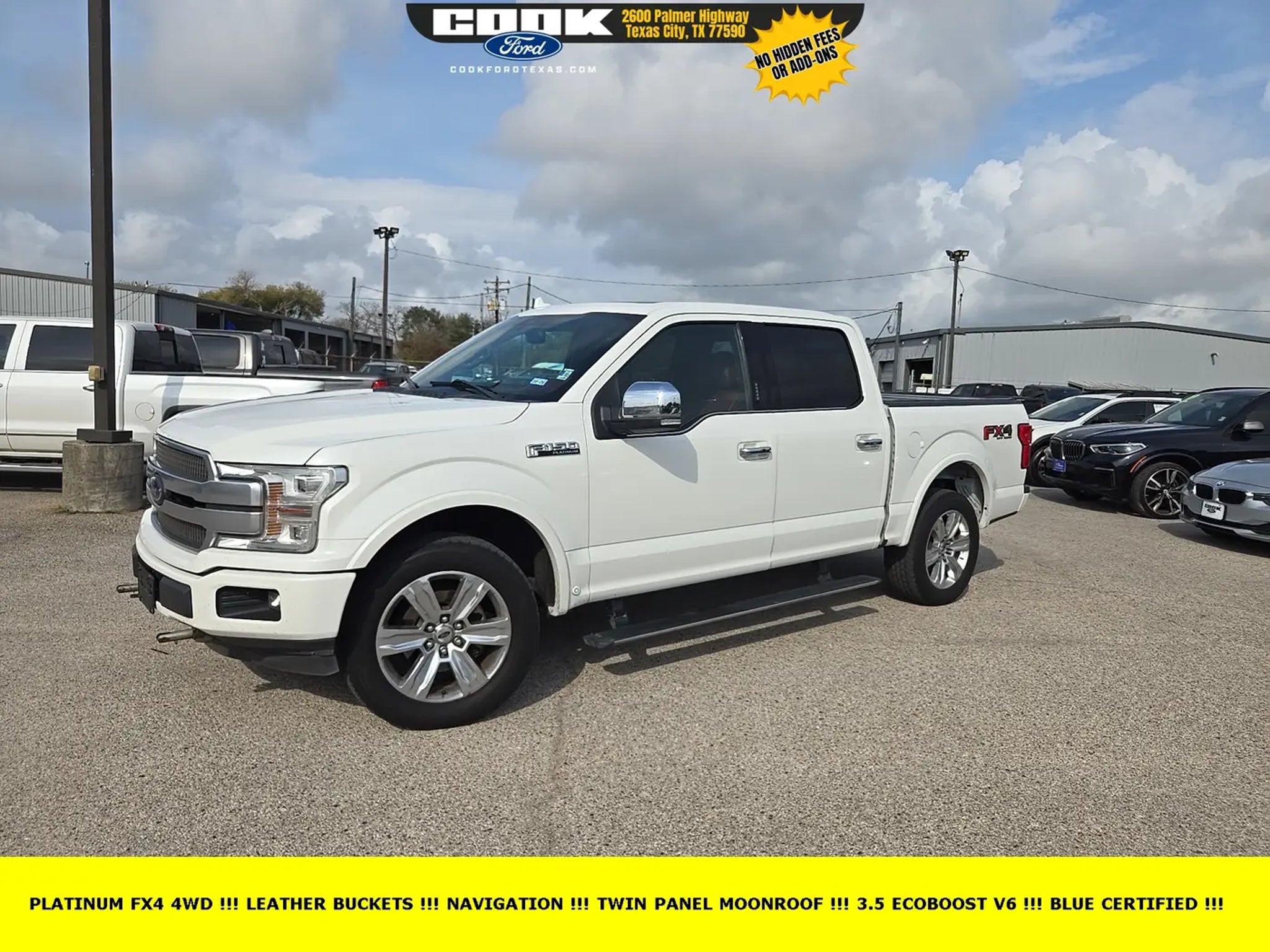 PLATINUM 4WD PACKAGE LEATHER BUCKET SEATS NAVIGATION TWIN PANEL MOONROOF HEATED AND COOLED FRONT SEATS MAX TRAILER TOW PACKAGE FX4 OFF ROAD PACKAGE TECHNOLOGY PACKAGE 3.5 ECOBOOST V6 BLUE CERTIFIED ONE OWNER CLEAN VEHICLE HISTORY REPORT AND PRICED BELOW MARKET Certified. Star White Metallic Tri-Coat 2020 Ford F-150 Platinum 4WD 10-Speed Automatic 3.5L V6 EcoBoost 20 Polished Aluminum Wheels, 4x4 FX4 Off-Road Bodyside Decal, Class IV Trailer Hitch Receiver, Electronic Locking w/3.55 Axle Ratio, Engine Oil Cooler, Equipment Group 701A Luxury, Extended Range 36 Gallon Fuel Tank, FX4 Off-Road Package, GVWR: 7,050 lbs Payload Package, Hill Descent Control, Integrated Trailer Brake Controller, Max Trailer Tow Package, Navigation System, Off-Road Tuned Front Shock Absorbers, Pro Trailer Backup Assist, Tailgate Step w/Tailgate Lift Assist, Technology Package, Tray Style Floor Liner, Twin Panel Moonroof, Upgraded Front Stabilizer Bar. Recent Arrival! Certification Program Details: Ford Blue Advantage: Blue Certified * 139 Point Inspection * Transferable Warranty * Vehicle History * Warranty Deductible: $100 * Roadside Assistance * Limited Warranty: 3 Month/4,000 Mile (whichever comes first) after new car warranty expires or from certified purchase date * and 11,000 FordPass Rewards Points to use toward first maintenance visit