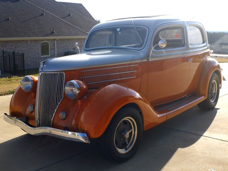Starting in 1935 the Model 48 was introduced by Ford and from then received an annual cosmetic refresh before being completely redesigned for 1941. The combination of looks and price caused sales to soar ahead of their rivals with 820,000 sold just in 1935. This 1936 Ford 2 Door Sedan is an all steel car that was transformed into a street rod over the course of a two and a half year build. It was designed and assembled by a team of professional race car specialists so you know it was done right. The body is all rust free and the fenders/running boards are all steel as well which you don't see often even on steel body cars. The paint is a very clean two tone combination of Tangelo Orange and Platinum Silver. It has beautiful front/rear chrome bumpers and front grill. The sides of hood are nicely louvered and fitted with very classy looking trim pieces. Along the middle of the hood is trim as well with a V8 emblem on the nose. Another unique feature is the vinyl insert on the roof which is very nicely done. The glass is in good condition throughout and it has a working windshield wiper in front of the driver. The car has a great stance and rides on a set of 15 inch Rocket Salt Flat wheels with knock off style center caps and BF Goodrich Radial T/A tires (215/65/15 - front, 255/70/15 - rear).