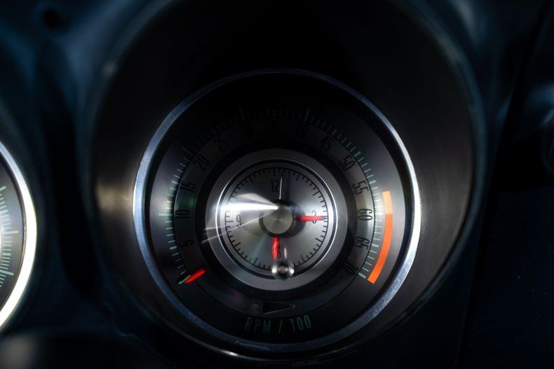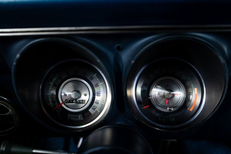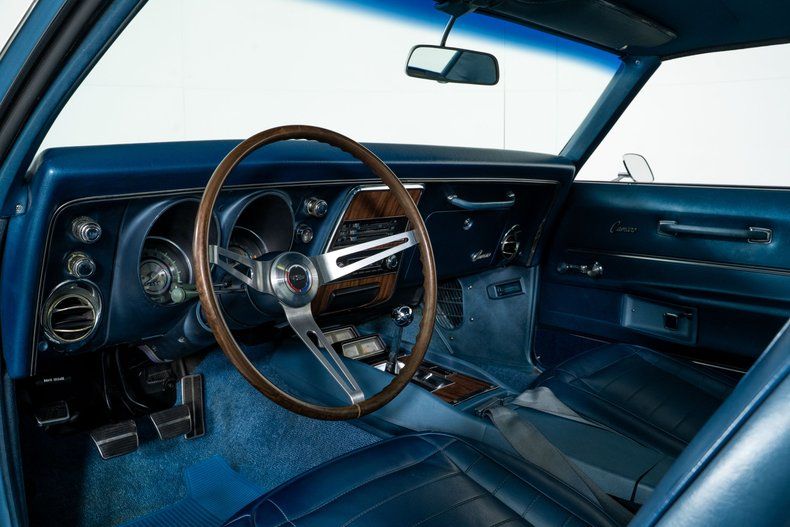 Finished in striking Grotto Blue with a white nose stripe, this 1968 Chevy Camaro has a bold, aggressive presence that stands out immediately. The blue vinyl interior features bucket seats, a center console with gauges, and a tilt steering wheel, creating a cockpit that feels purpose-built for spirited driving. Power front disc brakes add confidence, while the 14-in front and 15-inch rear Rally wheels wrapped in new BF Goodrich Radial T/A tires give the car a proper stance.