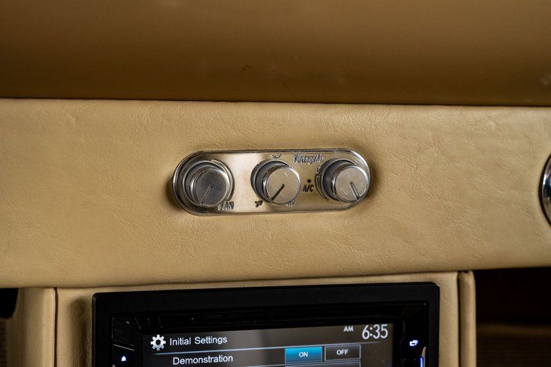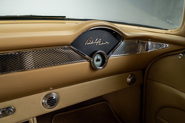 Open the door and you step into something much more upscale than anything Chevrolet could have imagined in 1955. Custom tan leather, plush buckets, and a full-length console set the tone, with the console housing the power window switches, integrated cupholders, and a useful storage compartment. Dakota Digital VHX gauges anchor the dash, and modern air conditioning keeps the cabin comfortable without disturbing the custom look. A modern JVC touchscreen handles audio and Bluetooth, offers full streaming capabilities, and is SiriusXM ready for longer drives. A Flaming River Waterfall wheel sits on a polished tilt column, paired with a Lokar shifter that fits the car's modern-driver feel. The trunk didn't get skipped either, finished cleanly so the whole interior feels cohesive front to back.