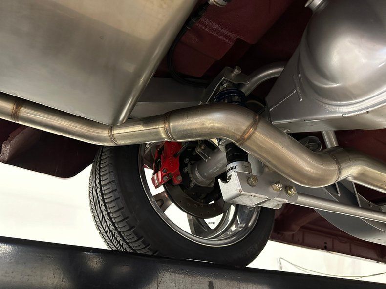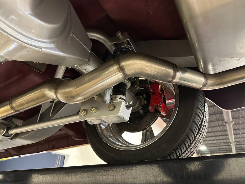 Underneath, the original frame was traded for a full Roadster Shop Fast Track chassis built around boxed rails, Corvette hubs and spindles, coilover suspension, and a four-bar rear that carries a Strange 9" with Positraction. The 4L70E automatic keeps the car friendly on the street, while power rack-and-pinion steering and a 1.25" sway bar give it sharp, predictable response. Stopping is handled by four-wheel Wilwood discs with twenty pistons working drilled and slotted rotors, and the Borla exhaust uses large-diameter stainless tubing to give the LS a clean, aggressive voice. Everything sits on polished 18-inch Coys wrapped in Michelin and Nankang rubber, giving the car a planted stance that fits the rest of the build.
