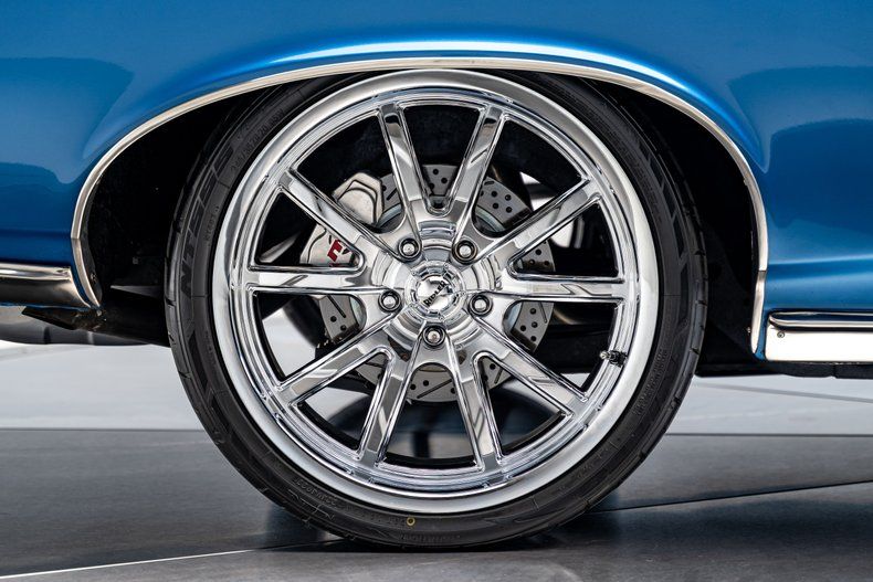 Finished in a vivid blue hue closely resembling Pontiac's Barrier Blue, the body keeps its traditional lines and signature stacked headlights but adds subtle modern touches that set it apart. The panels are straight and clean, with factory-style brightwork, polished bumpers, and tight fitment throughout. LED headlights with blue-illuminated halo rings give the front end a bold signature when the parking lights are on, while LED taillights complete the update out back. The stance is aggressive yet tasteful, achieved through 18-inch front and 20-inch rear chrome Ridler 650 wheels wrapped in Nitto NT555 G2 tires that fill the arches perfectly.