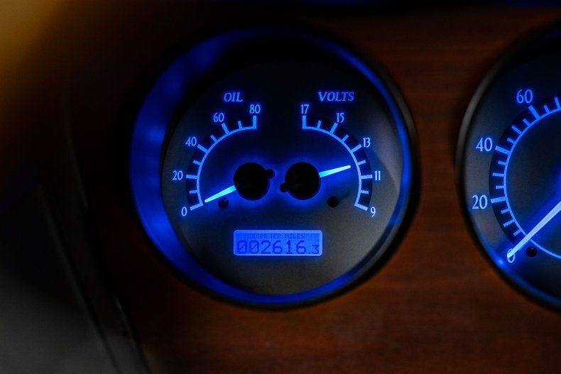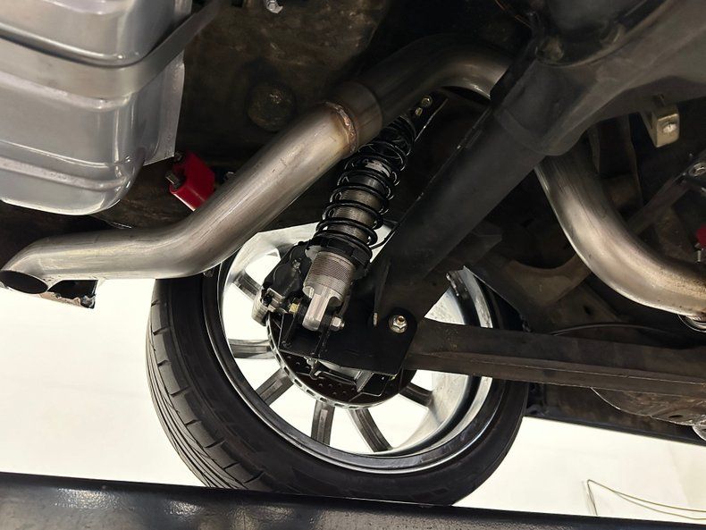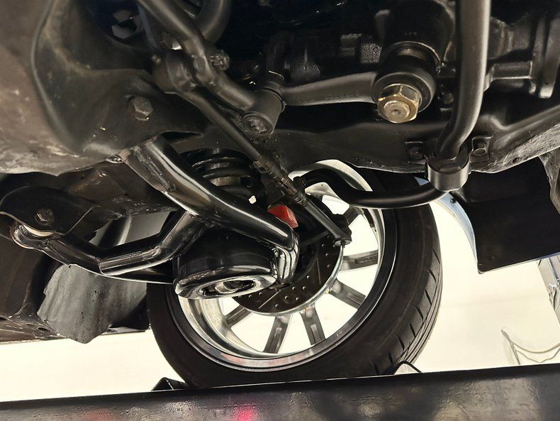 Power comes from a 6.0L LS crate engine sourced from The Hot Rod Company. The iron block is topped with CNC-ported aluminum heads and a FiTech electronic fuel injection system featuring a FiTech intake manifold and throttle body. The engine is finished in an attractive blue hue that recalls classic Pontiac mills, contrasting with black hardware, billet details, and a show-grade Carbon X brake booster featuring a carbon-fiber shell and exposed fasteners. A billet CVF accessory drive ties it all together. Power runs through a Tremec T56 six-speed manual transmission to a 10-bolt rear axle with 3.23 gears and Positraction. The chassis features tubular control arms, Aldan coilover shocks, and MP four-wheel power disc brakes with drilled and slotted rotors, bringing precise handling and confident braking to match its muscle. Power steering keeps it driver-friendly.