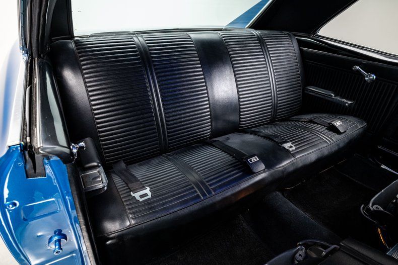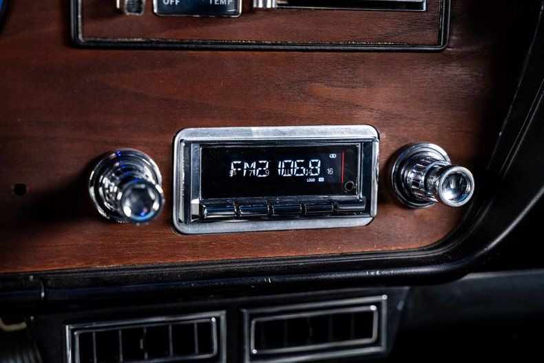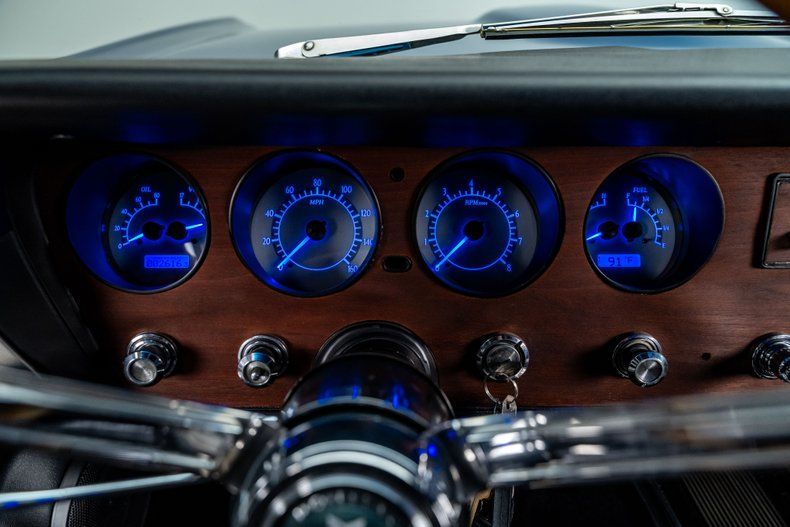 Inside, the car strikes a balance between classic GTO design and modern comfort. Restored black vinyl upholstery and stainless trim preserve the vintage aesthetic, while Dakota Digital blue-lit gauges and a cue-ball shifter bring a subtle performance edge. A Custom Autosound stereo with Bluetooth, a modern Kicker amplifier, and Kicker speakers provide updated sound, and the cabin stays cool thanks to modern air conditioning. The three-spoke wood-rim steering wheel, stainless console trim, and clean stitching remind you this is still a GTO.