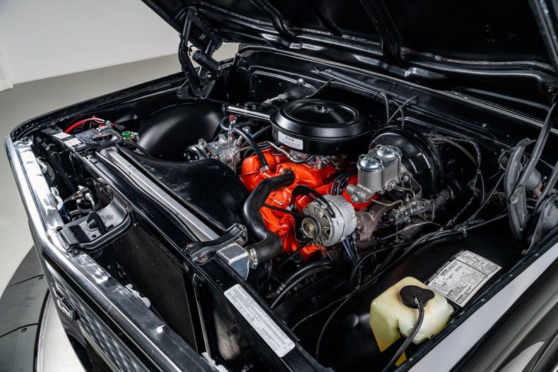 The body presents with clean, straight sheet metal and consistent panel alignment throughout. The black finish lays down with deep gloss across the hood, doors, and quarters, giving the truck a crisp, finished look under studio lighting. Bright trim and glass show well and give the exterior a clean perimeter. Sitting tall on 15" rally wheels wheels wrapped in 33x10.50 BFGoodrich Mud-Terrain tires, The stance is tall, purposeful, and proportioned the way these trucks should be. The black and red combination works perfectly here. It is a timeless color pairing that never goes out of style, whether it is on a muscle car, a hot rod, or a classic 4x4 like this.
