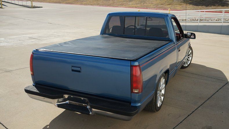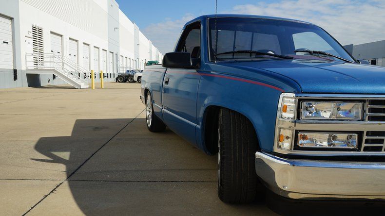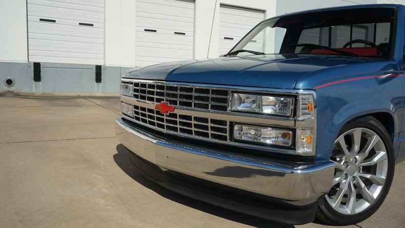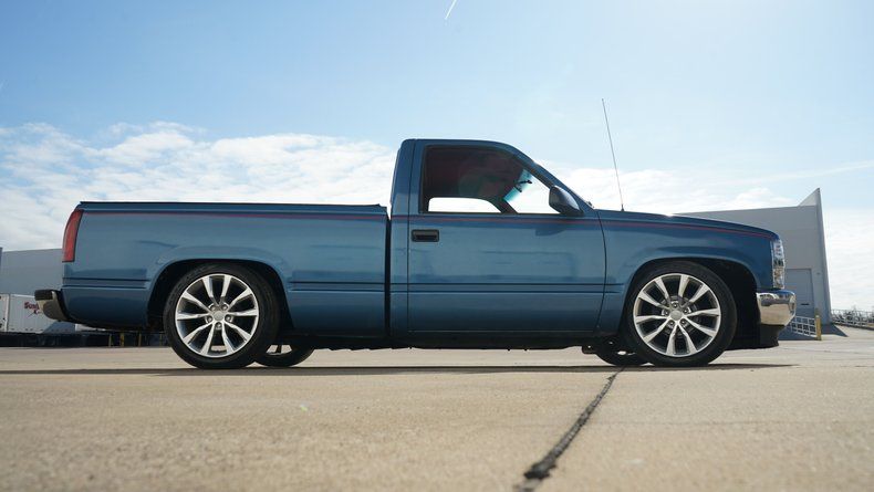 Exterior & Presence Finished in a striking Ice Blue paint, this C1500 catches the light beautifully and is accented by a subtle red pinstripe that runs the length of the body, adding a touch of custom flair. The truck sits low and lean thanks to a lowered suspension, giving it that unmistakable ""Street Truck"" silhouette. Filling out the wheel wells is a set of modern, oversized multi-spoke alloy wheels that provide a perfect contrast to the classic square-body lines. The chrome front bumper and grille remain bright, framing the iconic red Chevy bowtie. Custom TriFold Bed Cover conceals a bedlined truck bed!