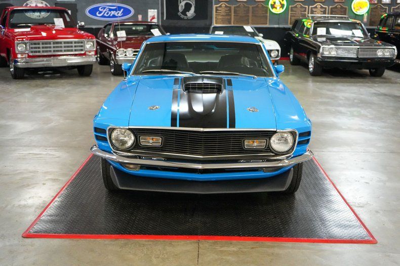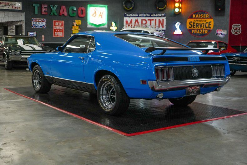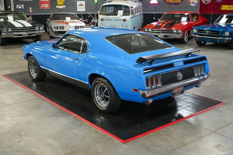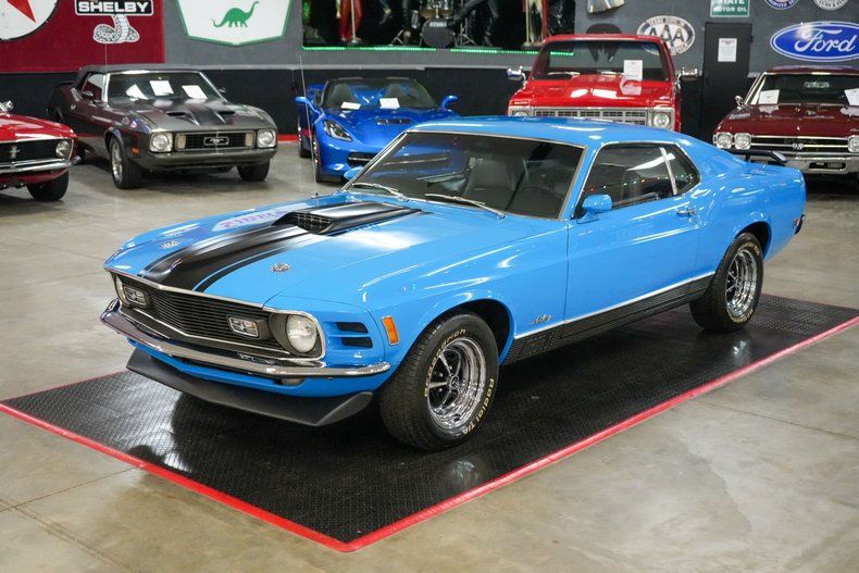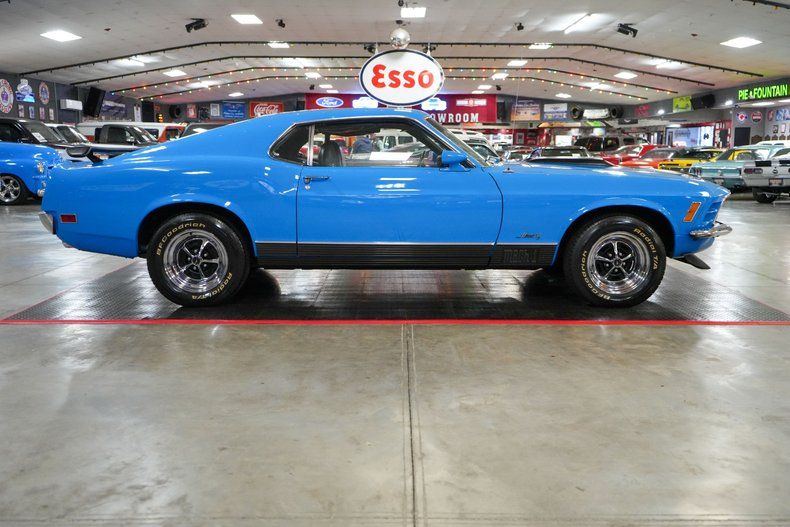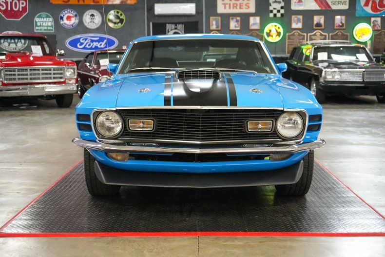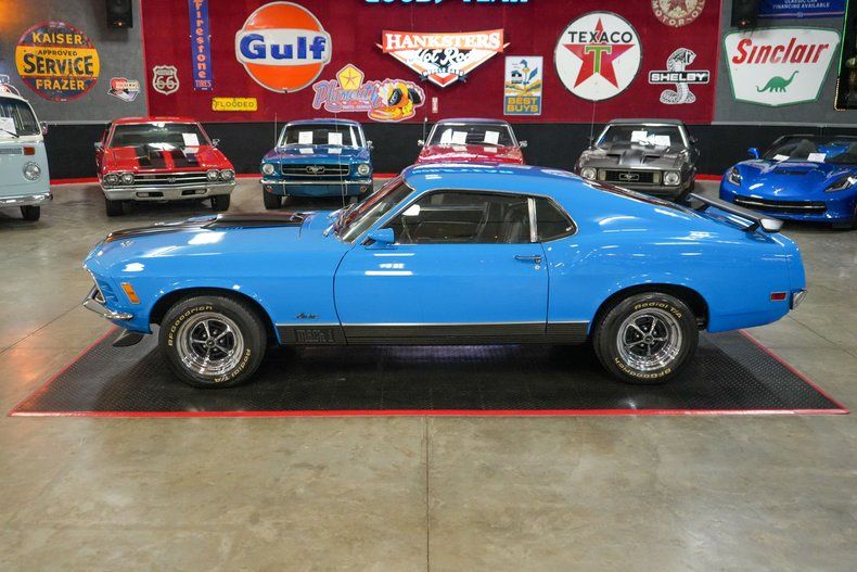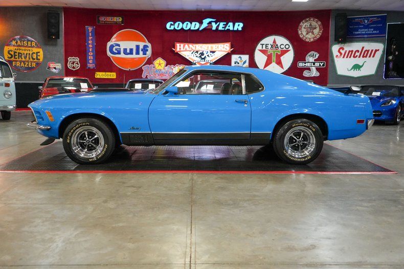 This 1970 Ford Mustang Mach 1 Fastback captures the spirit of American muscle with a Ford 351 Cleveland V8 paired to a Ford FMX 3-speed automatic transmission and Ford 9" rear end with 3.00 gears. It features power steering, power brakes, front disc brakes, and rear drum brakes for confident handling. The Autolite 2-barrel carburetor, OEM intake, and belt-driven cooling fan keep things factory correct under the hood. Inside, the black vinyl interior offers vintage appeal, while 15" Magnum 500 wheels wrapped in BFGoodrich Radial T/A tires complete the aggressive stance. Finished in striking Grabber Blue with black stripes. THIS VEHICLE QUALIFIES FOR FREE SHIPPING AND A WARRANTY!!