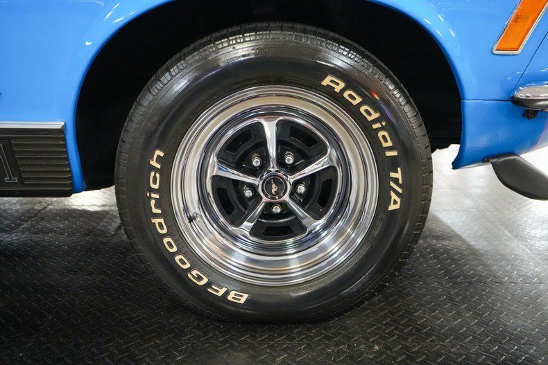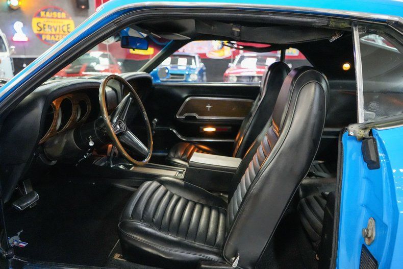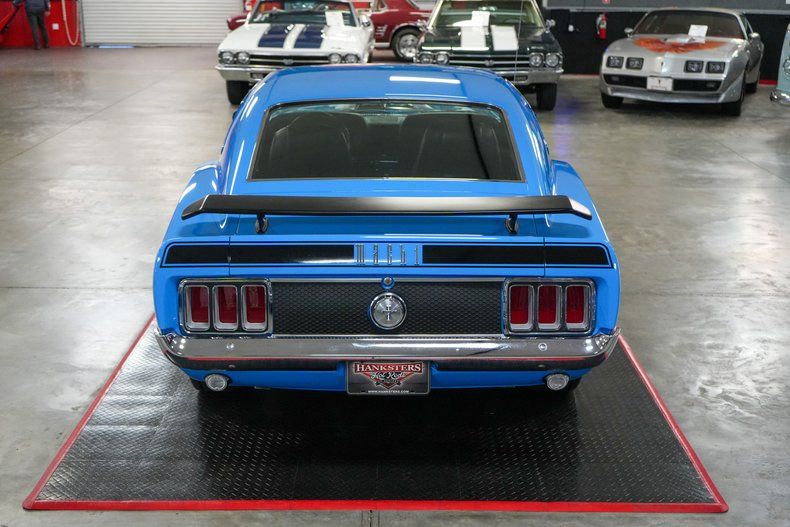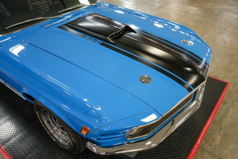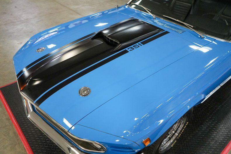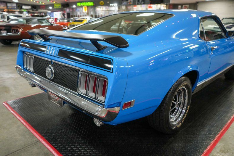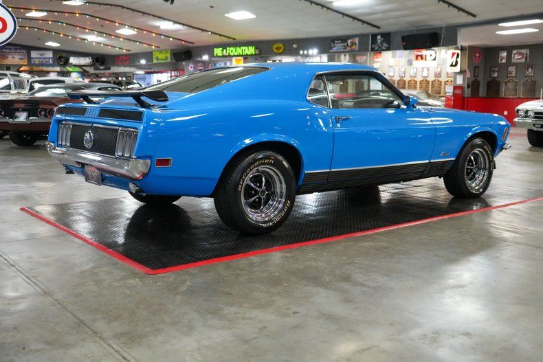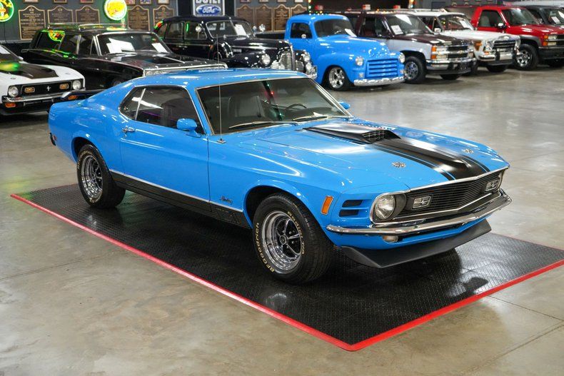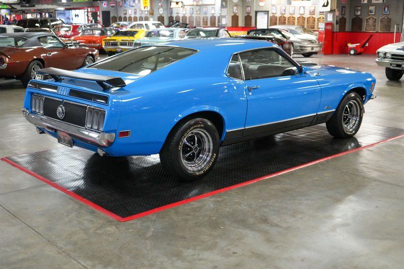 This 1970 Ford Mustang Mach 1 Fastback captures the spirit of American muscle with a Ford 351 Cleveland V8 paired to a Ford FMX 3-speed automatic transmission and Ford 9" rear end with 3.00 gears. It features power steering, power brakes, front disc brakes, and rear drum brakes for confident handling. The Autolite 2-barrel carburetor, OEM intake, and belt-driven cooling fan keep things factory correct under the hood. Inside, the black vinyl interior offers vintage appeal, while 15" Magnum 500 wheels wrapped in BFGoodrich Radial T/A tires complete the aggressive stance. Finished in striking Grabber Blue with black stripes. THIS VEHICLE QUALIFIES FOR FREE SHIPPING AND A WARRANTY!!