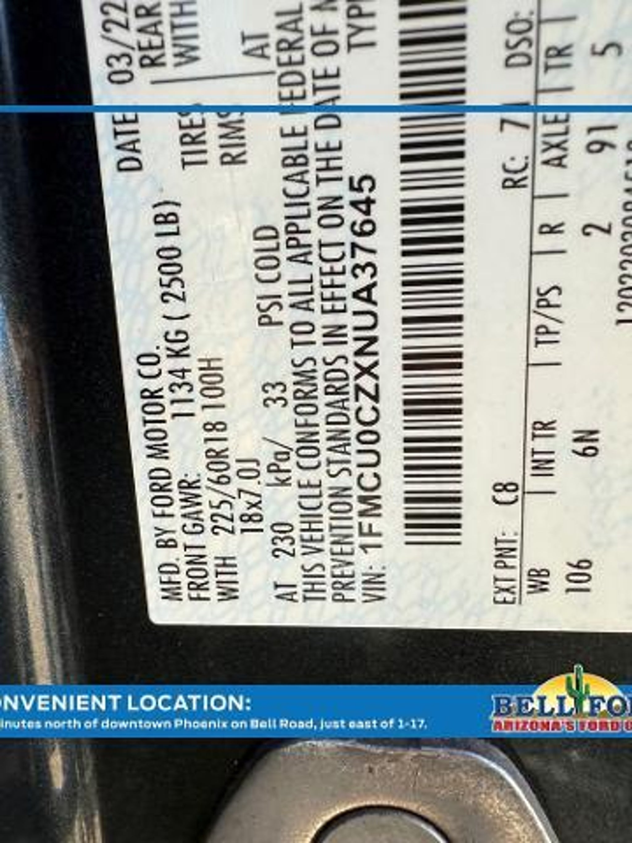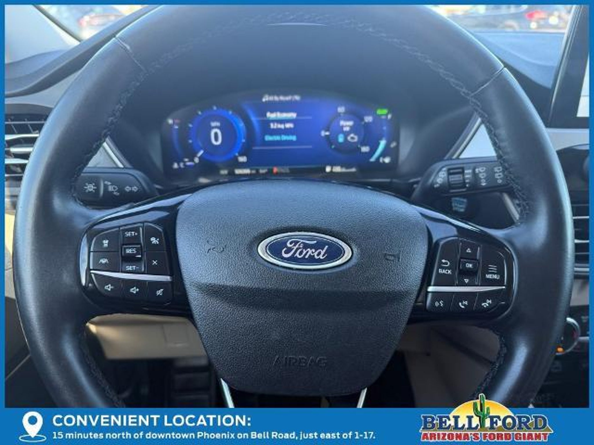 Bell Ford has been proudly serving Phoenix, Arizona for 40 years. Conveniently located on the southeast corner of the i17 and Bell Road. Visit us online today at www.bellford.com This 2022 Ford Escape SEL is a remarkable vehicle packed with impressive features that will elevate your driving experience. Let's explore what makes this Escape stand out: ? Technology Package: Hands-Free Foot-Activated Liftgate, Wireless Charging Pad, Instrument Panel with 12.3 Digital Screen, Memory Package, 10-Way Power Driver Seat, B&O Sound System ? Ford Co-Pilot360 Assist : Adaptive Cruise Control with Speed Sign Recognition, Evasive Steering Assist, Voice-Activated Navigation ? Stone Blue Metallic exterior with Black Roof Rack Rails The Escape SEL offers exceptional efficiency, with an EPA-estimated 44 city MPG and 37 highway MPG from its 2.5L iVCT engine and eCVT transmission. This intelligent powertrain delivers a smooth, responsive driving experience while minimizing fuel consumption. Stepping inside, you'll be greeted by a wealth of premium features that elevate the Escape's cabin. The 10-way power driver's seat with memory function ensures a personalized and comfortable driving position, while the heated steering wheel and front seats provide a cozy touch on chilly mornings. The 12.3 digital instrument panel and voice-activated navigation system keep you informed and connected on the go. The Escape SEL also boasts a host of advanced safety technologies through the Ford Co-Pilot360 Assist suite. Adaptive cruise control with stop-and-go functionality, evasive steering assist, and speed sign recognition work together to help you navigate the roads with confidence and ease. As a Ford Blue Certified pre-owned vehicle, this Escape SEL has undergone a rigorous 139-point inspection, ensuring it meets the highest standards of quality and reliability. You'll also enjoy the peace of mind of a transferable warranty, roadside assistance, and 11,000 FordPass Rewards Points to use towards your first maintenance visit. Don't miss the opportunity to experience the exceptional capabilities and premium features of this 2022 Ford Escape SEL. Visit us at Bell Ford today and let us show you why this vehicle is the perfect choice for your next adventure. For any other questions, please contact us at 602.281.4080
