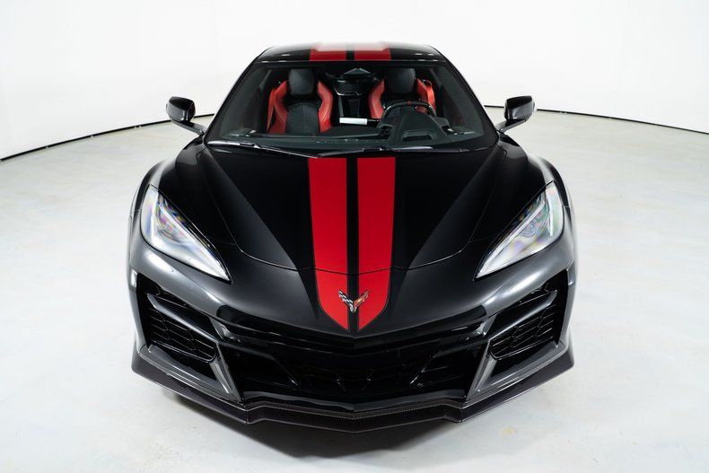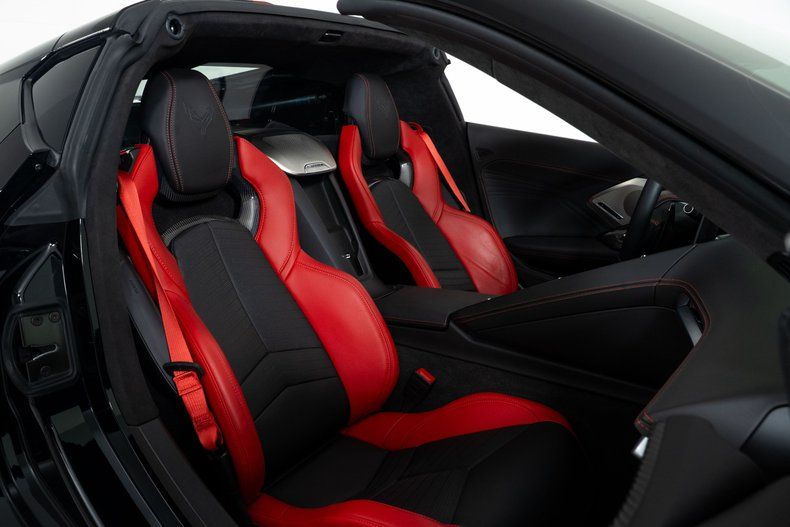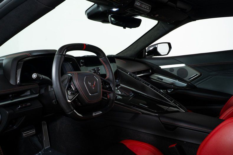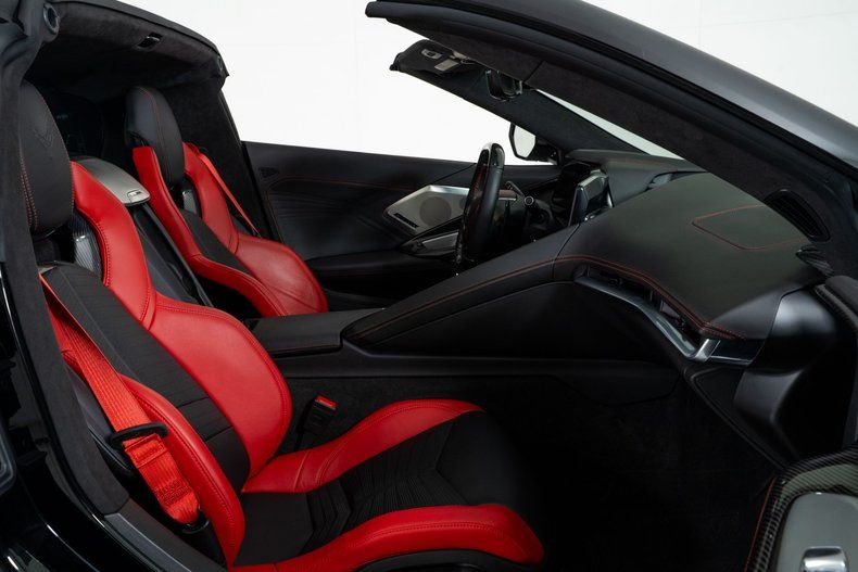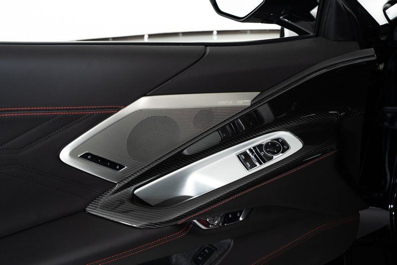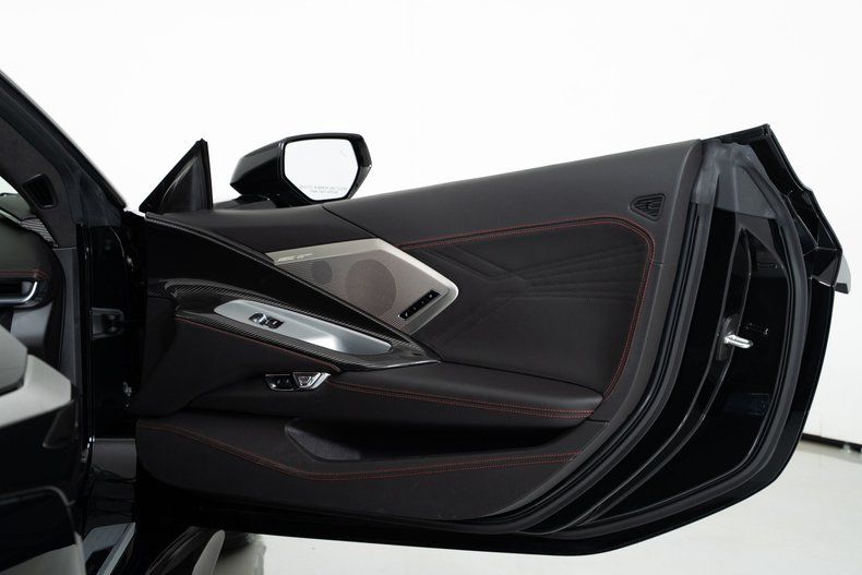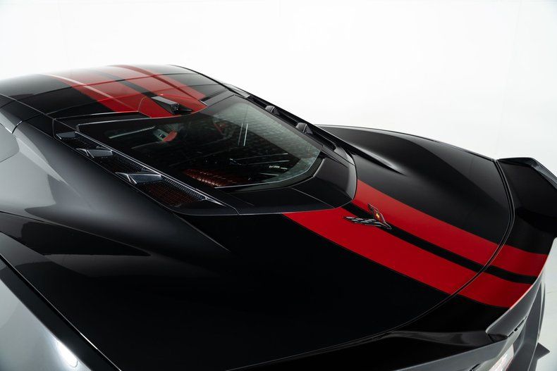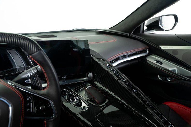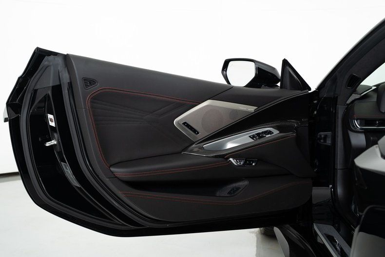 Finished with Edge Red full-length dual racing stripes, this black Corvette has a menacing, purposeful look. Inside, the Jet Black interior with Adrenaline Red accents is paired with the 3LZ package, adding a custom leather-wrapped instrument panel, heated steering wheel, sueded microfiber trim, and two-tone Napa leather GT2 seats with heating and ventilation. Carbon fiber trim and paddle shifters reinforce the performance-focused feel.