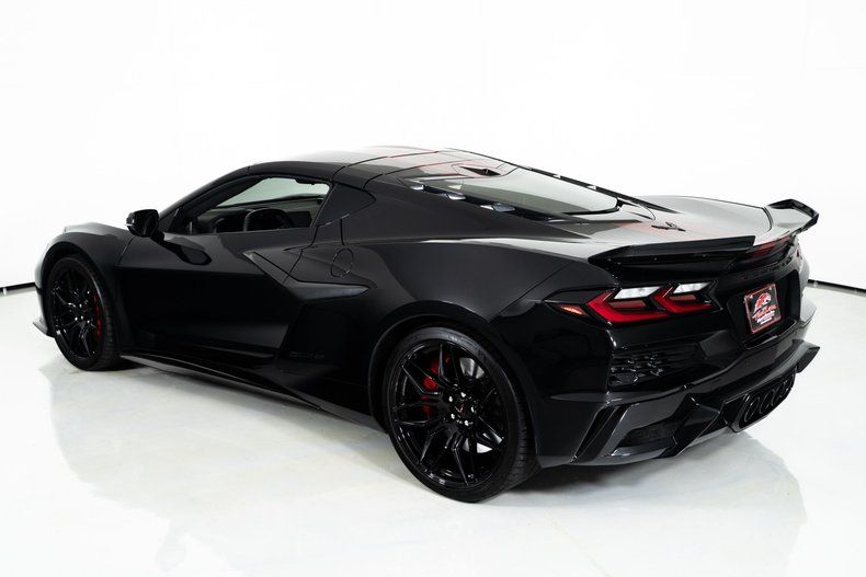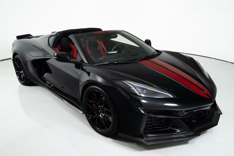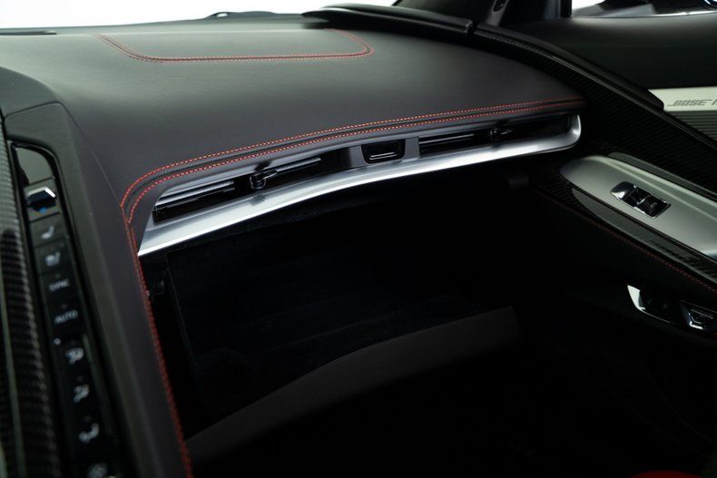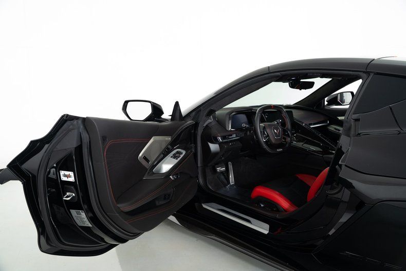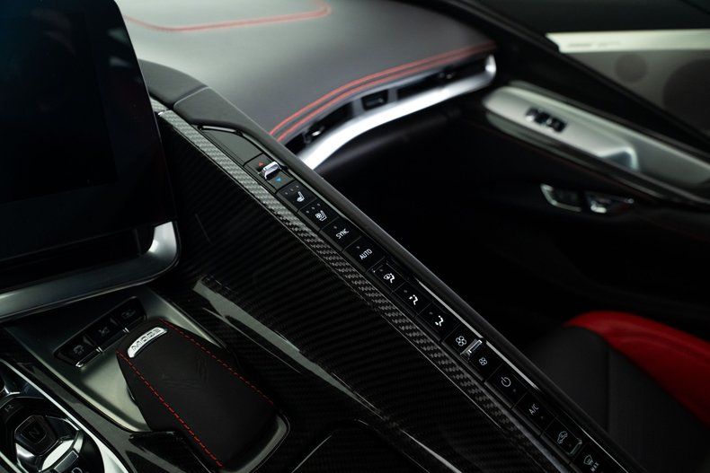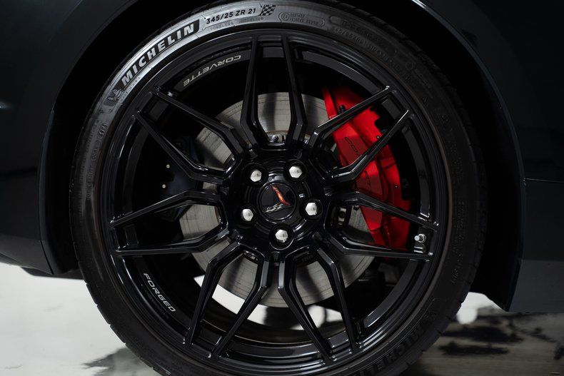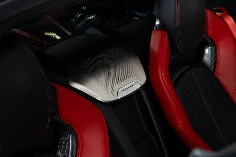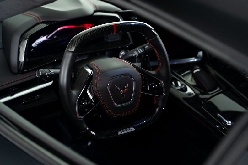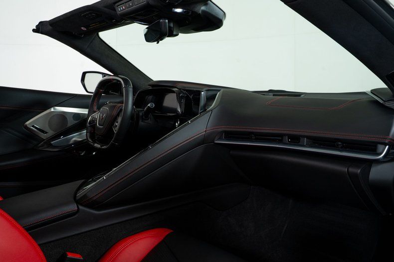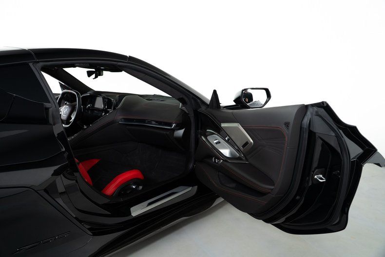 Finished with Edge Red full-length dual racing stripes, this black Corvette has a menacing, purposeful look. Inside, the Jet Black interior with Adrenaline Red accents is paired with the 3LZ package, adding a custom leather-wrapped instrument panel, heated steering wheel, sueded microfiber trim, and two-tone Napa leather GT2 seats with heating and ventilation. Carbon fiber trim and paddle shifters reinforce the performance-focused feel.