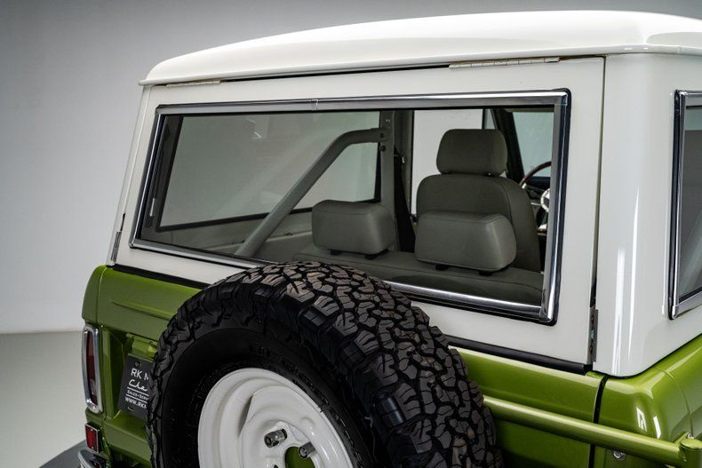 Finished in Code "U" Limestone Green with a contrasting white hardtop, this Bronco presents with crisp, era-correct color and deep metallic finish throughout. The uncut body preserves the original compact stance, while details like the white grille, chrome bumpers, factory swing-out tire carrier, and full-size spare reinforce the truck's period-correct character. Panel fit is clean, trim and brightwork have been renewed throughout, and the truck benefits from extensive rust remediation and bare-metal preparation prior to refinishing. Riding on white powder-coated 15" steel wheels wrapped in 30x9.50 BFGoodrich All-Terrain T/A KO2s, aided by a subtle 1" body lift and 2.5" suspension lift, the stance strikes a balance between classic and competent. A chassis-mounted 2" hitch receiver adds light towing capability without detracting from the truck's original profile.