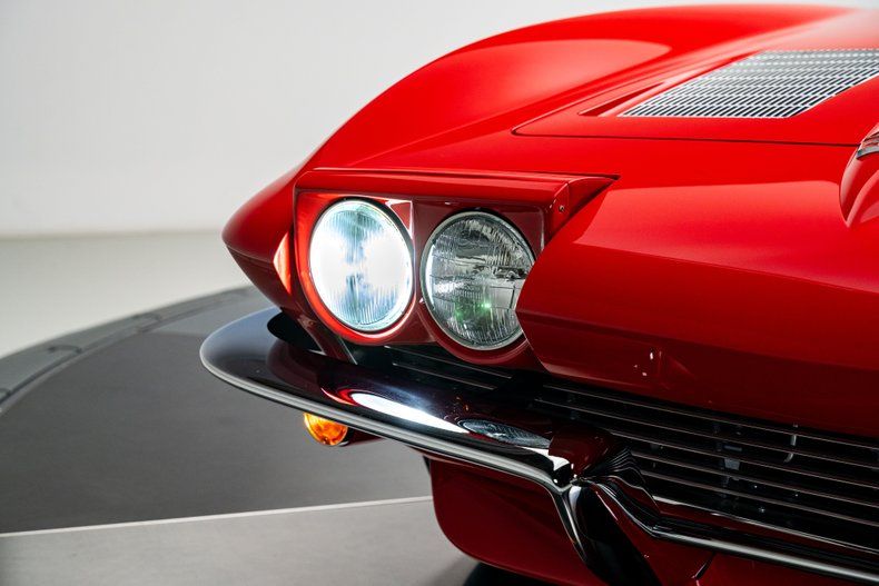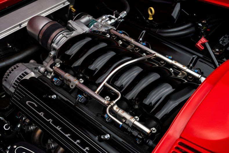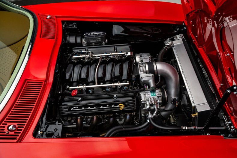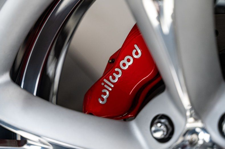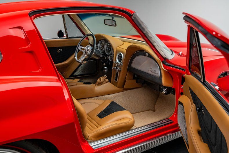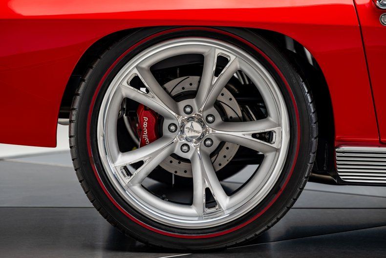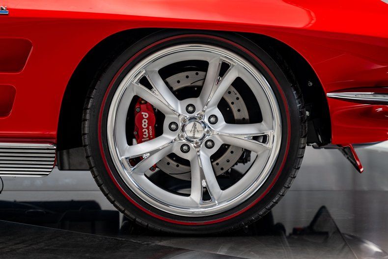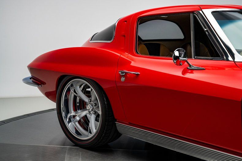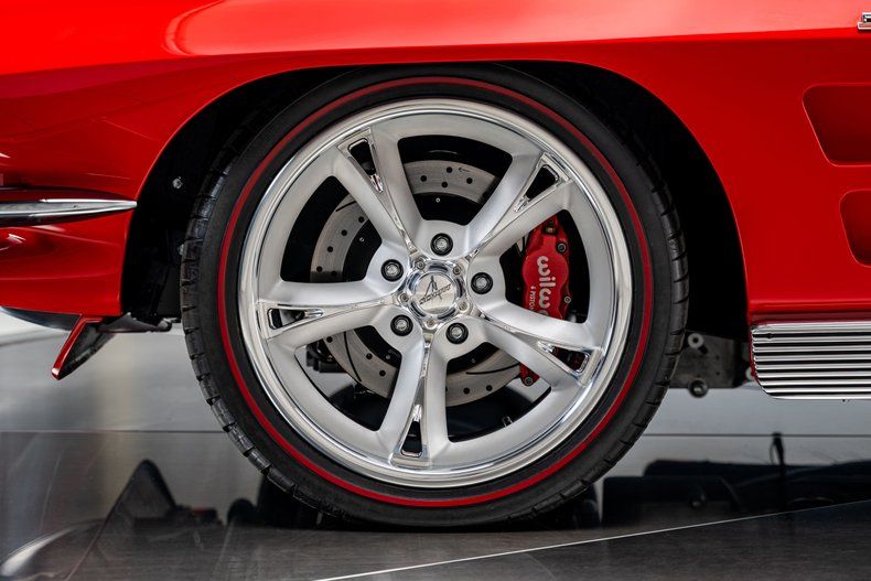 The build began with an original 1963 Split Window Coupe body that was already in excellent condition, providing the ideal foundation for a project of this caliber. Over the course of nearly three years, every surface and structural detail was carefully refined, with extensive research guiding reinforcement of known C2 stress points including the rear tub, inner front fenders, cowl area, and the original toolbox location in the floor. The cowl was fully cleaned up and reworked to house a hidden wiper motor, eliminating visual clutter while retaining full functionality. Finished in Firecracker Red, the exterior presents with exceptional depth and clarity across every panel, polished to a flawless, show-quality finish that highlights the Split Window's dramatic curves and sharp body lines. A subtle detail includes a custom front chin spoiler that enhances visual balance without detracting from the original design. Forged Schott Mach 5 wheels, measuring 18" up front and 20" in the rear are wrapped in 235mm front and 295mm rear Michelin Pilot Sport 4S tires with a custom red stripe.