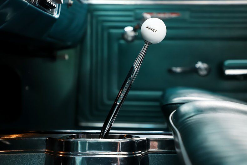 INTERIOR: Inside the door jambs are as slick as the exterior. The weatherstrips and sill plates were also replaced. The Turquoise Morrokide interior adds to this car's unique appeal, that's a color you really don't see often. We were told the upholstery is original! I do know that the door panels and armrests have been replaced and everything else is in remarkable overall condition. The seats don't have any rips or tears. The gauge bezel has really nice wood trim, all the gauges are in wonderful shape, and very easy to read too. It has a working clock, original heater controls and radio. The dash has been beautifully repainted the correct way with a satin finish on the top for glare reduction and a glossy finish on the bottom for more appeal. The kick panels are in excellent condition and the turquoise carpet looks fresh. The deluxe steering wheel looks to be a brand new reproduction. The center console was nicely refurbished and the Hurst 4-speed shifter puts the driver in command of the power.
