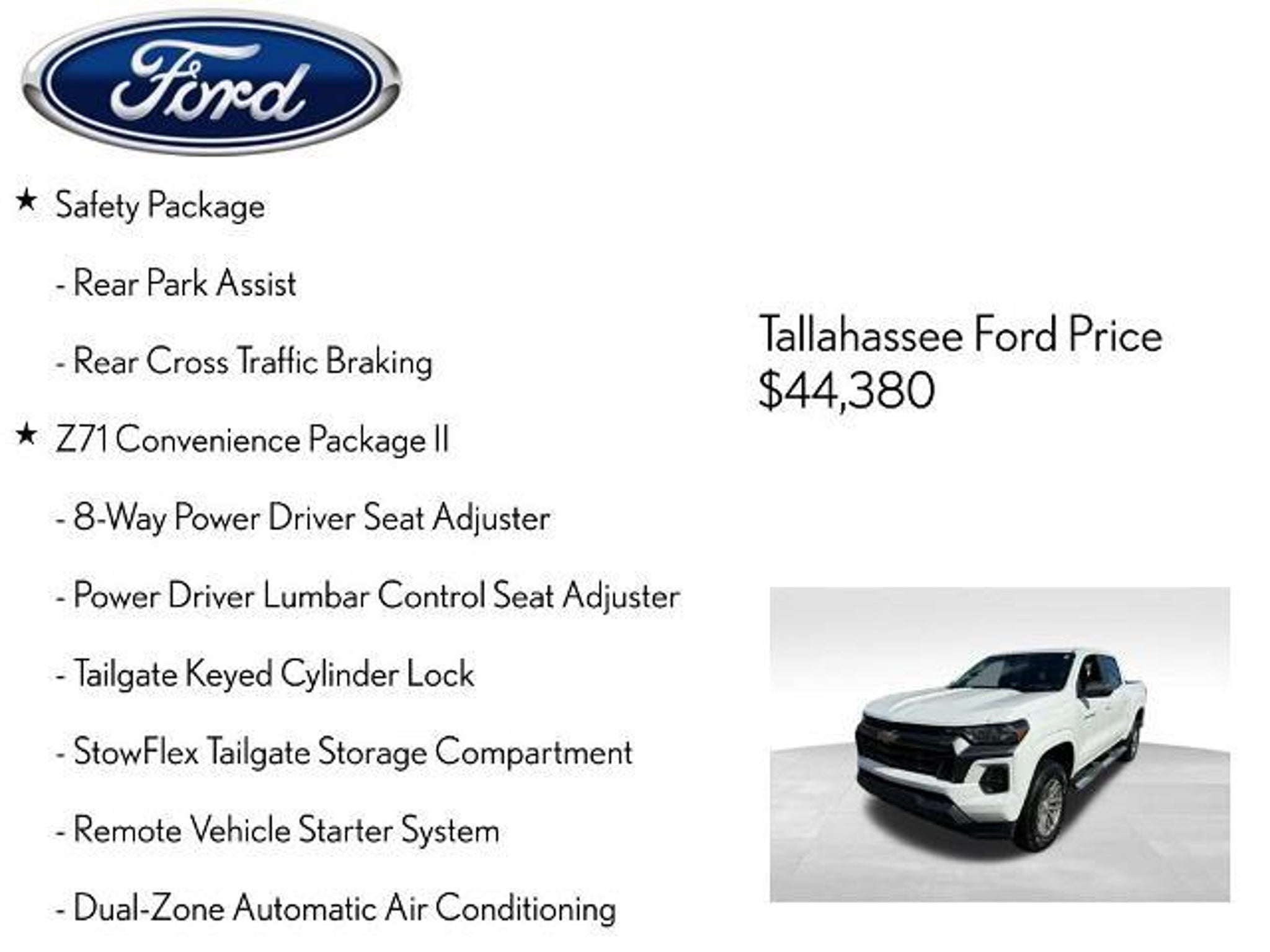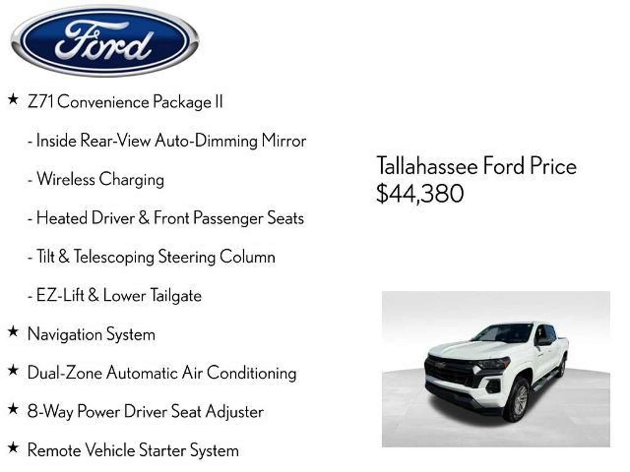 Discover the ultimate driving companion in the 2024 Chevrolet Colorado Z71. This rugged and capable pickup is engineered to conquer any terrain, delivering a driving experience that is both exhilarating and refined. ? Z71 Convenience Package II ? Safety Package ? Navigation System ? Dual-Zone Automatic Air Conditioning ? 8-Way Power Driver Seat Adjuster ? Remote Vehicle Starter System ? Steering Wheel Mounted Audio Controls ? Tilt & Telescoping Steering Column ? Rear Park Assist ? EZ-Lift & Lower Tailgate ? Power Door Mirrors ? Apple CarPlay/Android Auto ? Blind Zone Steering Assist ? Compass ? Inside Rear-View Auto-Dimming Mirror ? Rear Cross Traffic Braking Powered by a potent 2.7L I4 Turbocharged engine delivering 310 horsepower, the Colorado Z71 combines impressive performance with exceptional efficiency, achieving up to 23 MPG on the highway. The 8-speed automatic transmission and 4-wheel drive system ensure seamless power delivery and confident handling, no matter the terrain. Experience the ultimate in comfort and convenience with the Z71 Convenience Package II, which includes dual-zone automatic climate control, an 8-way power driver's seat, heated front seats, and a wireless charging pad. The Safety Package, meanwhile, provides advanced driver-assistance technologies like Blind Zone Steering Assist and Rear Cross Traffic Braking, giving you the confidence to tackle any journey. Distinctive exterior styling, including a black spray-on bedliner and 18-inch alloy wheels, lend the Colorado Z71 a bold and rugged appearance that is sure to turn heads. Inside, the spacious cabin is appointed with premium cloth/Evotex seating and a host of intuitive technology features, ensuring a premium and connected driving experience. Whether you're tackling the daily commute or venturing off the beaten path, the 2024 Chevrolet Colorado Z71 is the ultimate companion for your adventures. Experience the power, capability, and refinement that set this truck apart from the competition. Visit our showroom today and let us demonstrate why the Colorado Z71 is the perfect choice for your next vehicle. The listed online price reflects a $1,000 finance incentive and a $1,000 qualifying retail trade-in incentive; absence of either or both incentives will result in an increase of up to $2,000 to the final sale price.